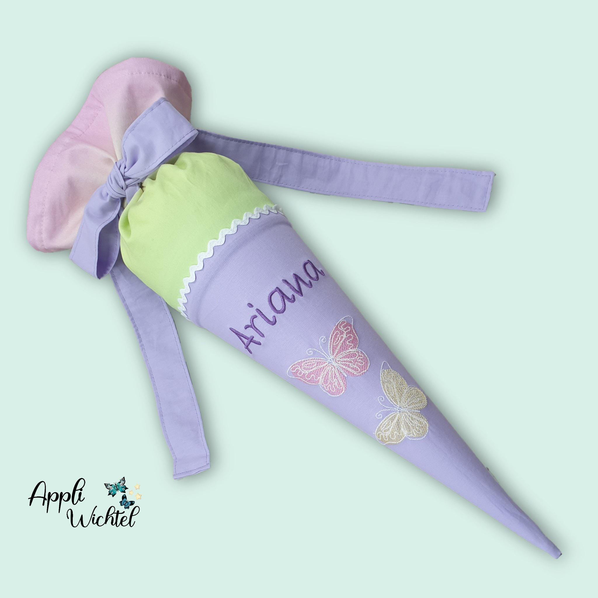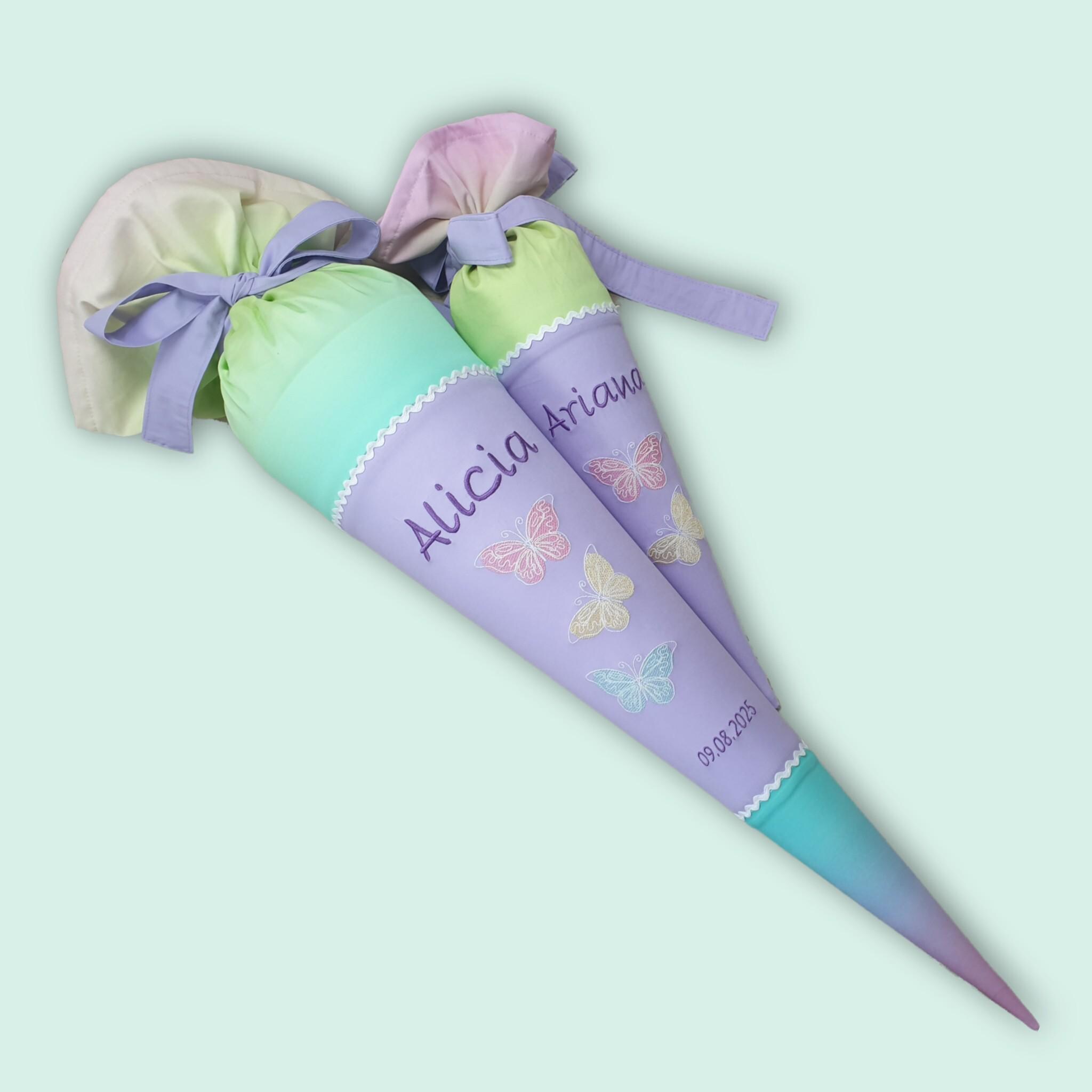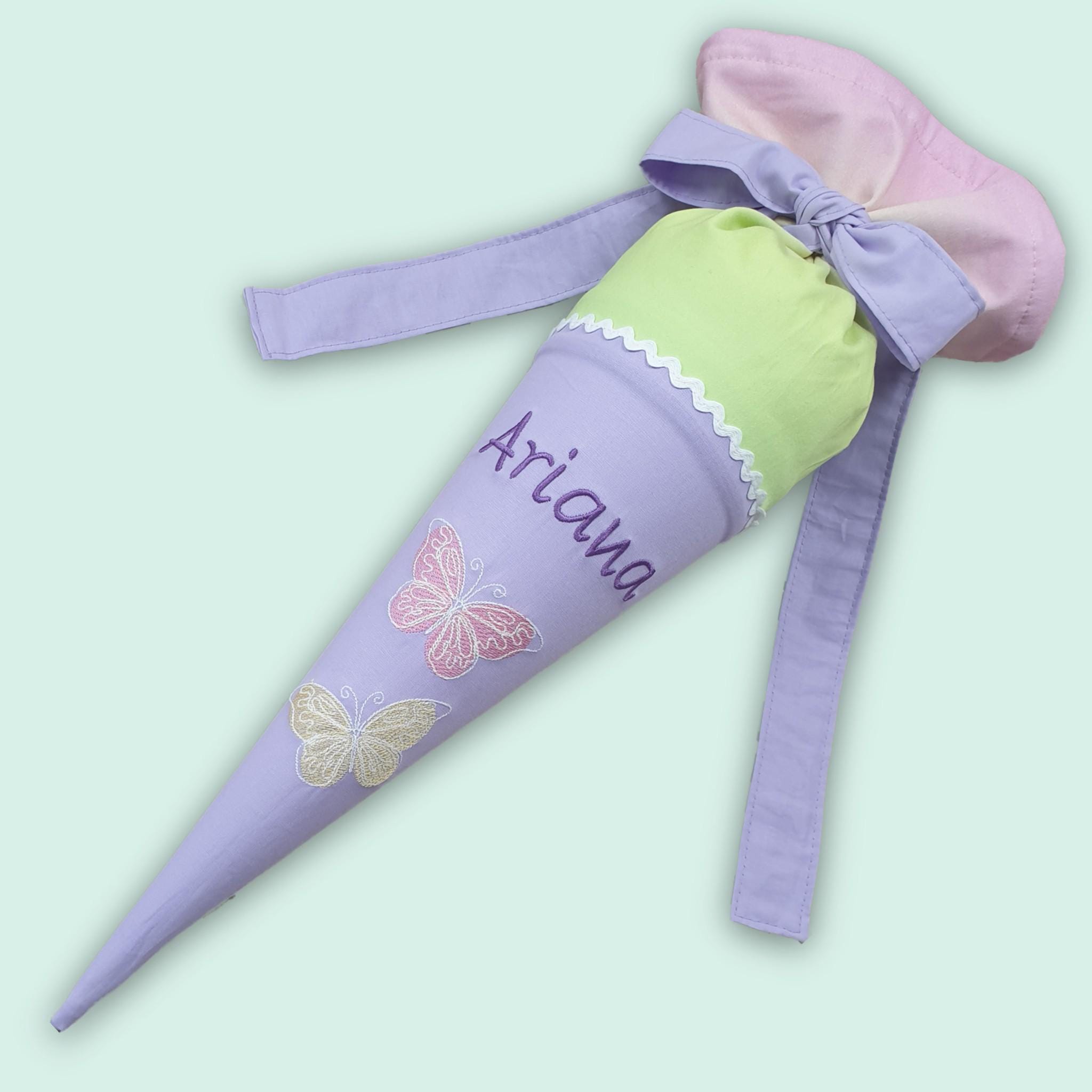 35 cm Geschwistertüte Schmetterlinge und Namen farblich auf den Zaubärwelt Schulranzen abgestimmt.