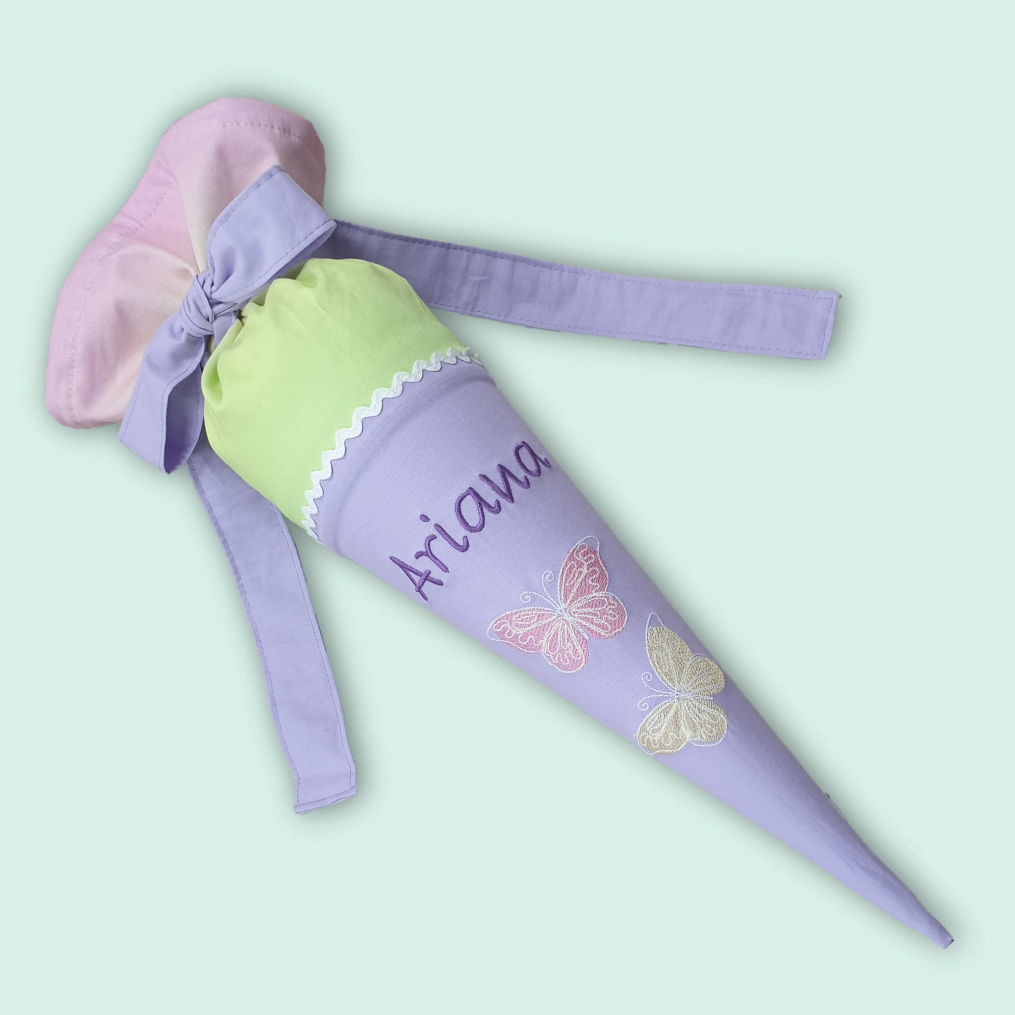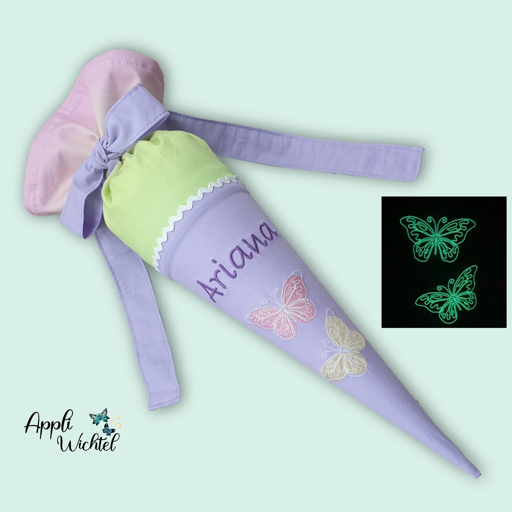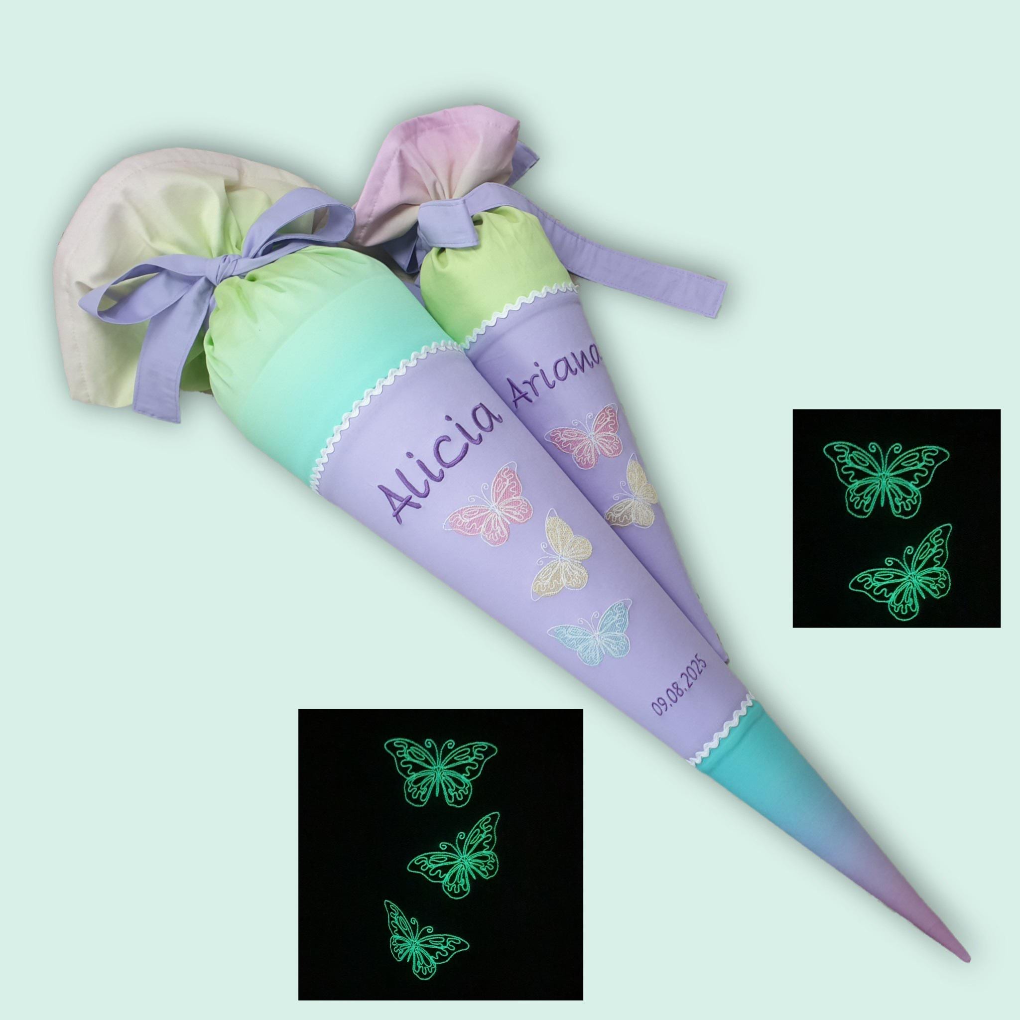 35 cm Geschwistertüte Schmetterlinge und Namen farblich auf den Zaubärwelt Schulranzen abgestimmt.