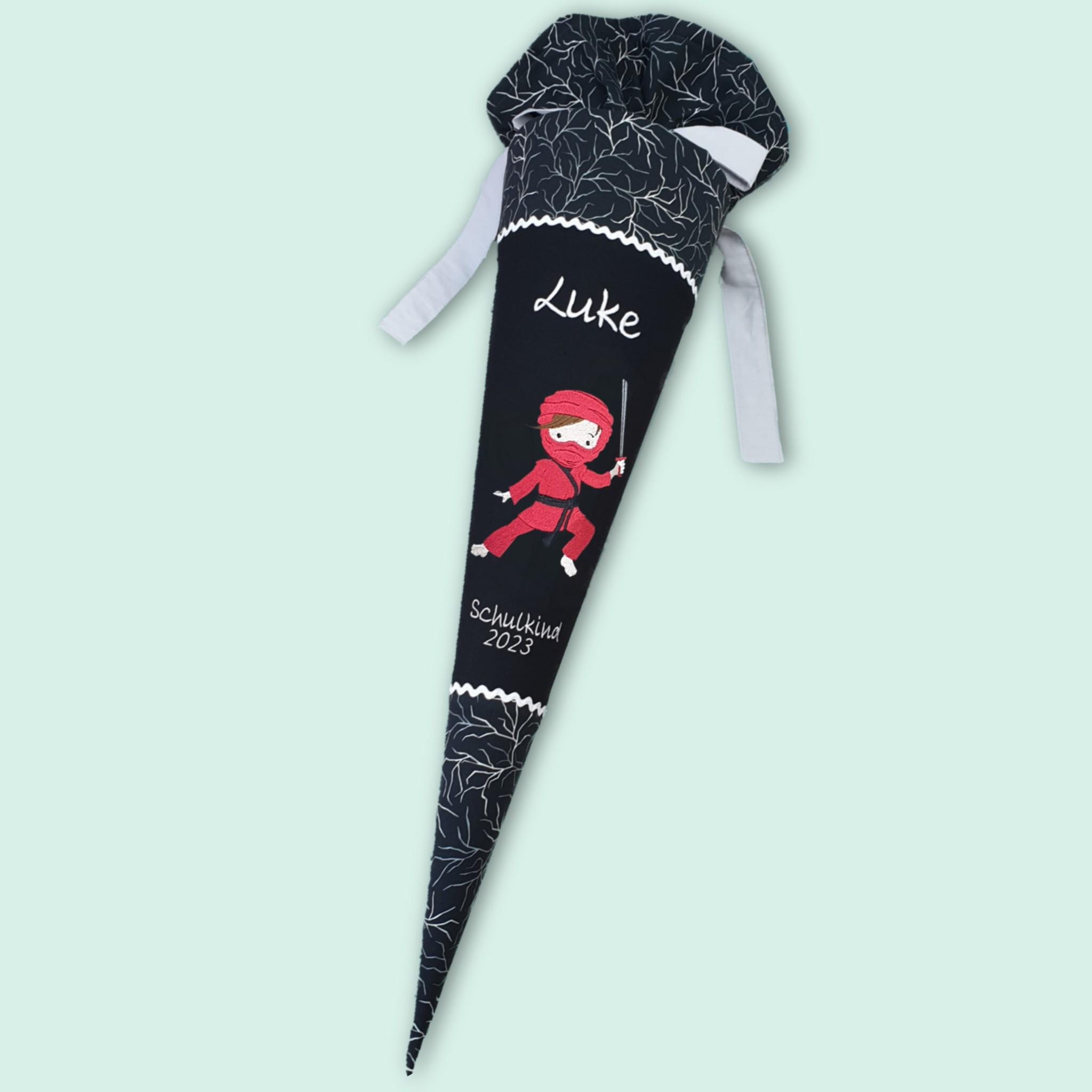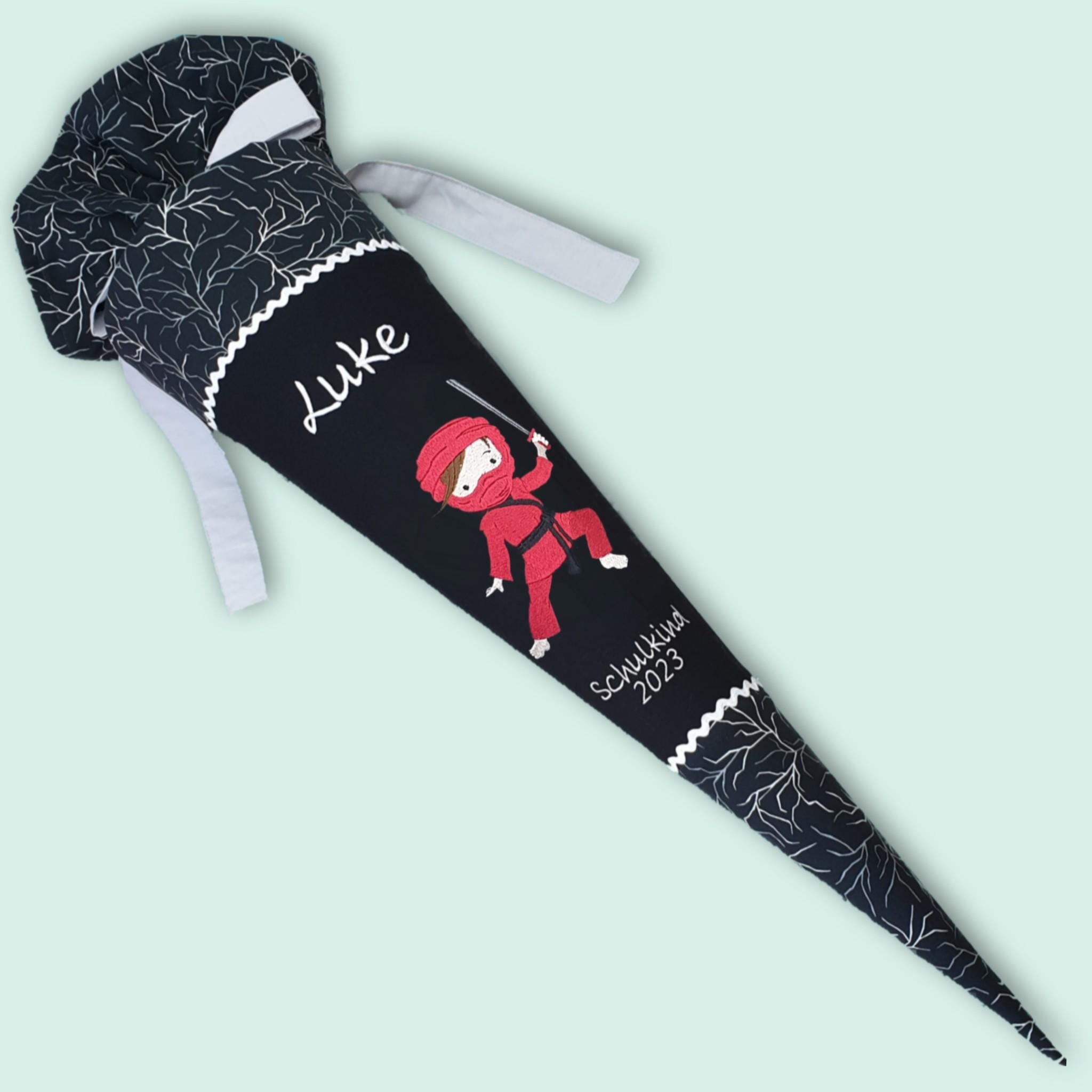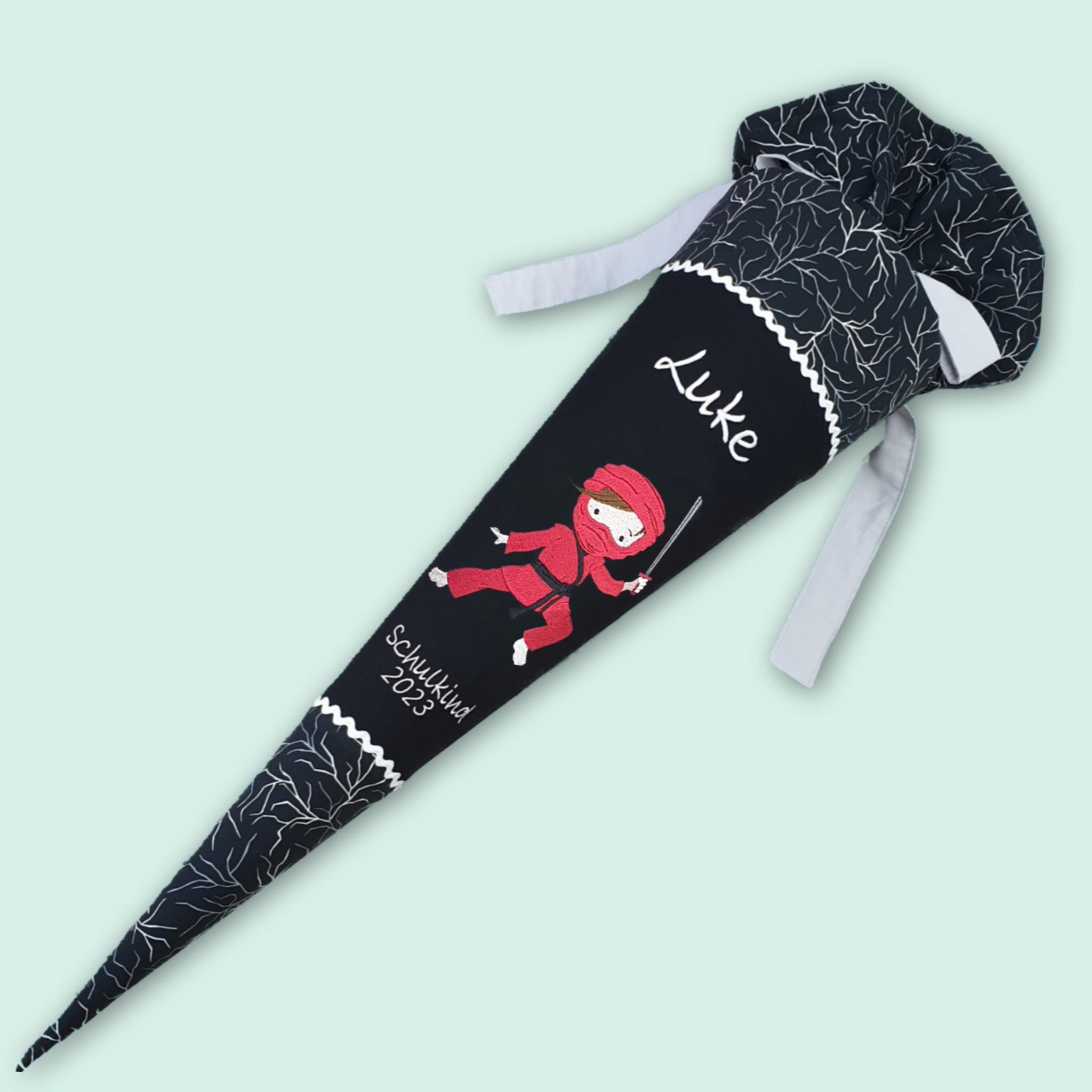 Schultüte mit Ninja und Namen farblich auf den Ergobag Super ReflektBär Glow Schulranzen abgestimmt.