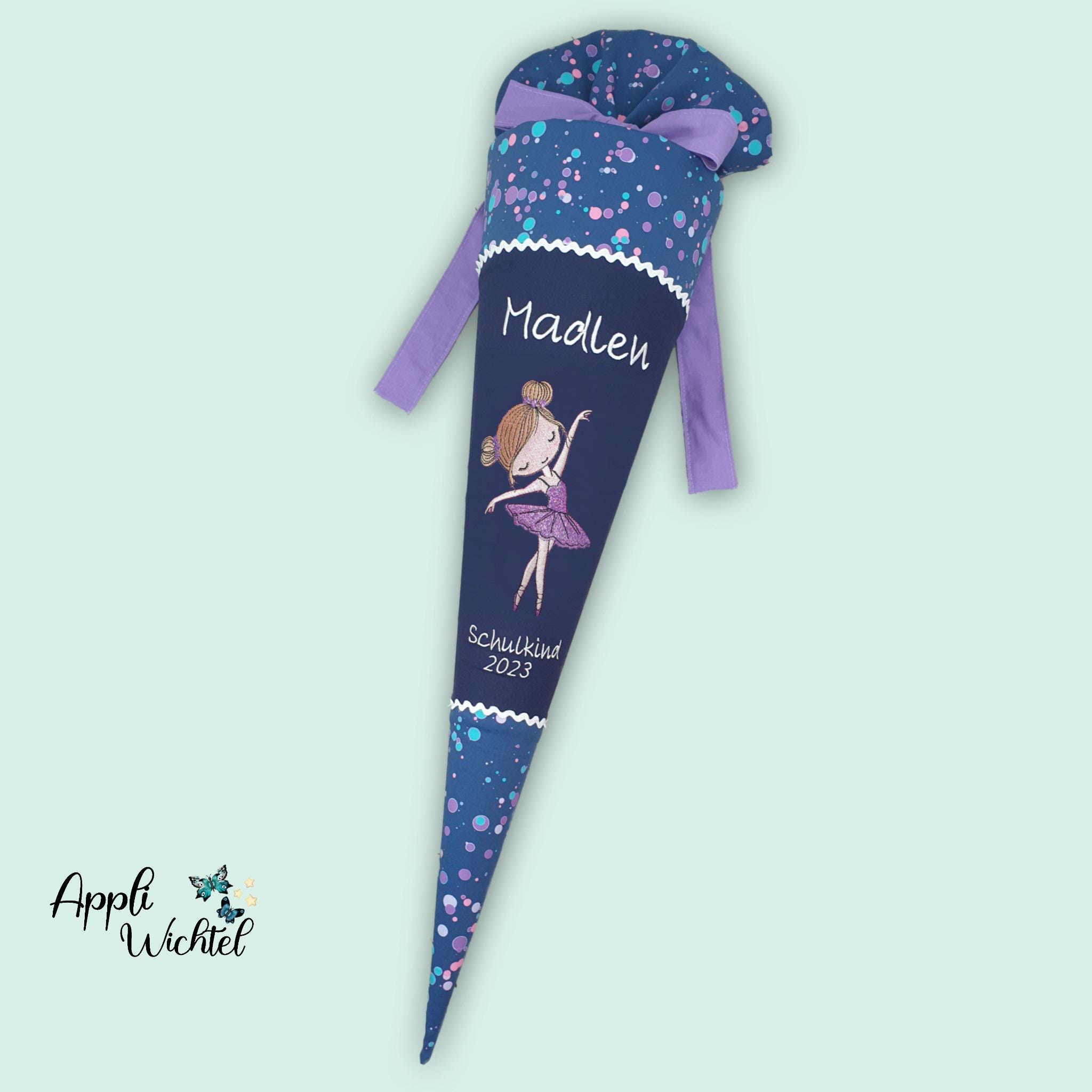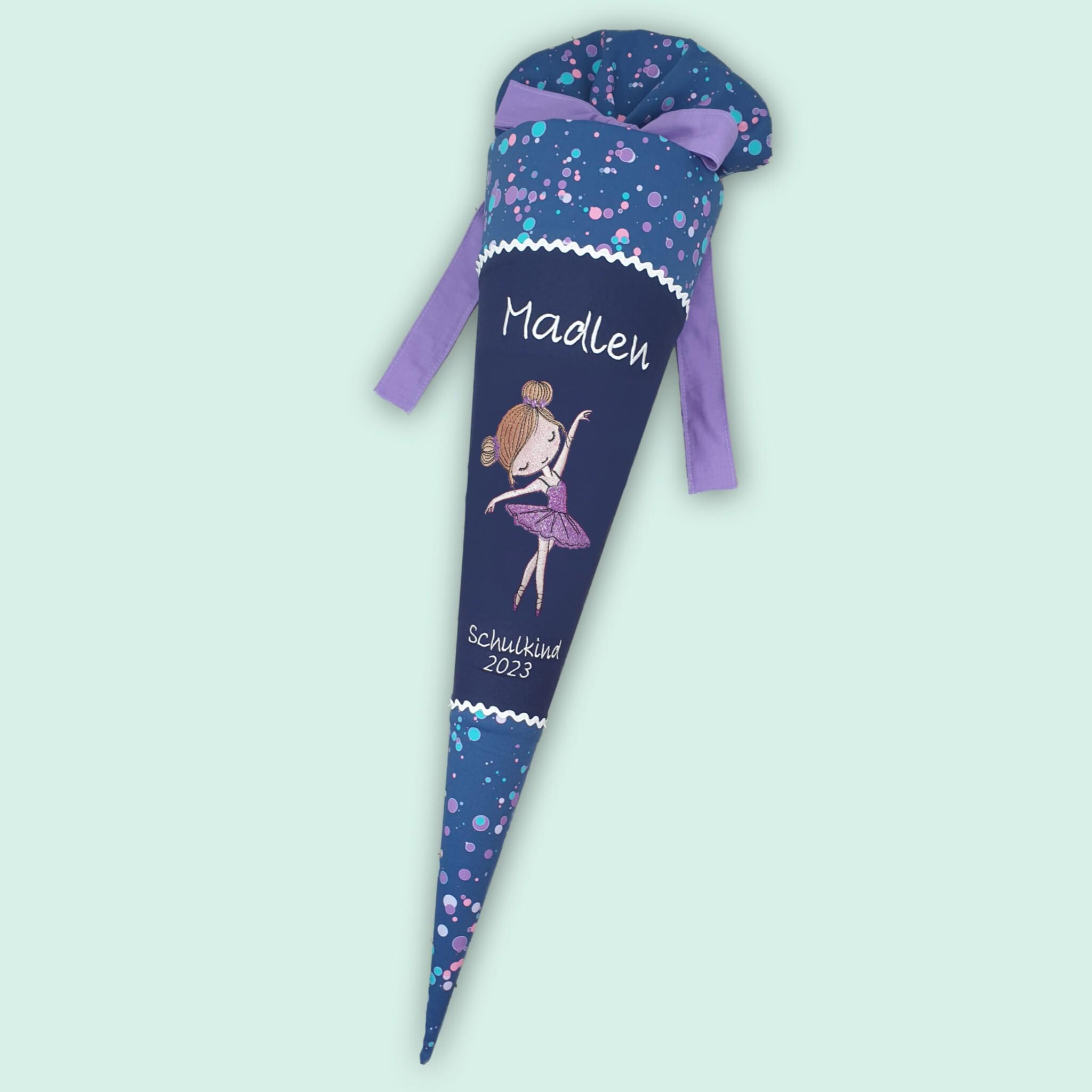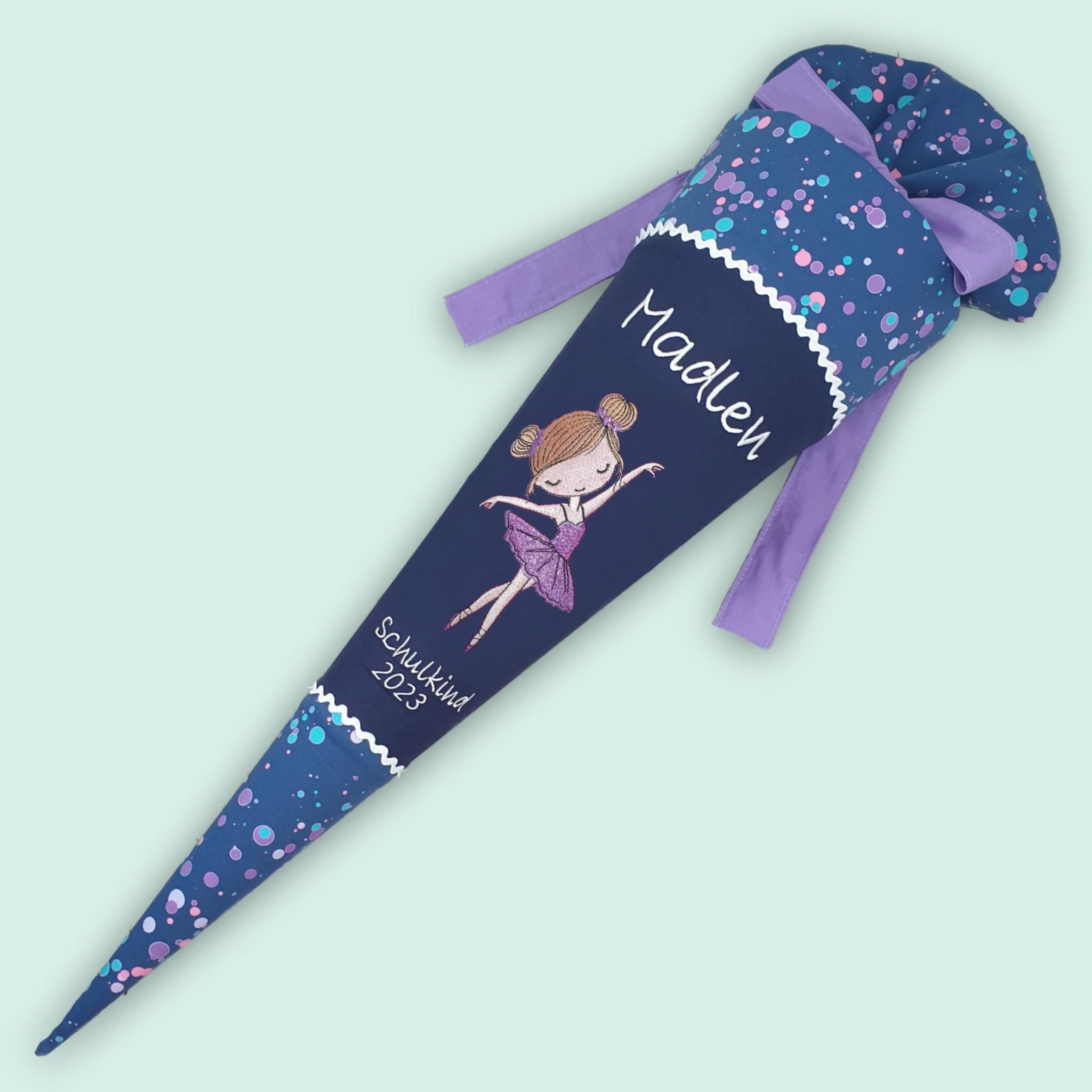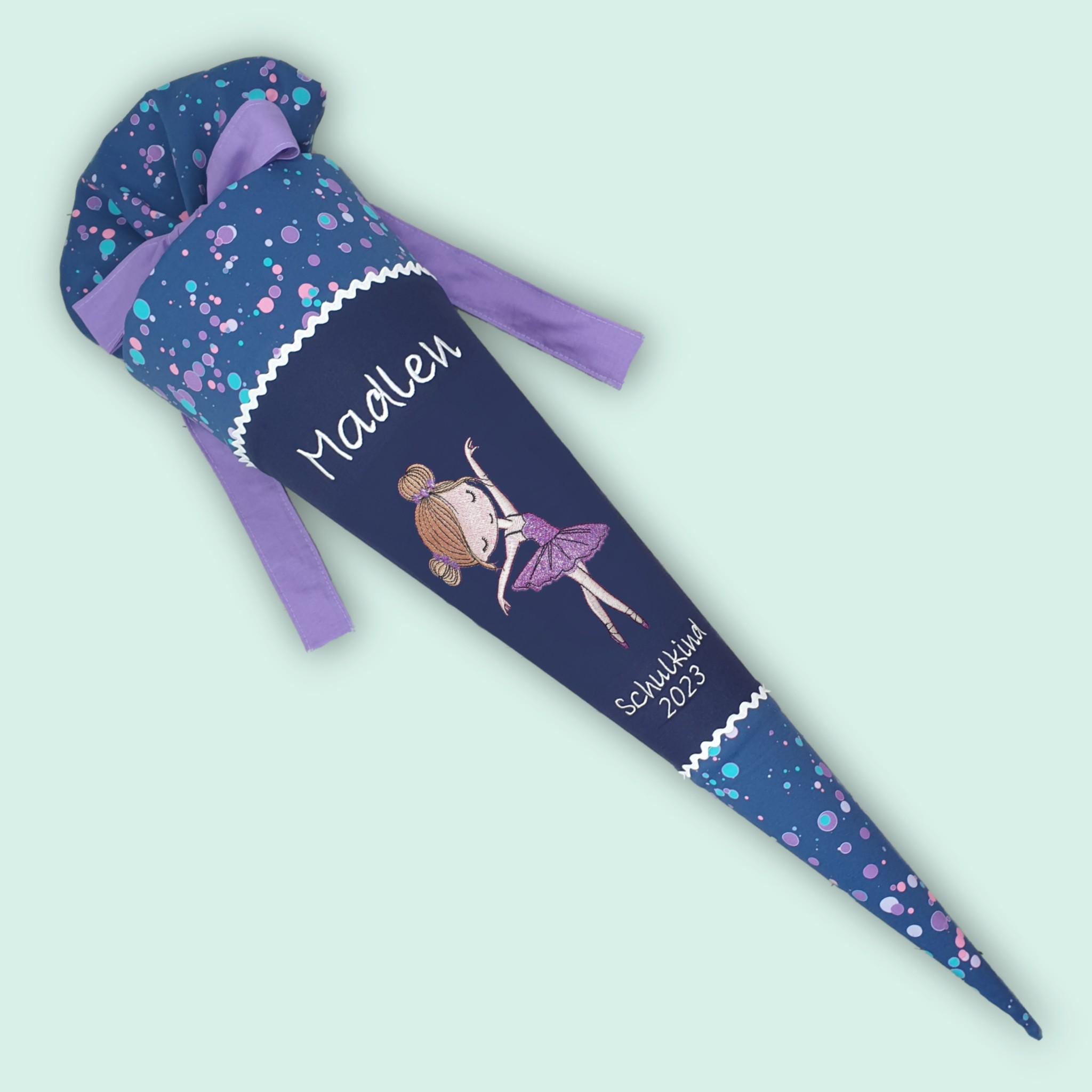 Schultüte mit Ballerina Tänzerin und Namen farblich auf den DerDieDas Deep Ocean Schulranzen abgestimmt.