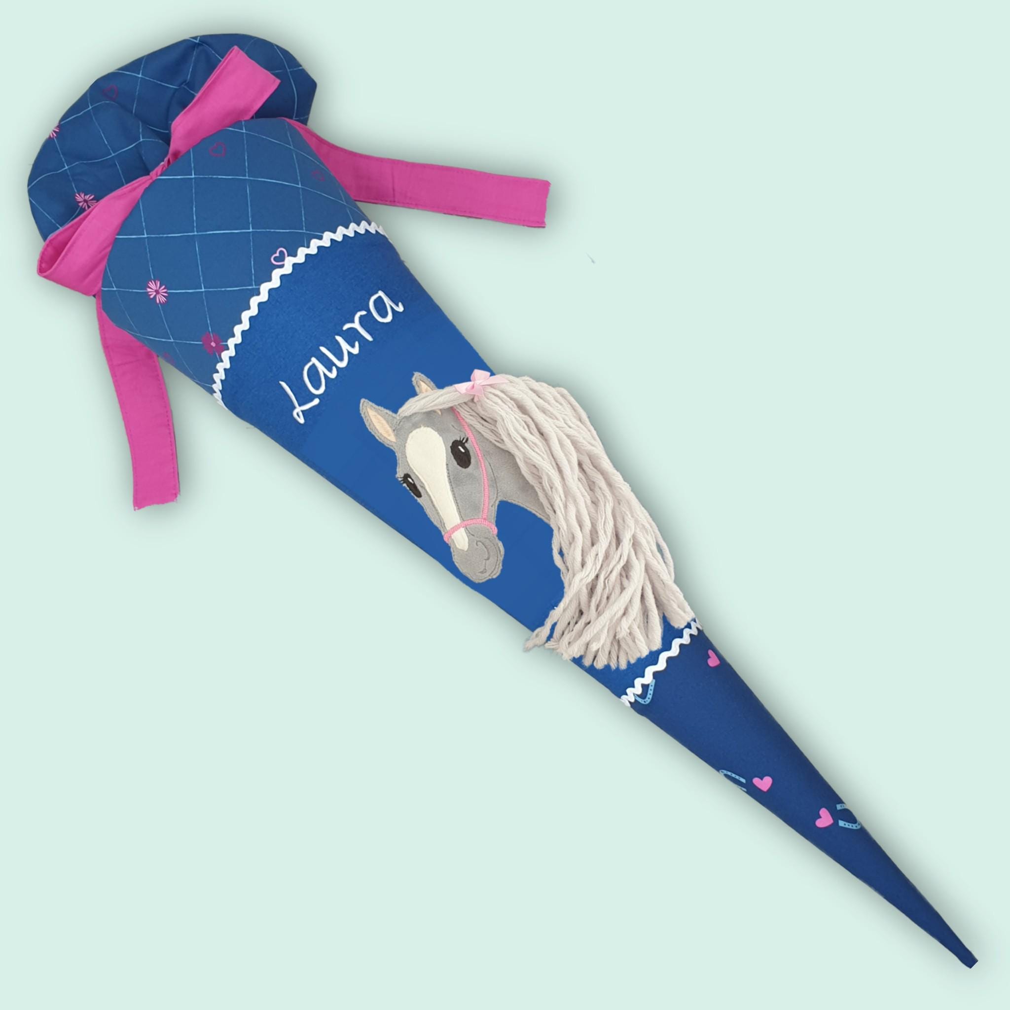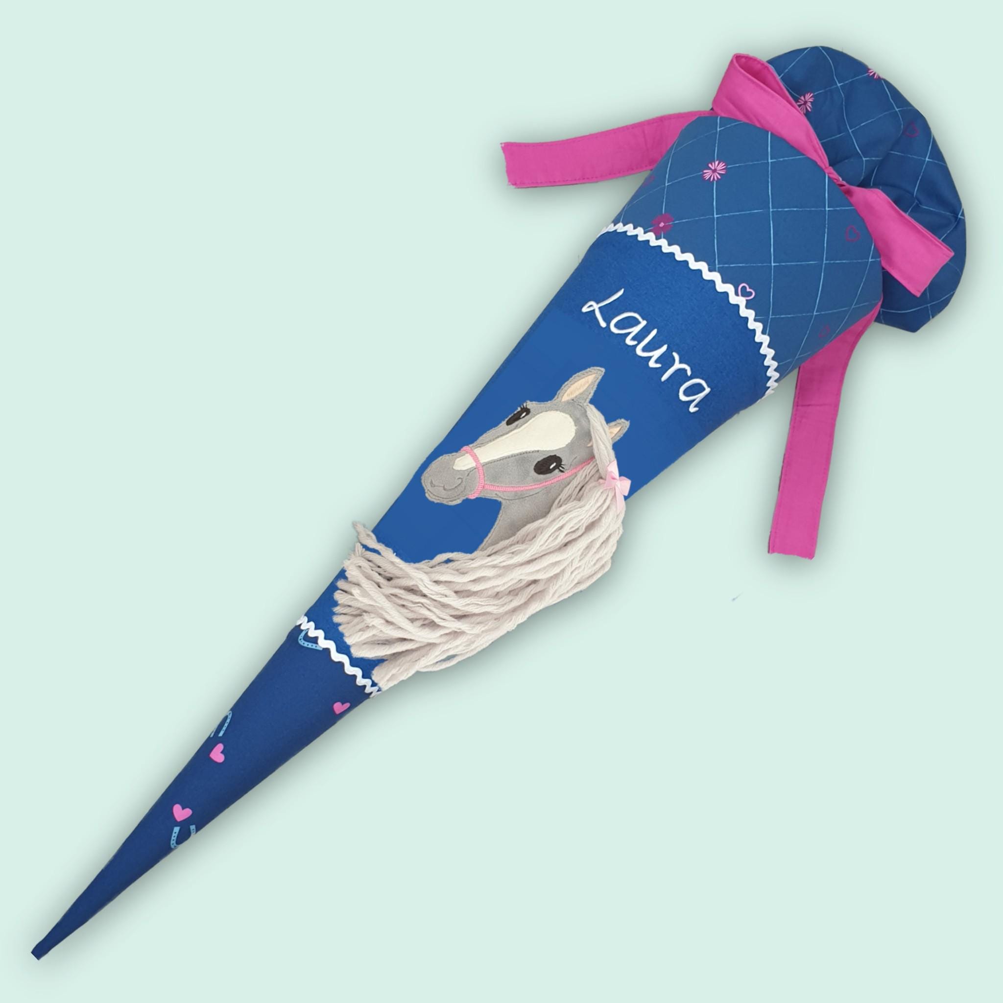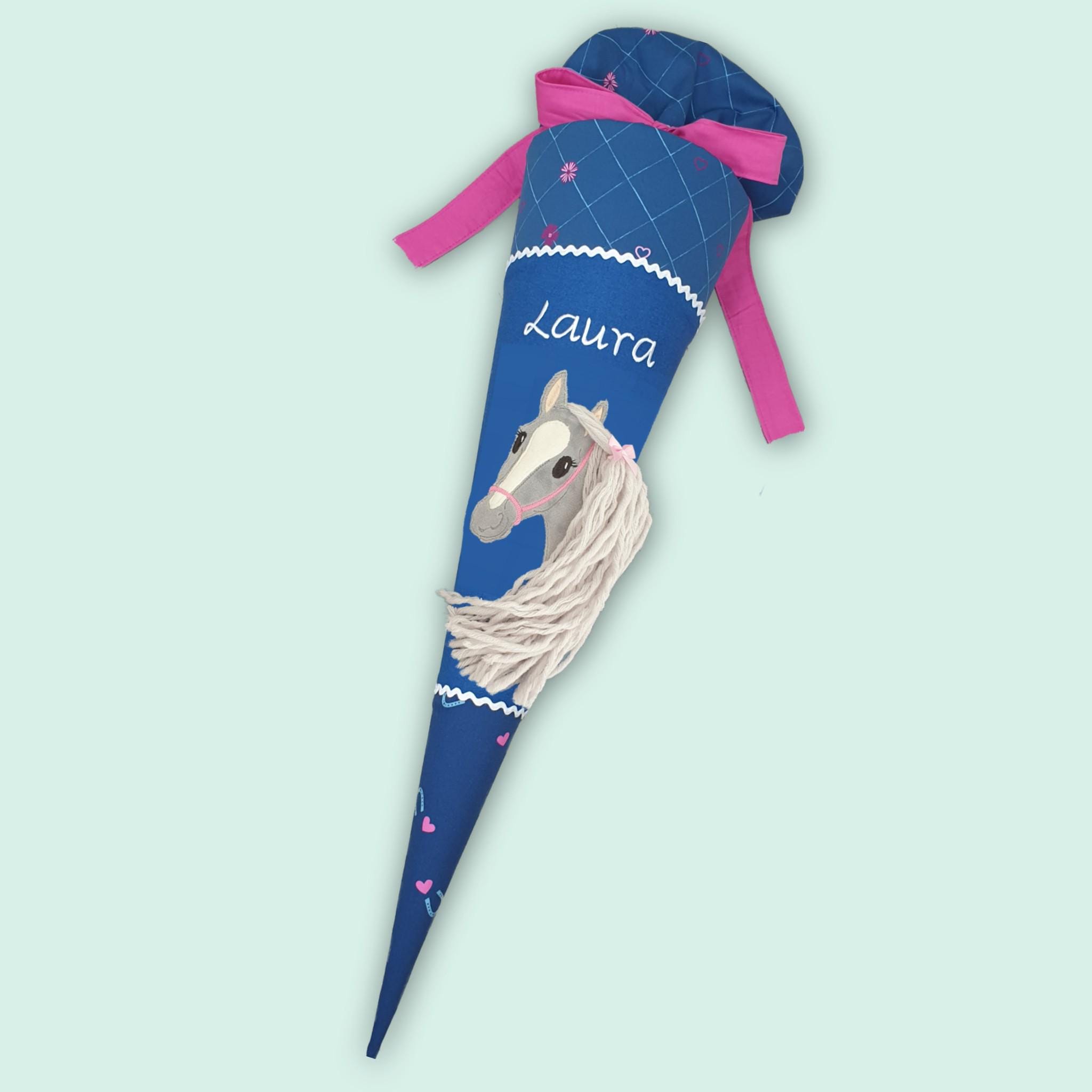 Schultüte mit 3D Pferdekopf und Namen farblich auf den Step by Step Horse Lima Schulranzen abgestimmt.