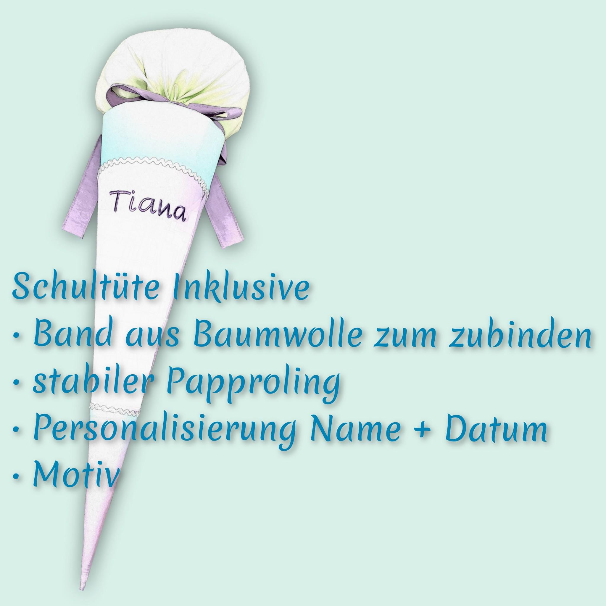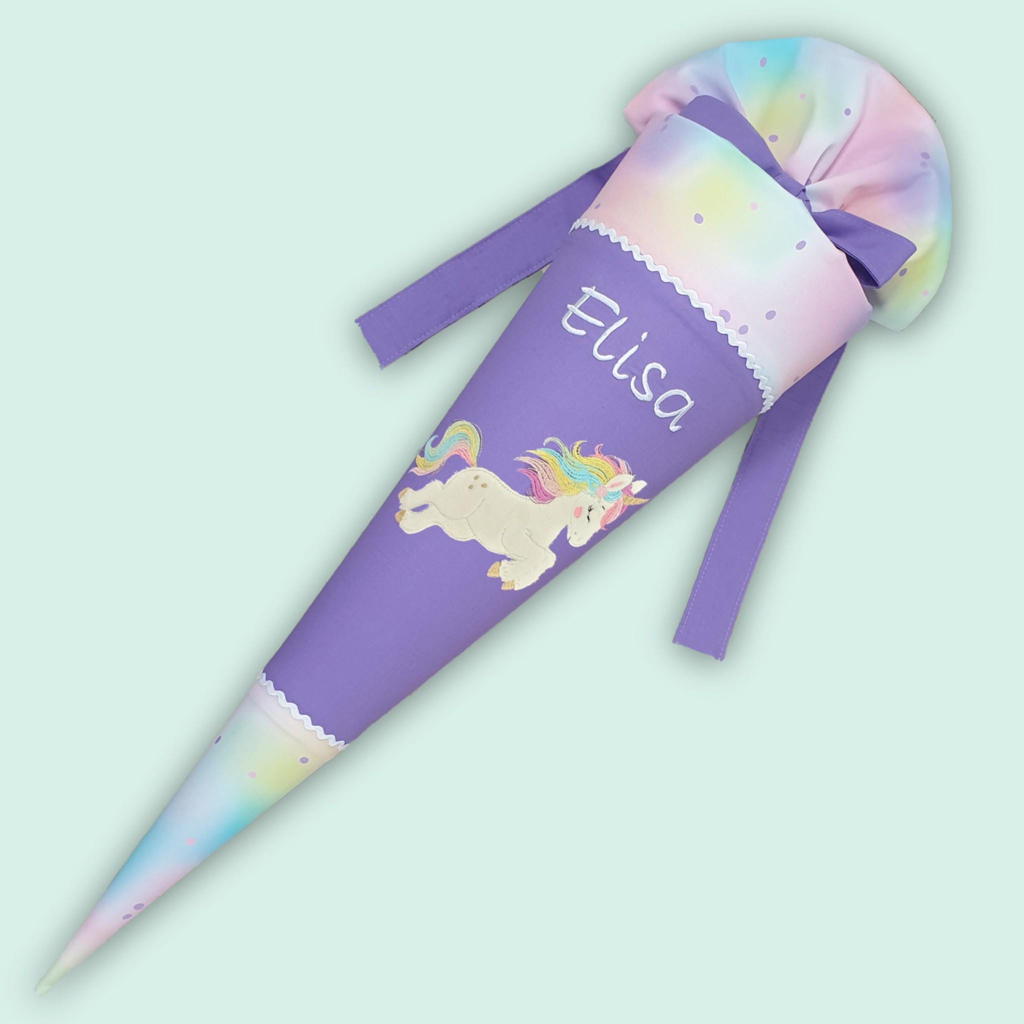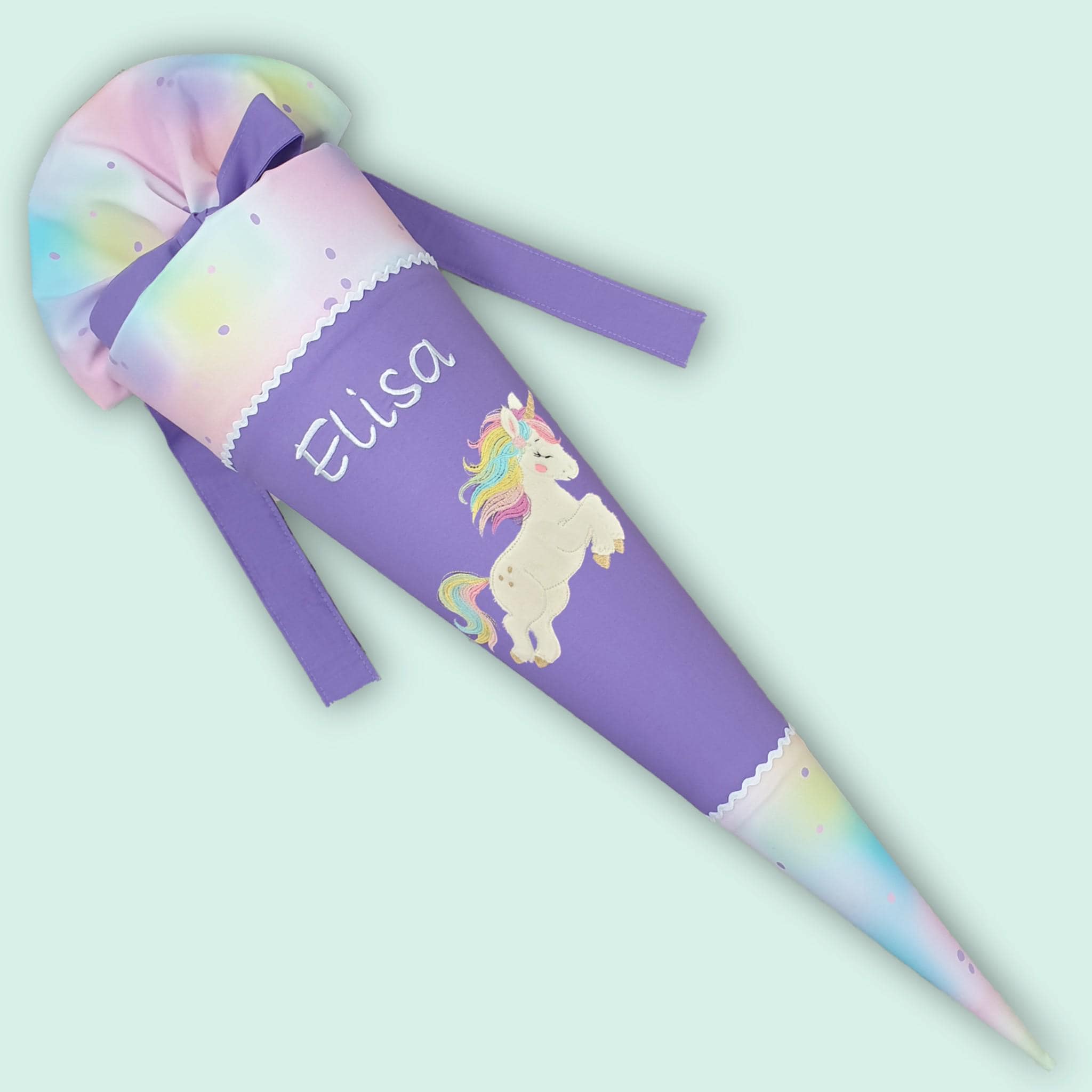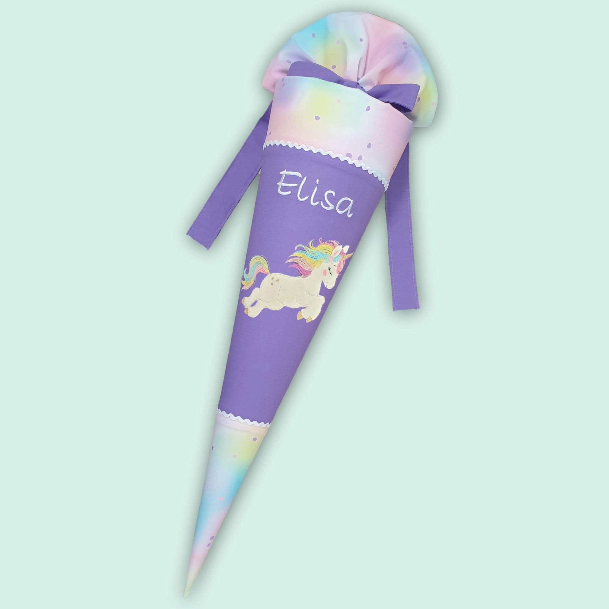 Schultüte mit Einhorn und Namen farblich auf den Step by step Butterfly Luna abgestimmt.
