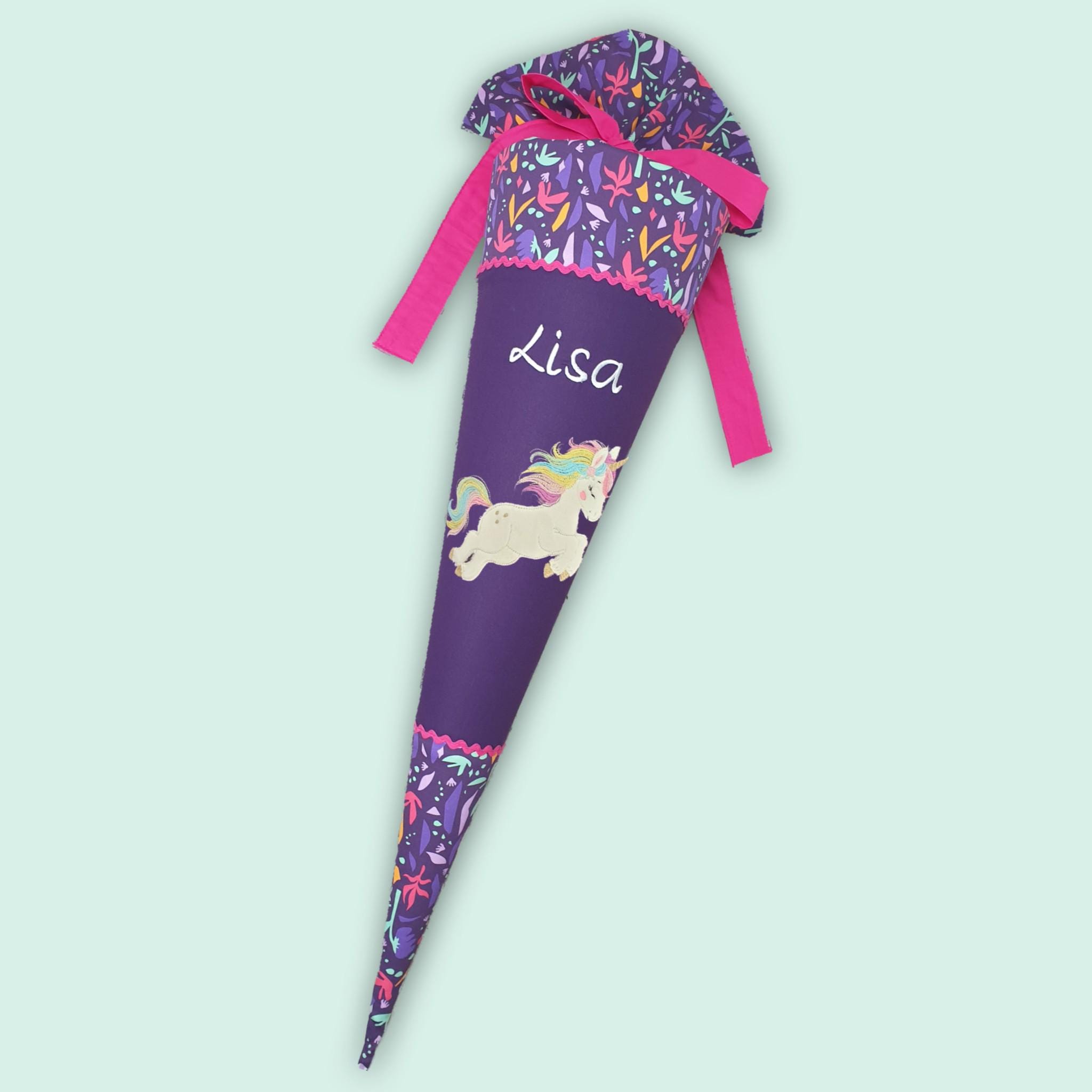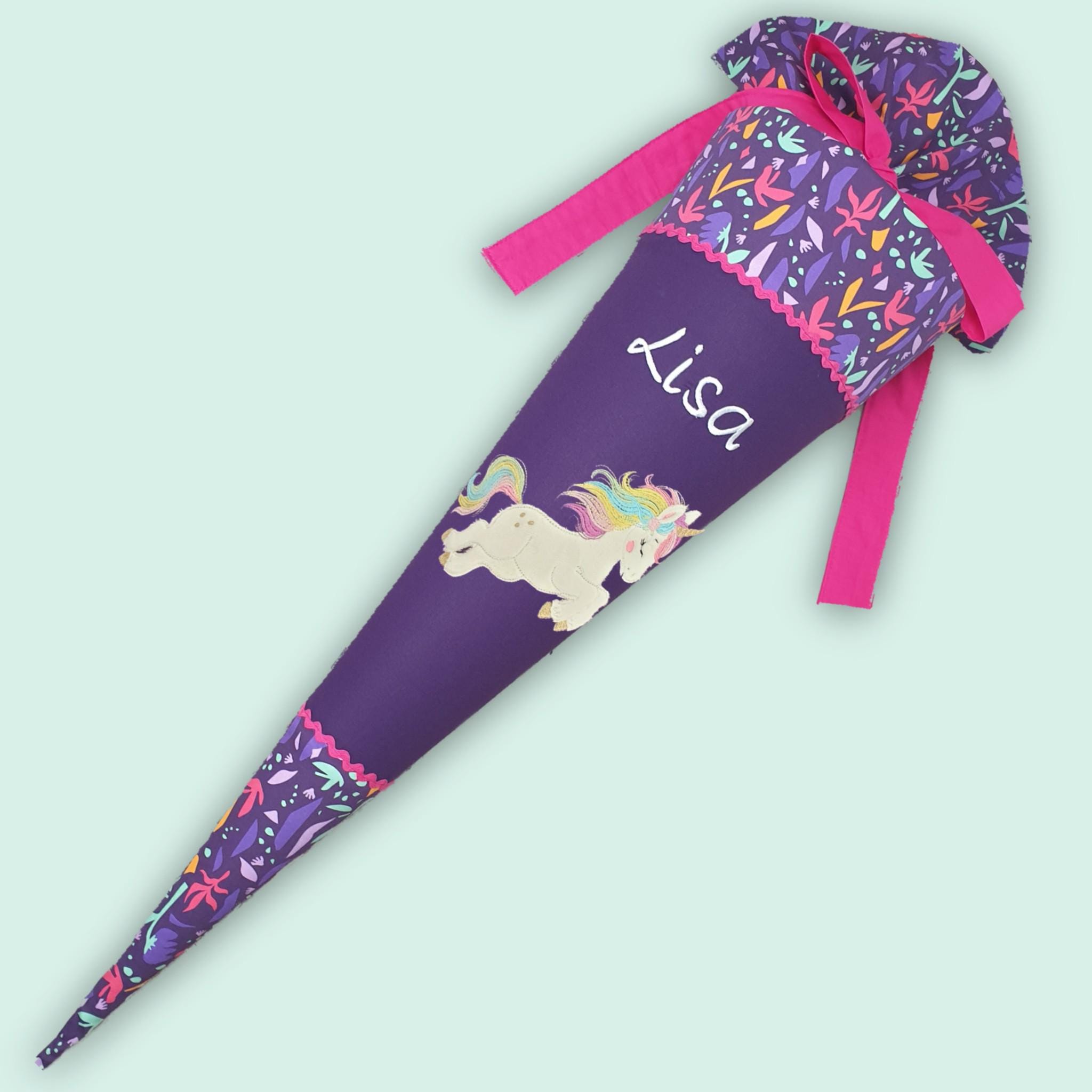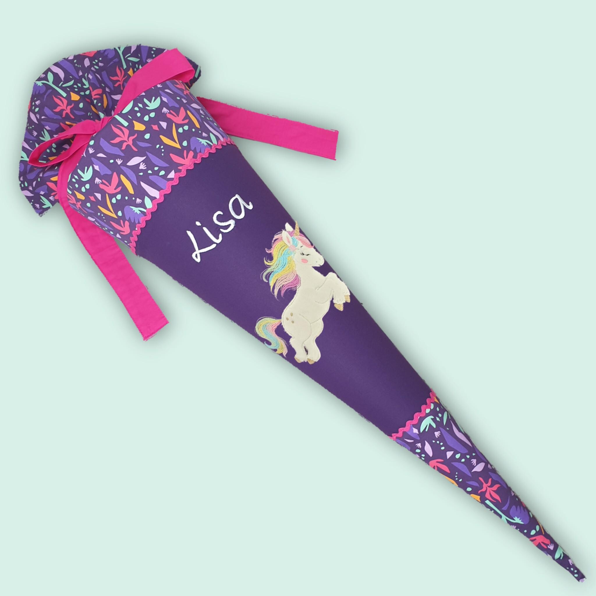 Schultüte mit Einhorn und Namen farblich auf den Ambärzonas Schulranzen abgestimmt.