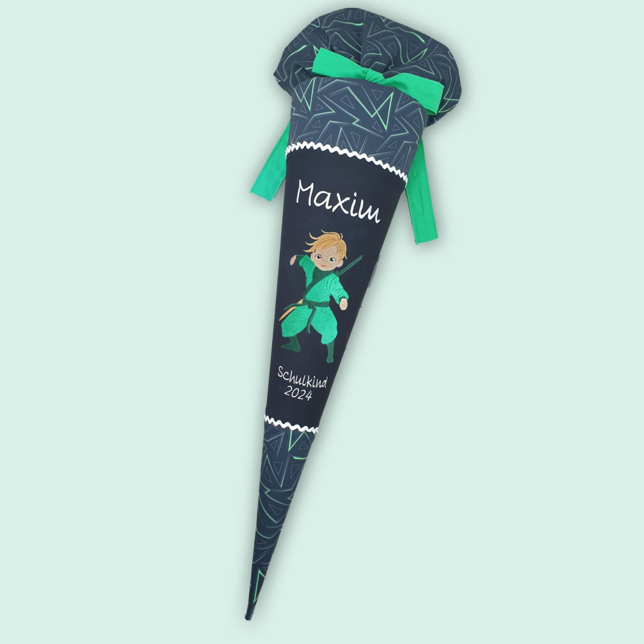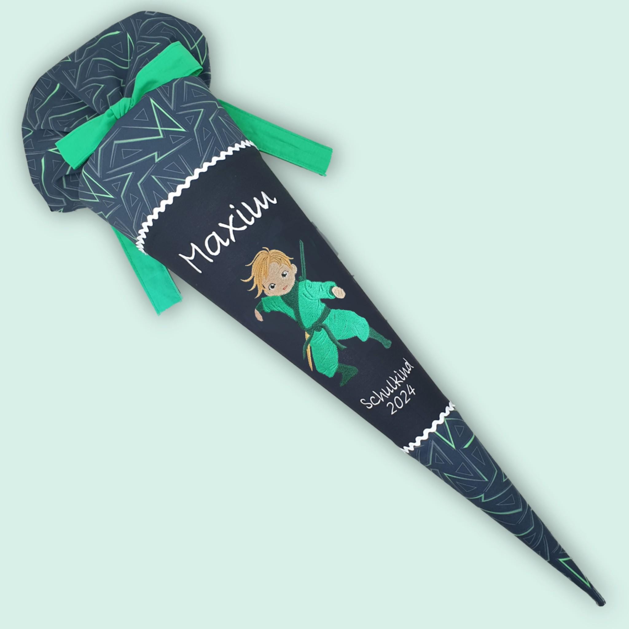 Schultüte mit Ninja und Namen farblich auf den Ninja Kimo Schulranzen abgestimmt.