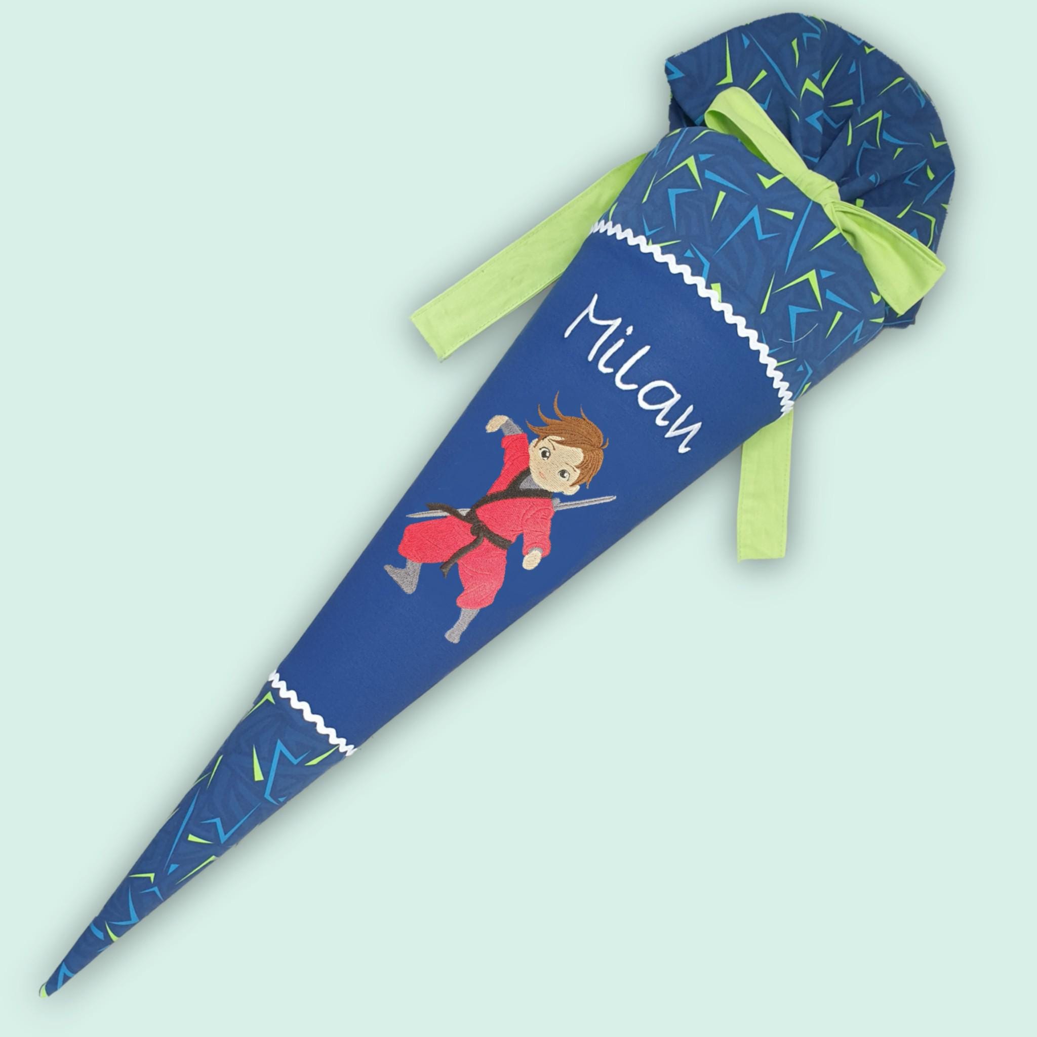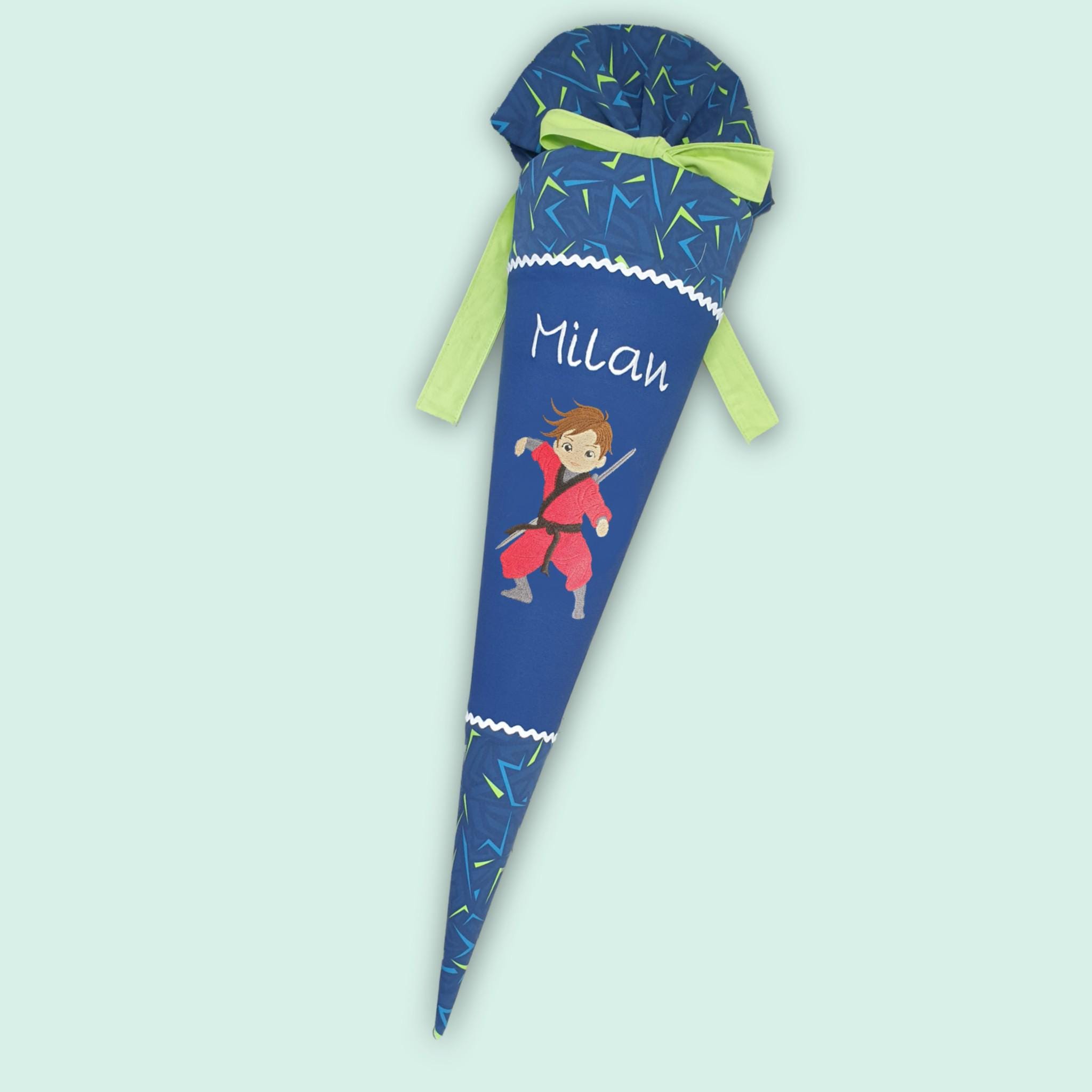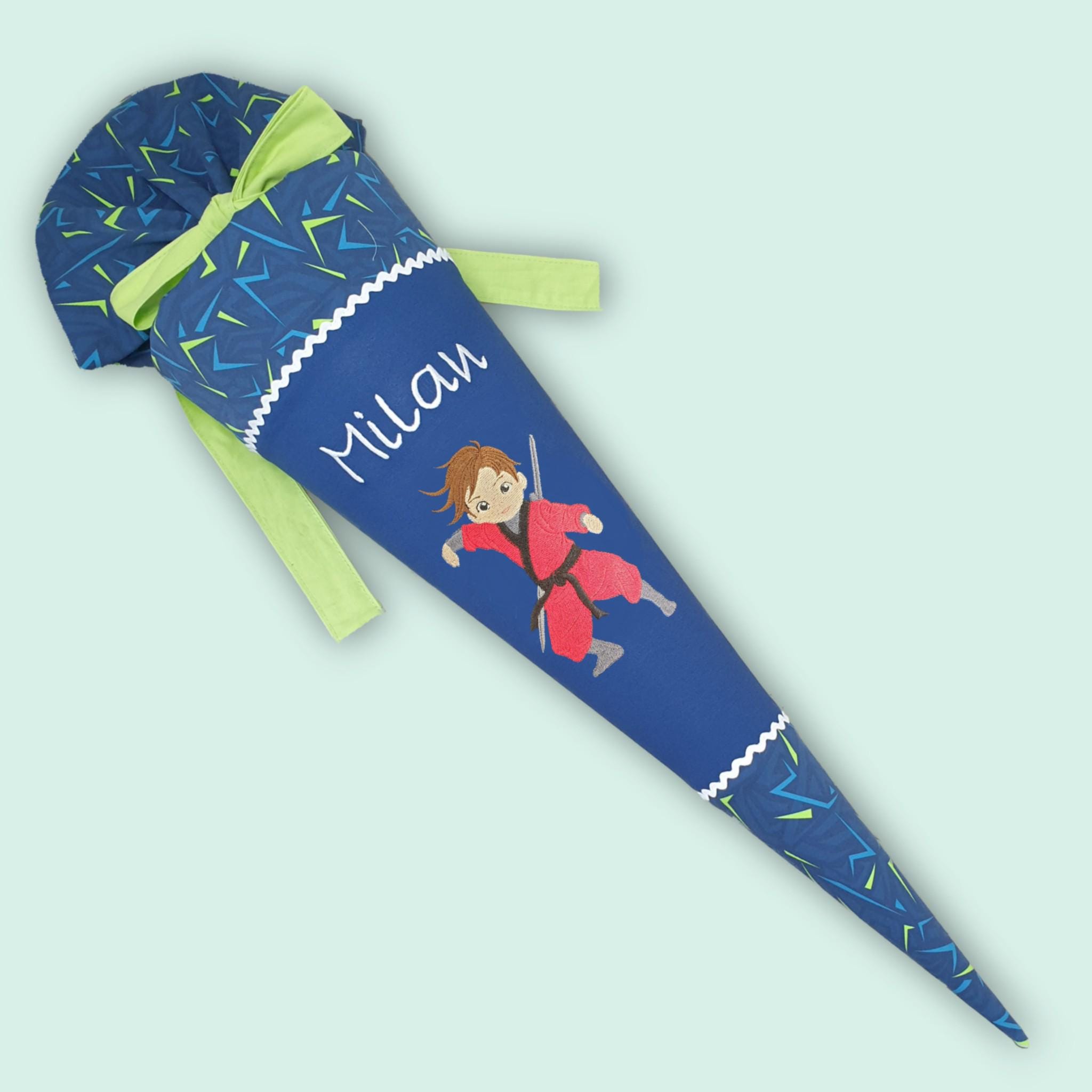 Schultüte mit Ninja und Namen farblich auf den Spitzenreitbär Schulranzen abgestimmt.