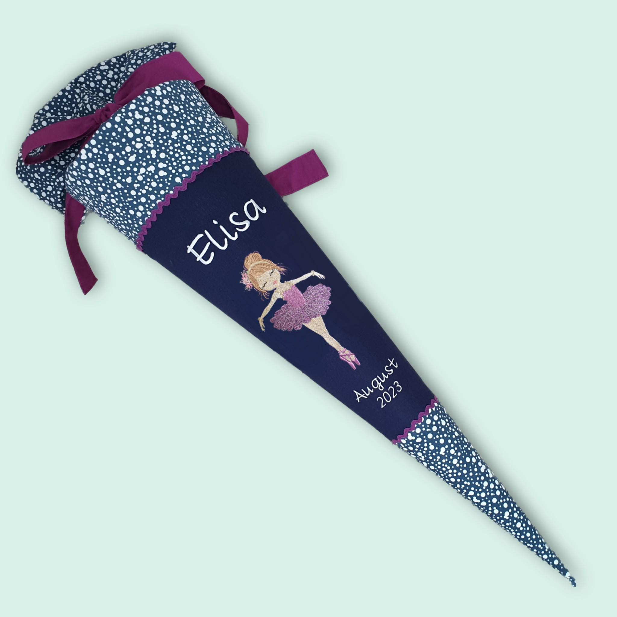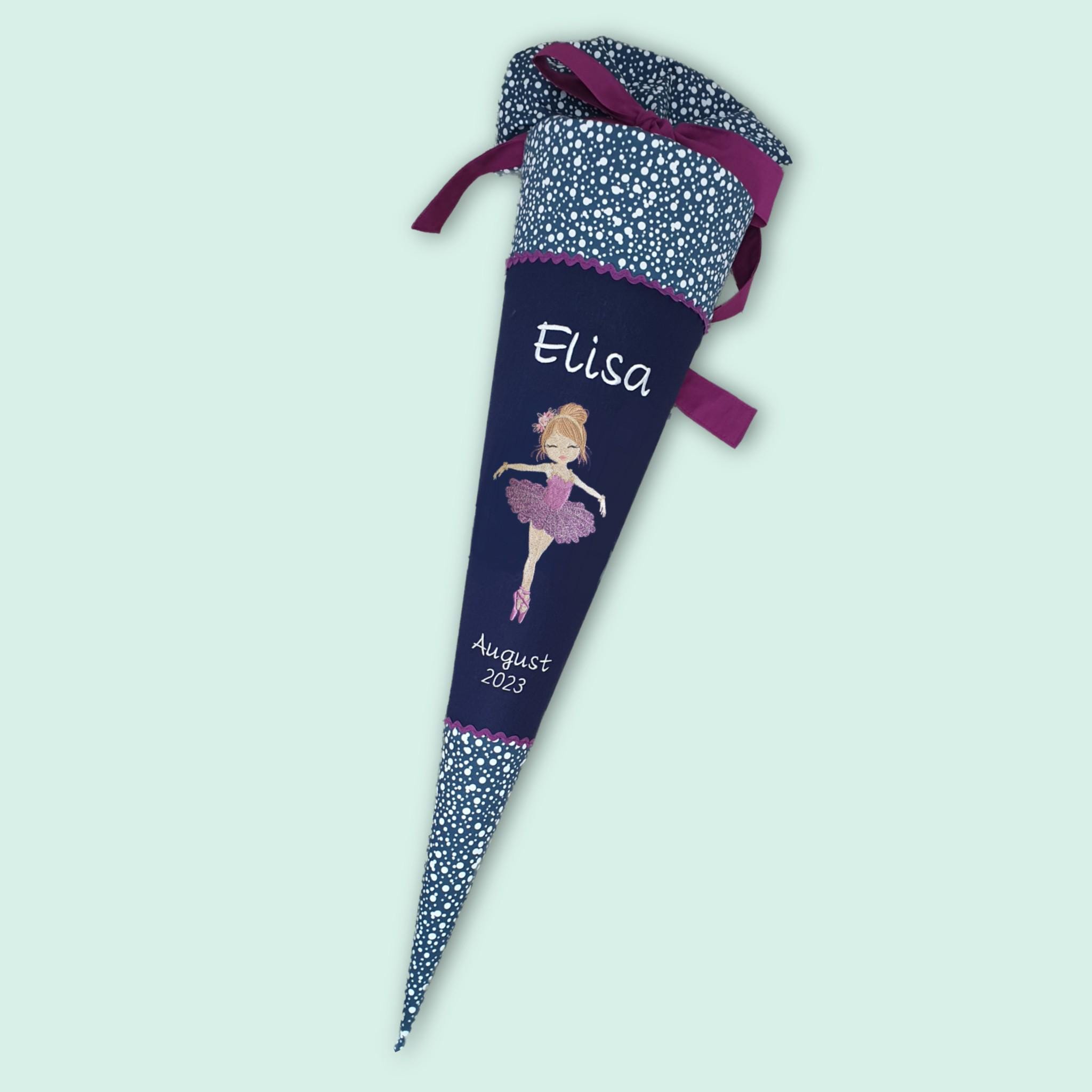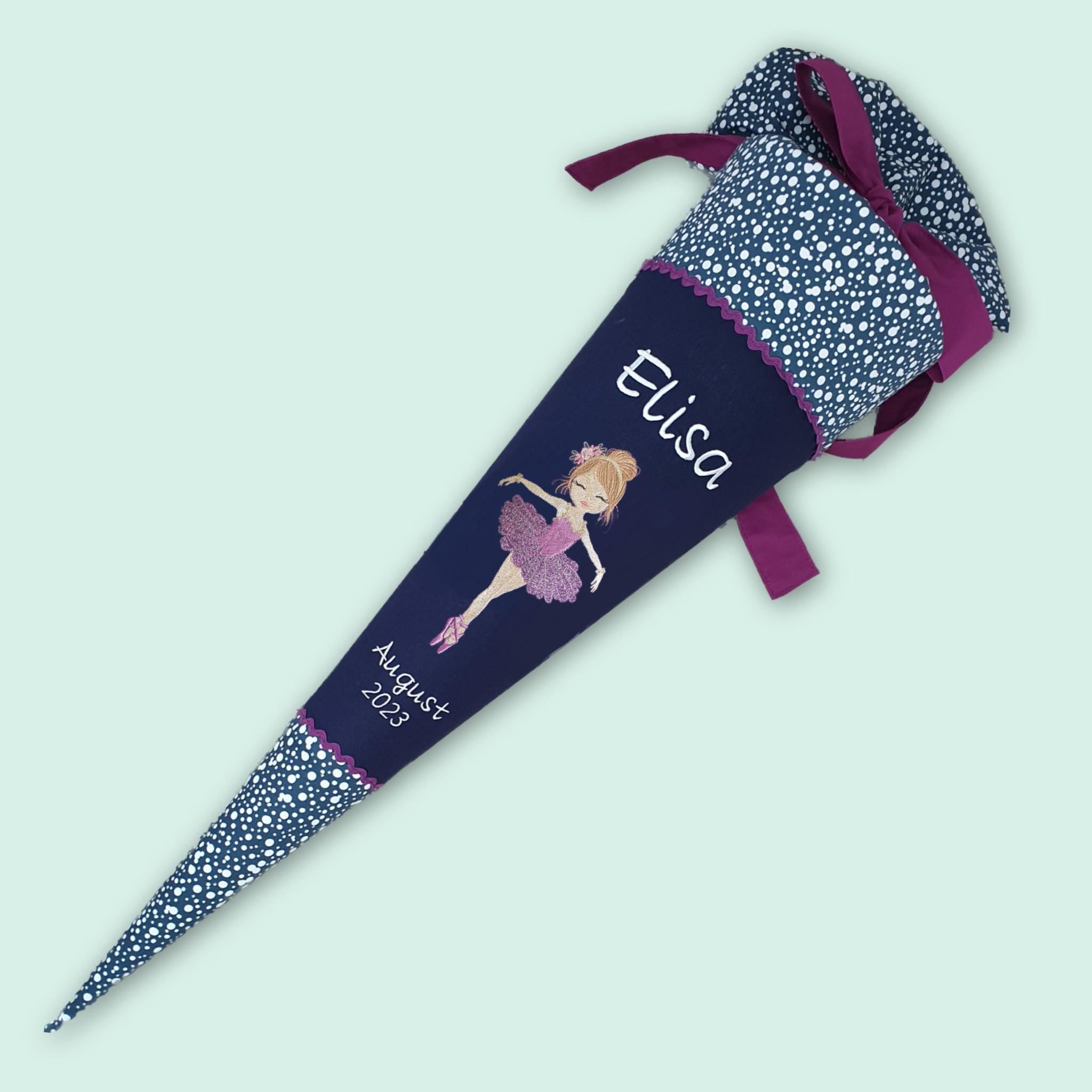 Schultüte mit Tänzerin Ballerina im glitzer Kleid Tütü und Namen farblich auf den Ergobag Bärlaxy Schulranzen abgestimmt.