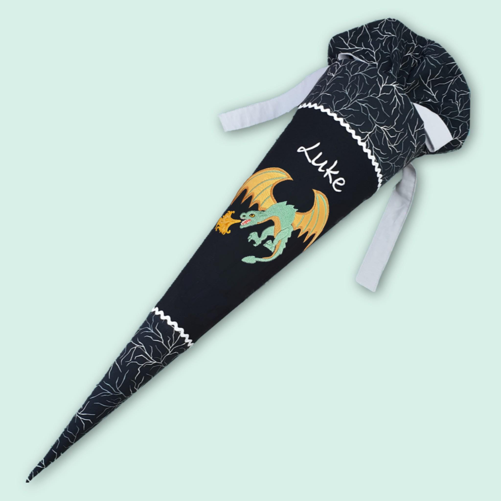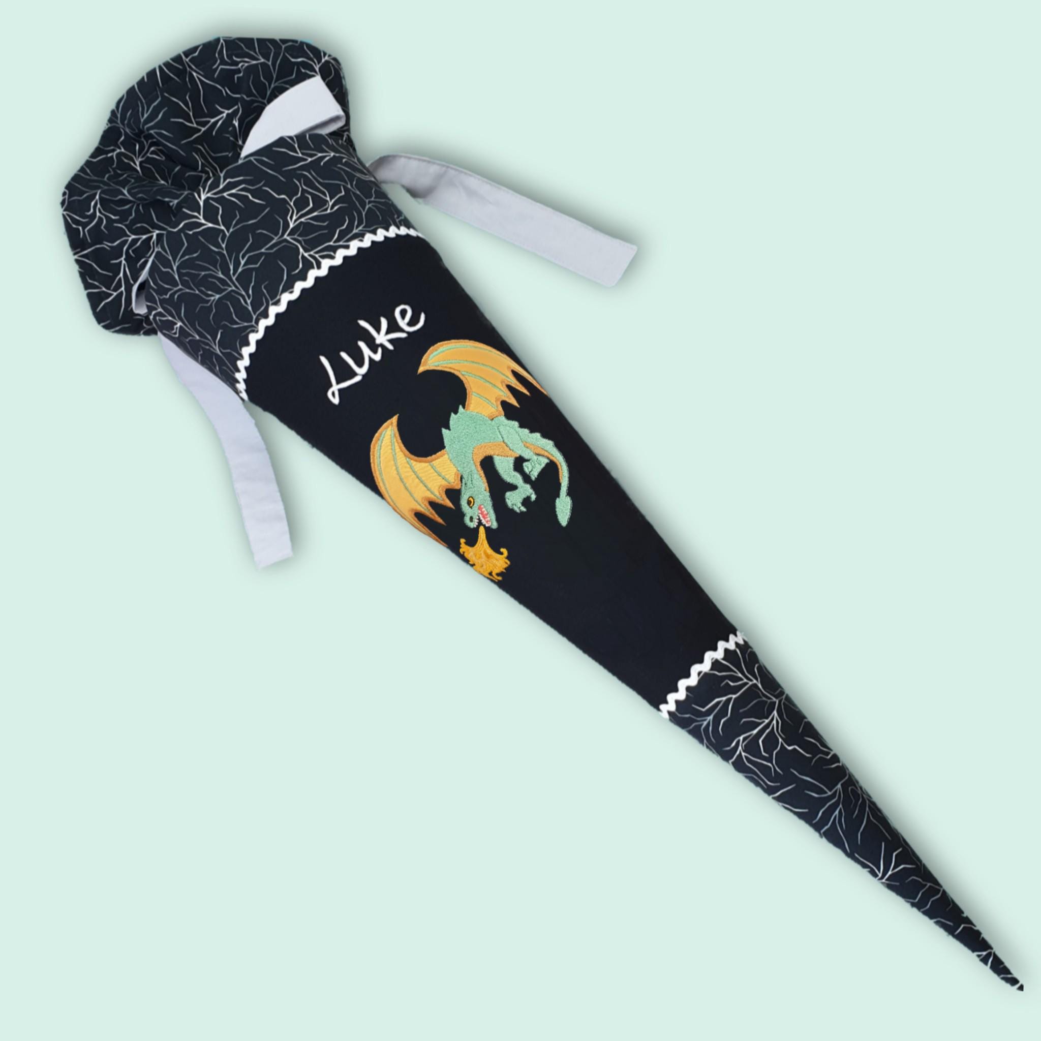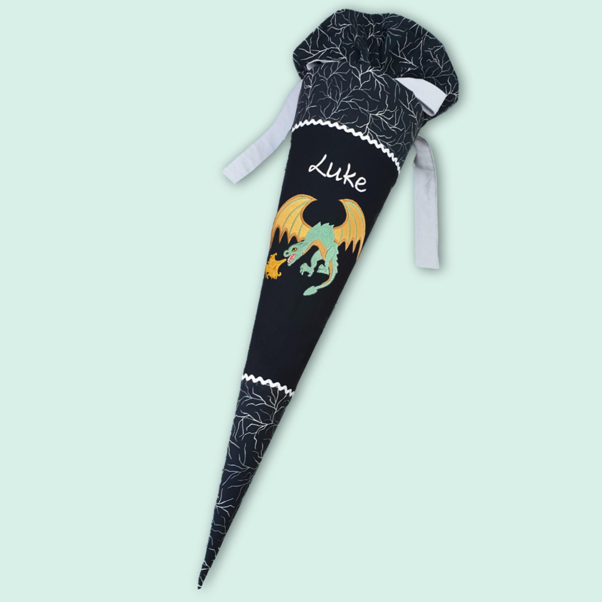 Schultüte mit Drache und Namen farblich auf den Ergobag Super ReflektBär Glow Schulranzen abgestimmt.