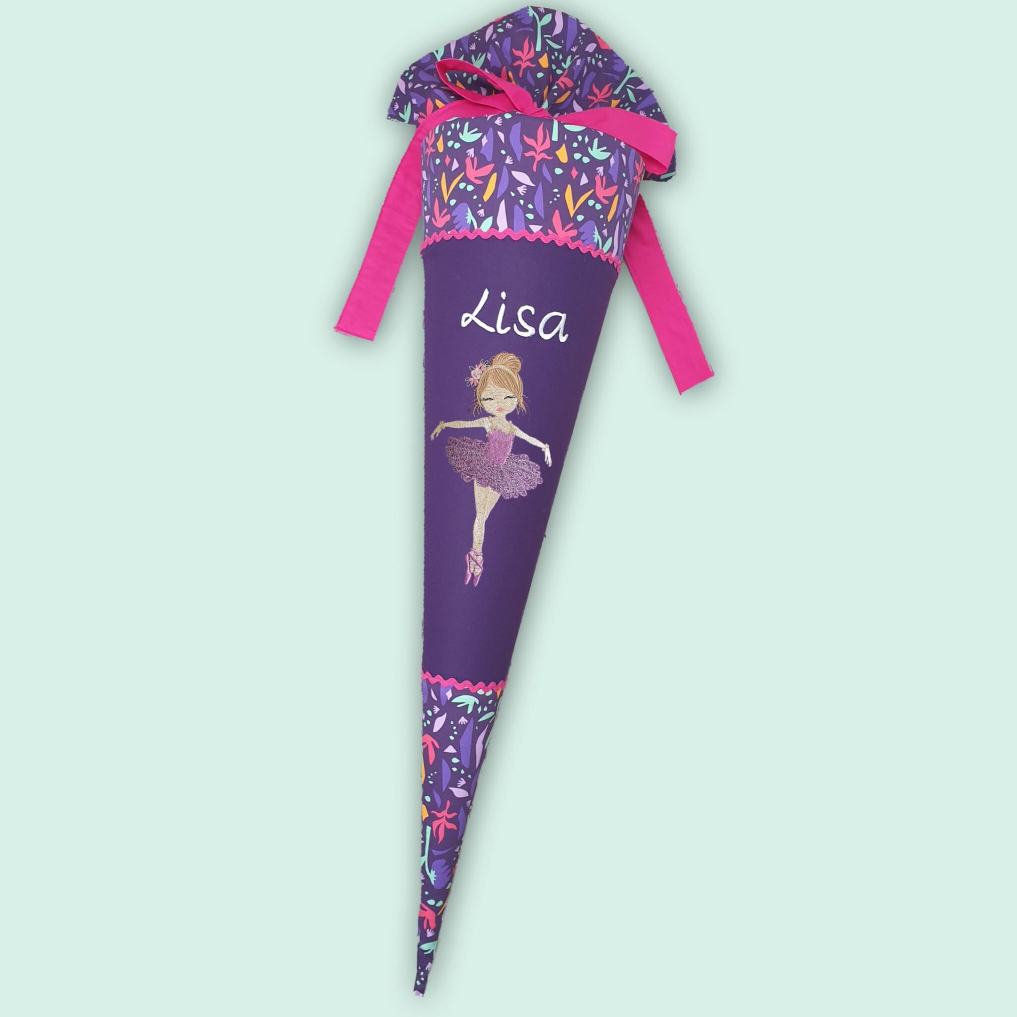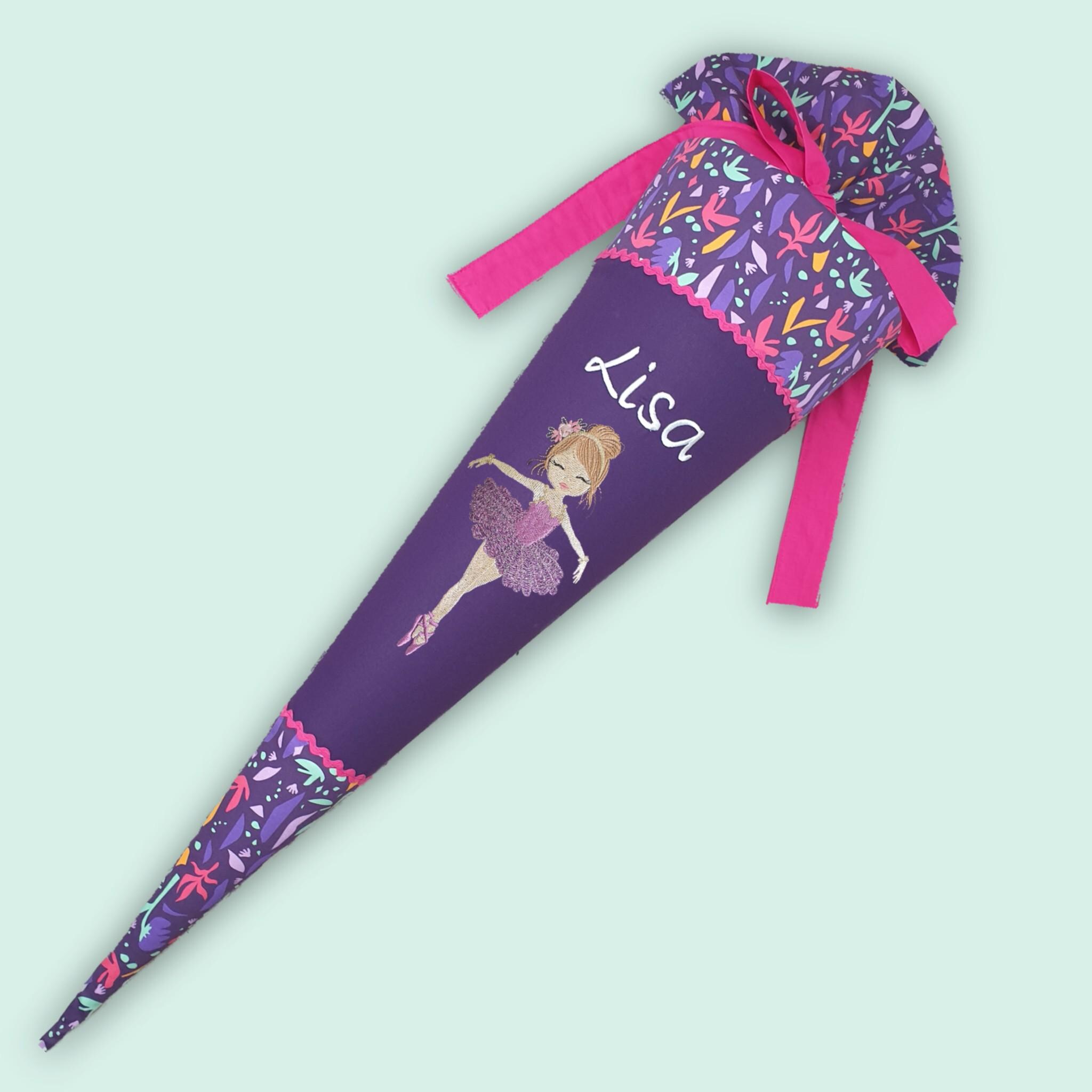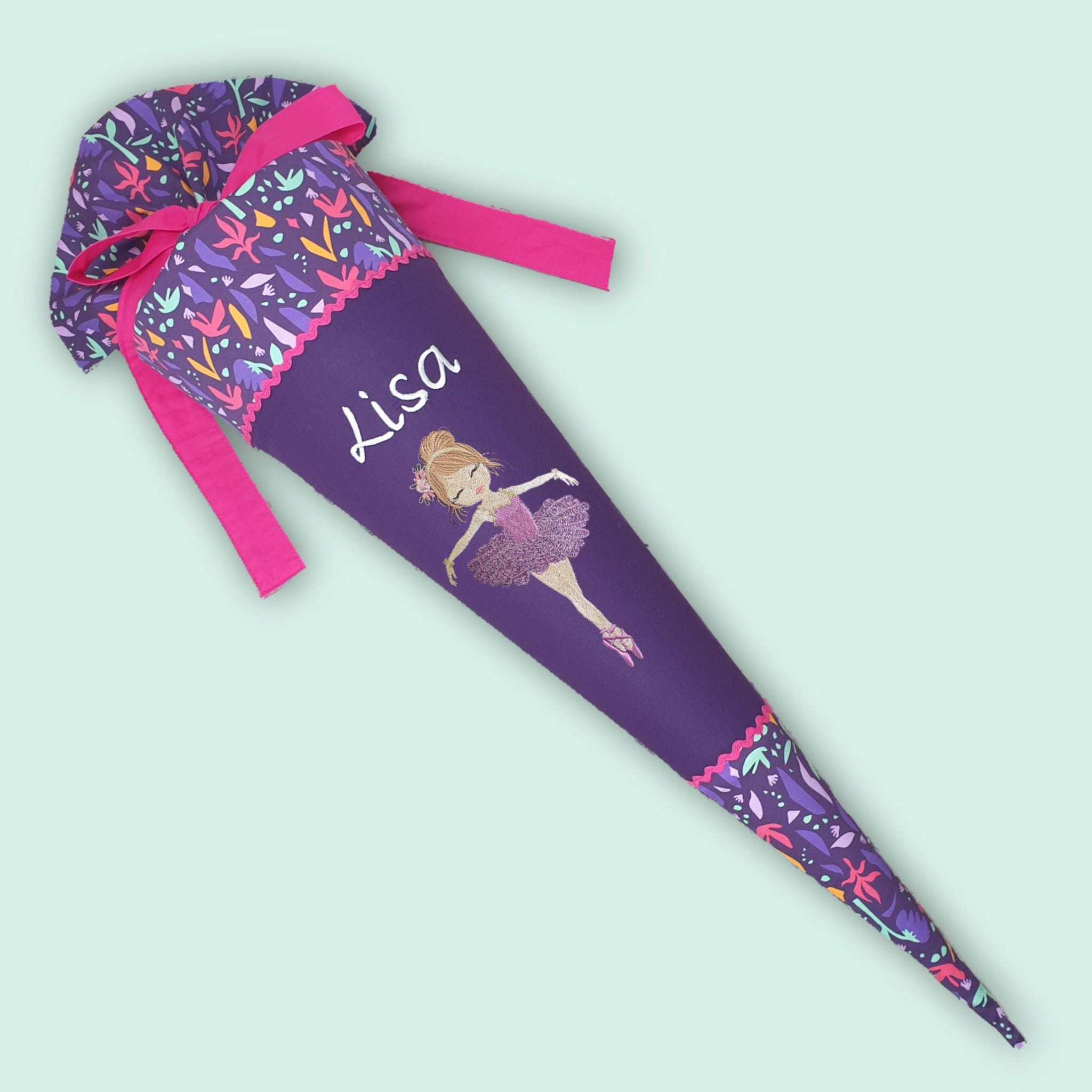 Schultüte mit glitzer Ballerina Tänzerin und Namen farblich auf den Ambärzonas Schulranzen abgestimmt.