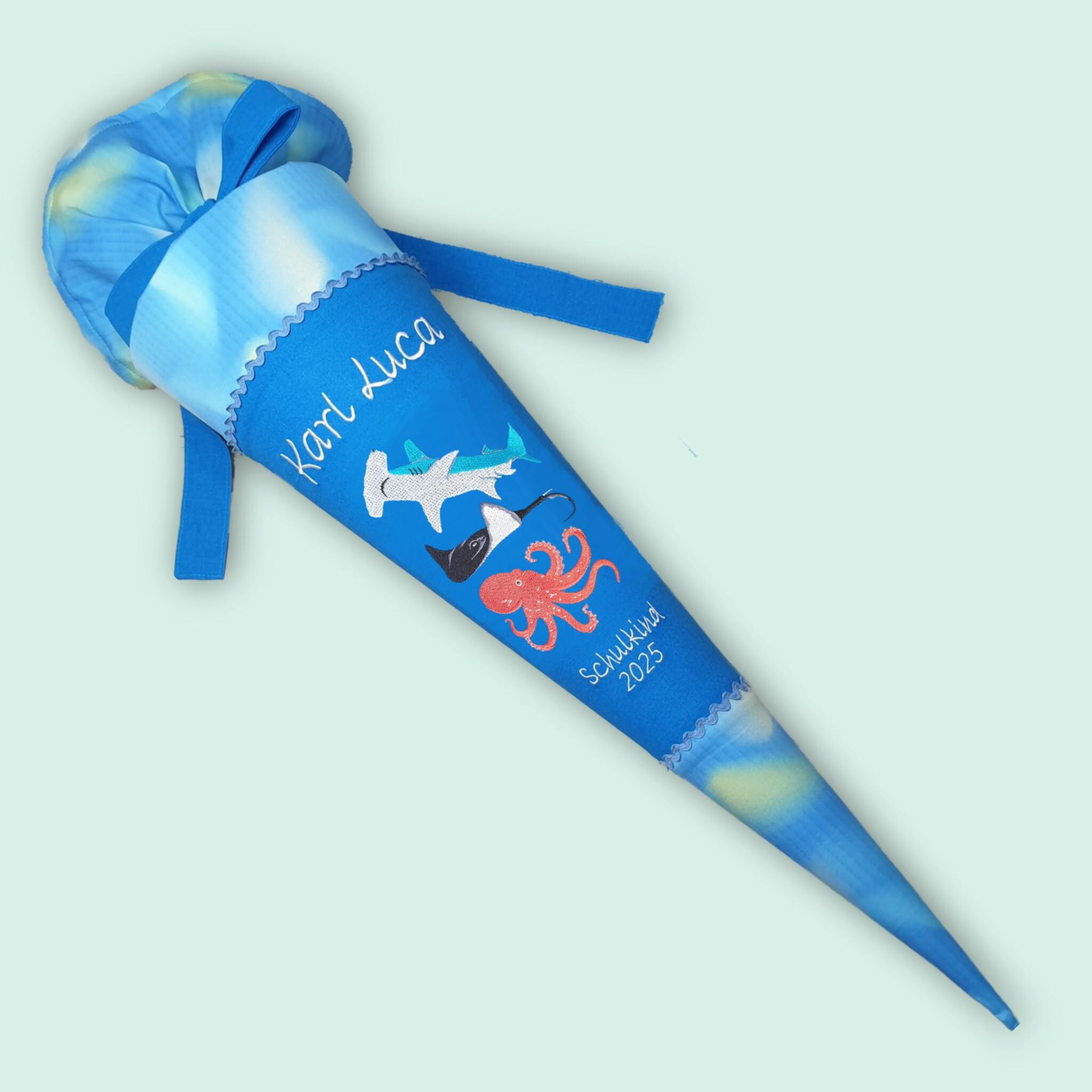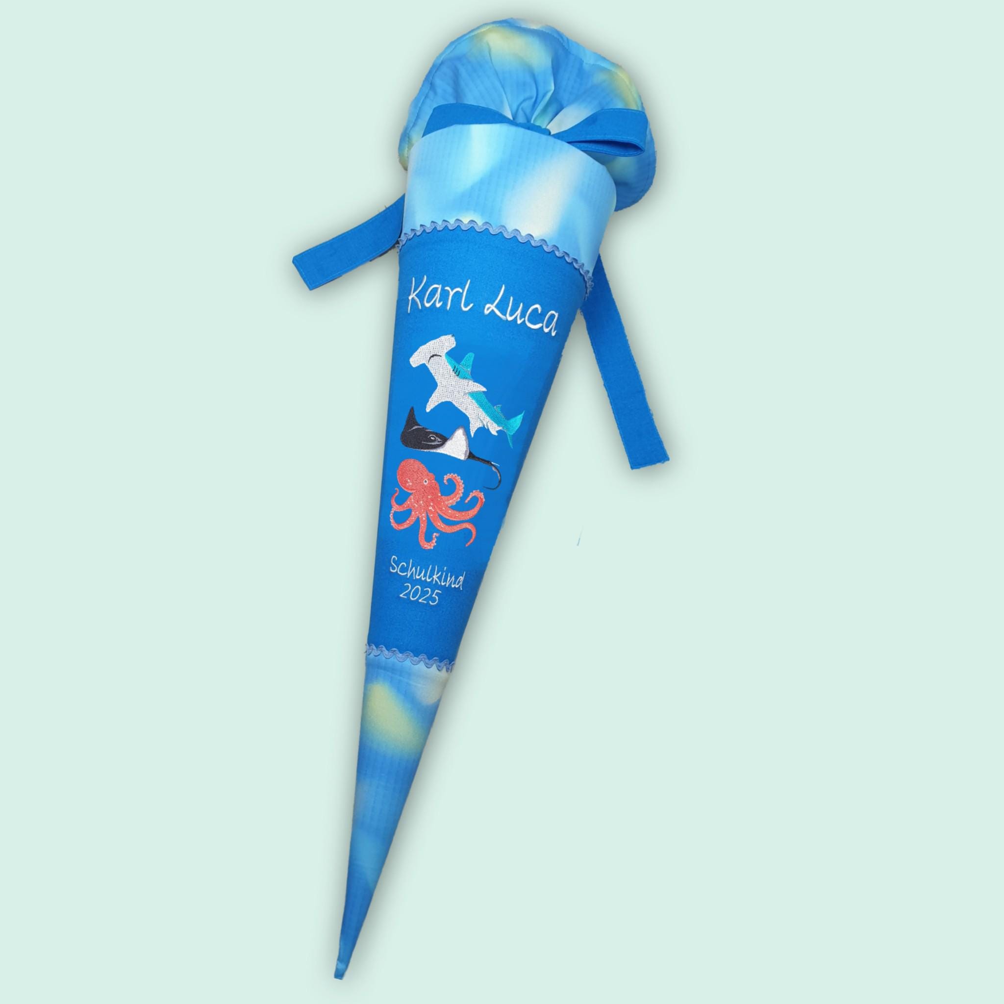 Schultüte mit Rochen Oktopus und Hammerhai und Namen farblich auf den Ninja Zazu Schulranzen abgestimmt.