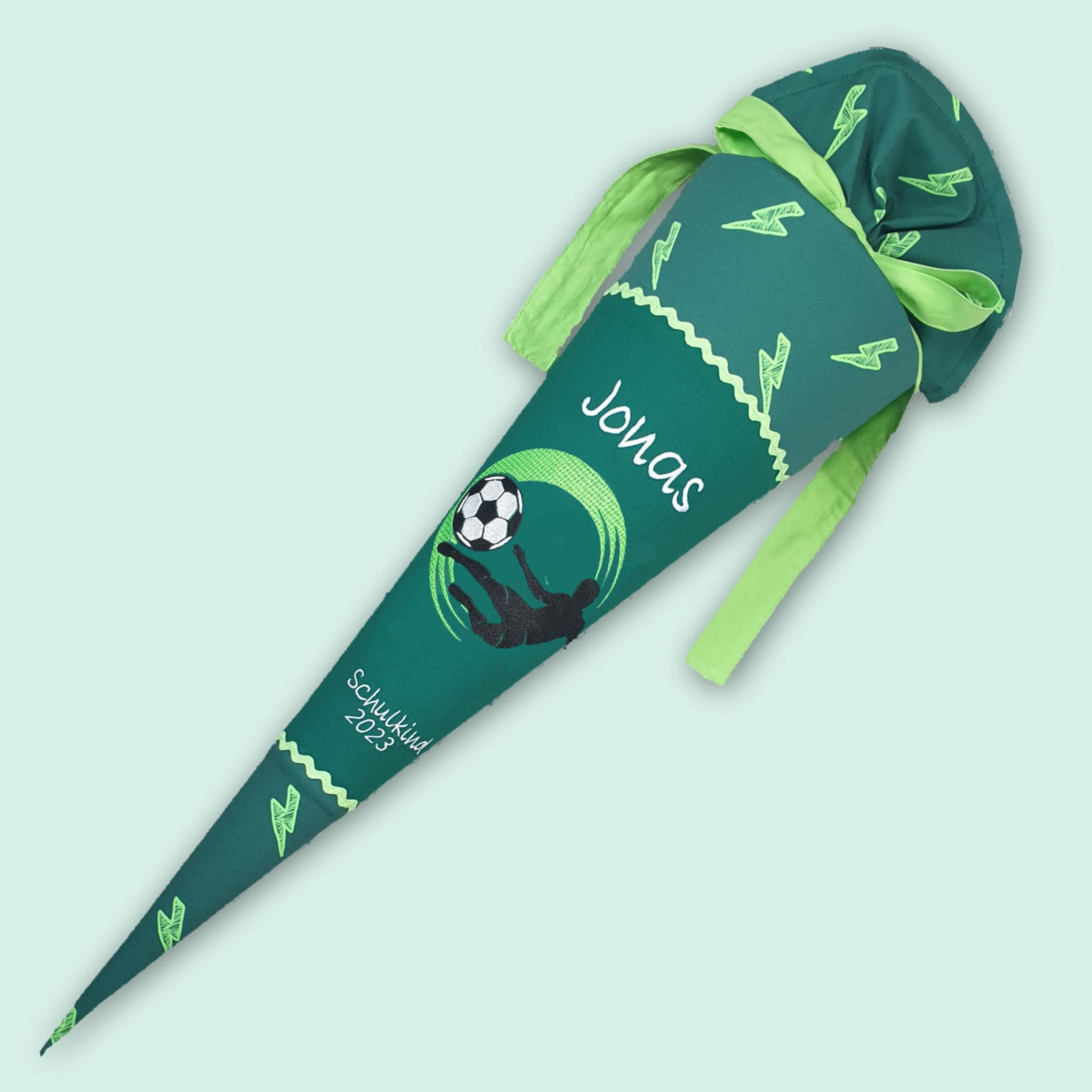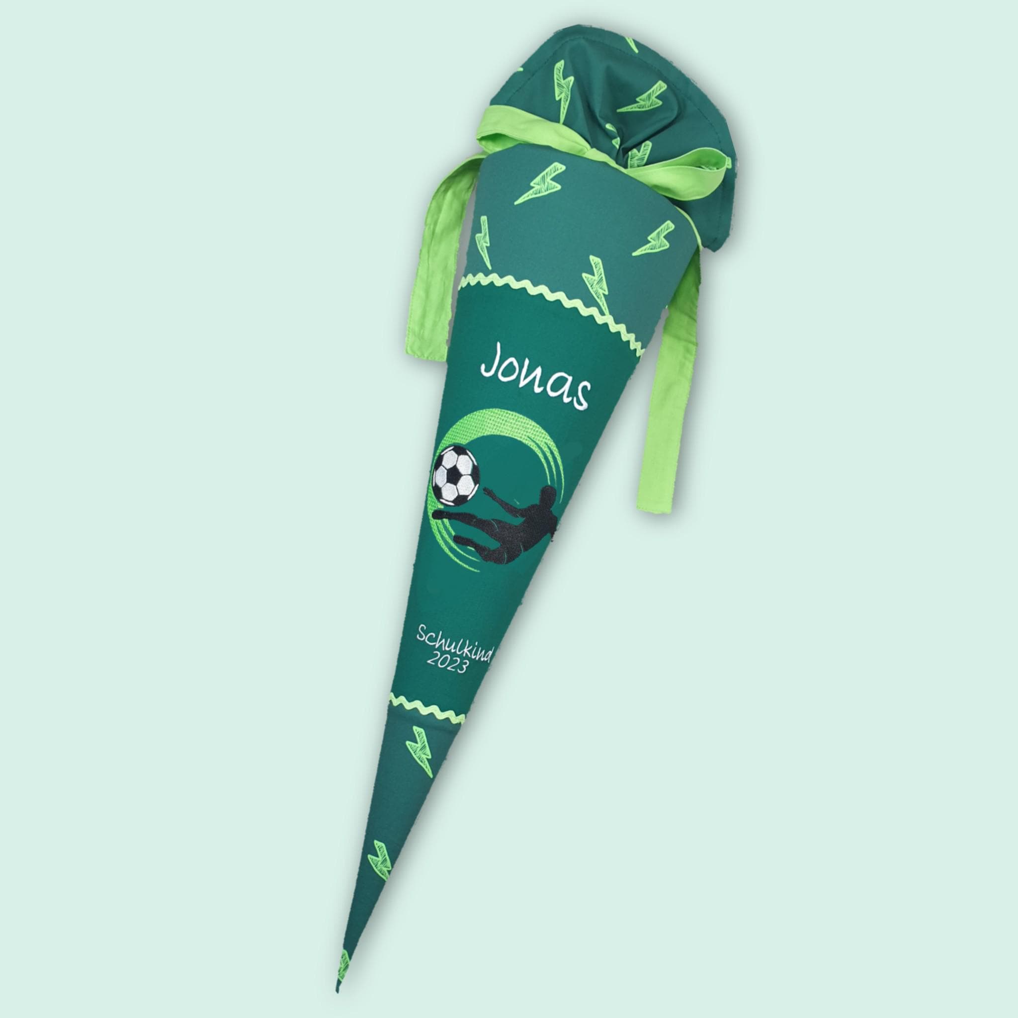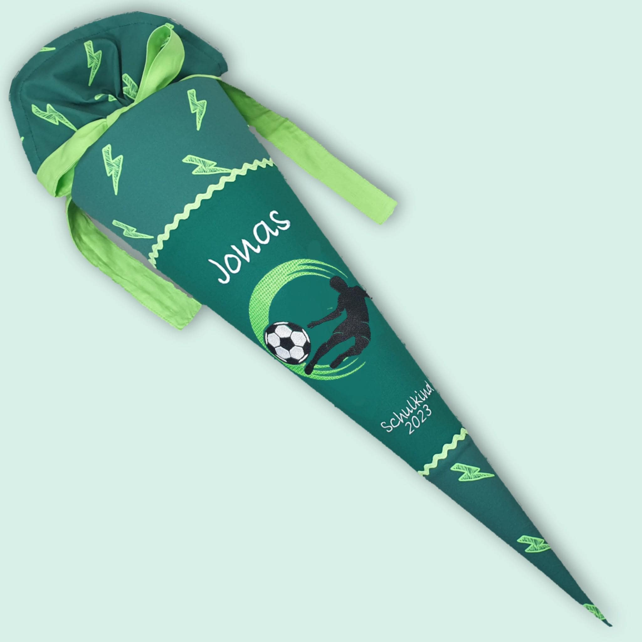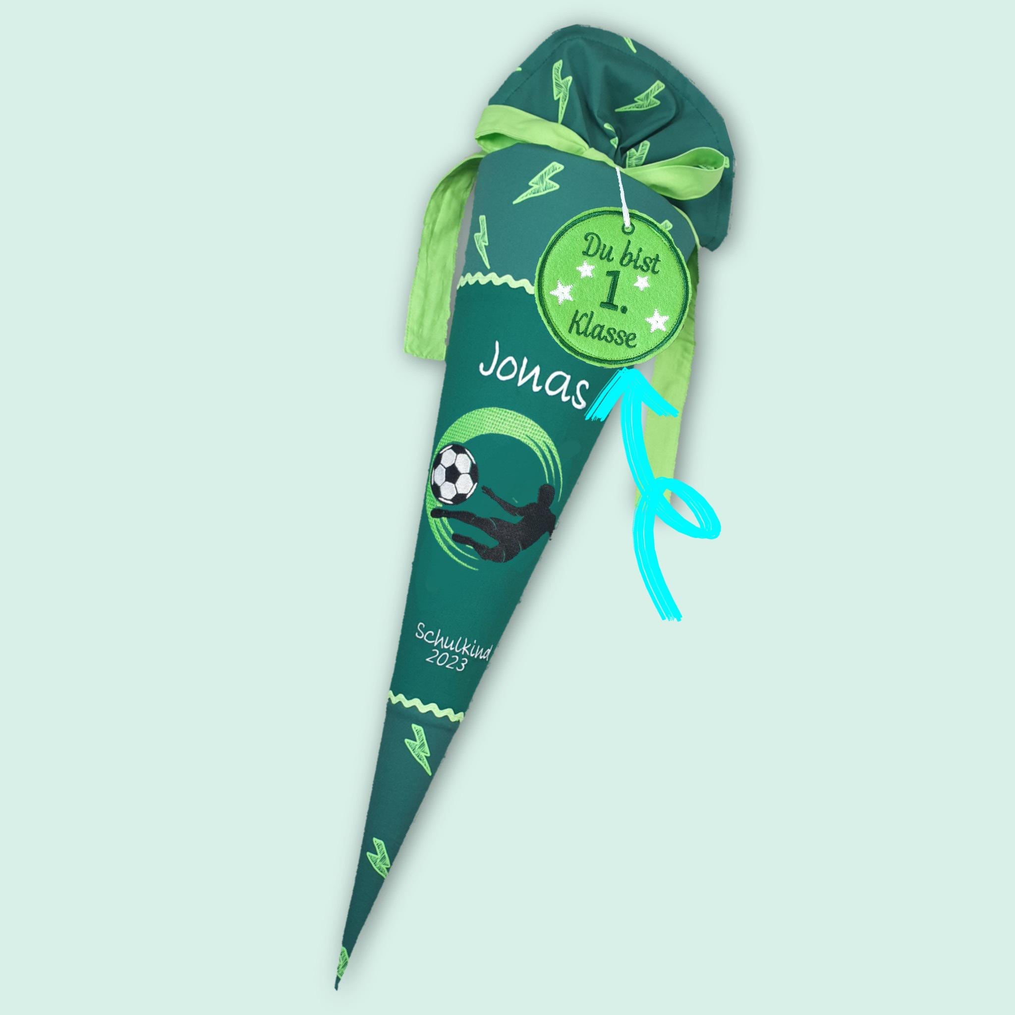 Schultüte mit Fusball und Namen farblich auf den Ergobag Bärtastisch Schulranzen abgestimmt.