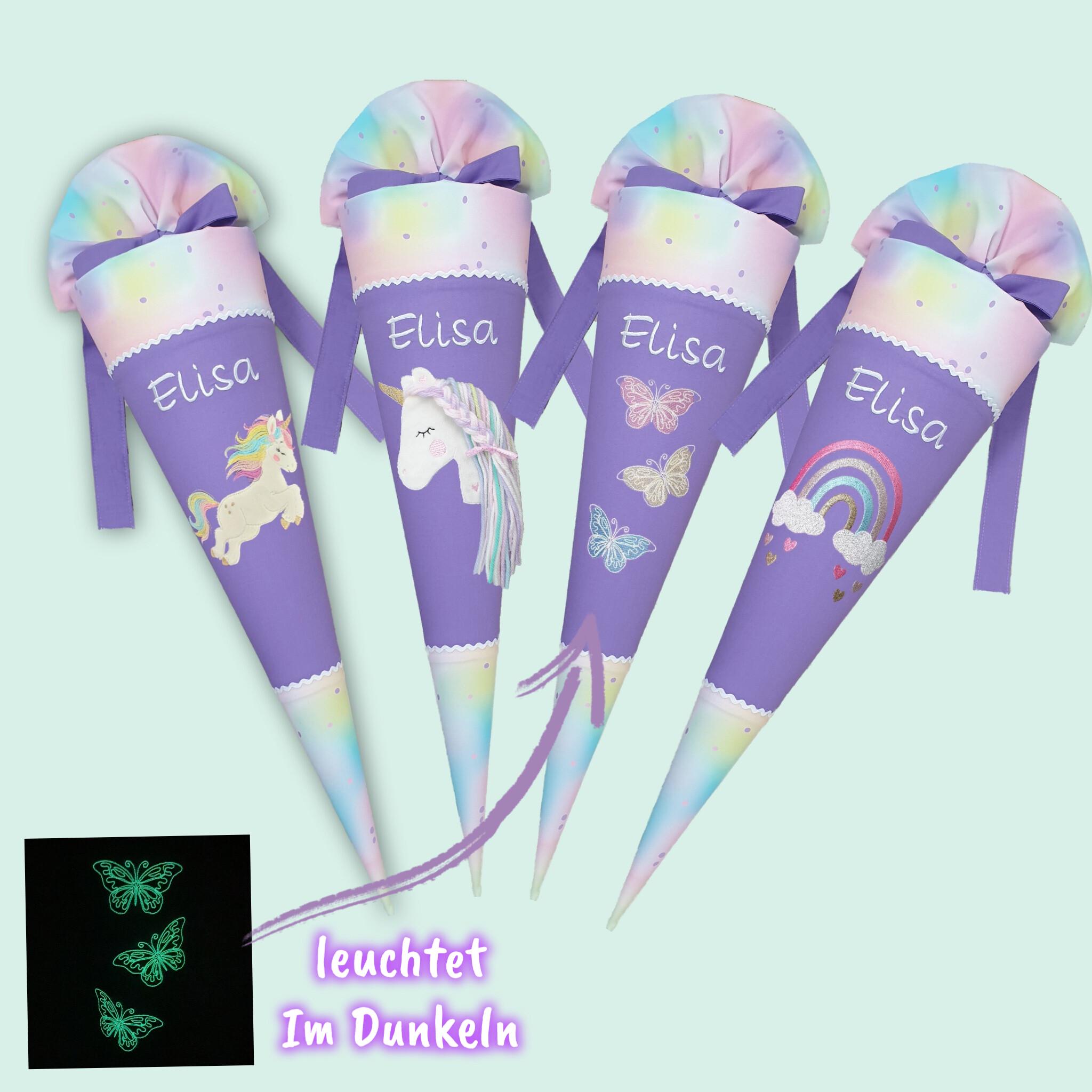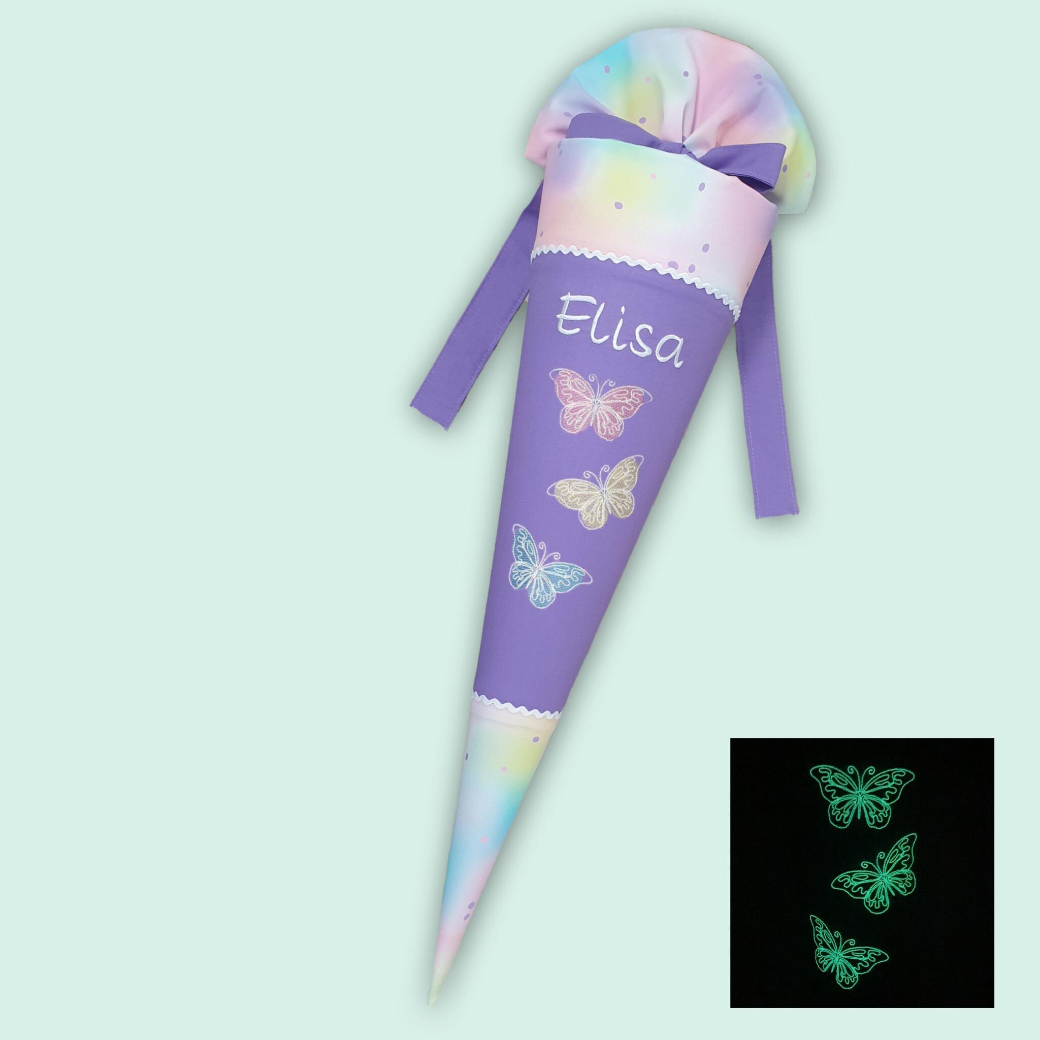 Schultüte mit Wunschmotiv (die Schmetterlinge leuchten im Dunkeln) und Namen farblich auf den Step by step Butterfly Luna abgestimmt.