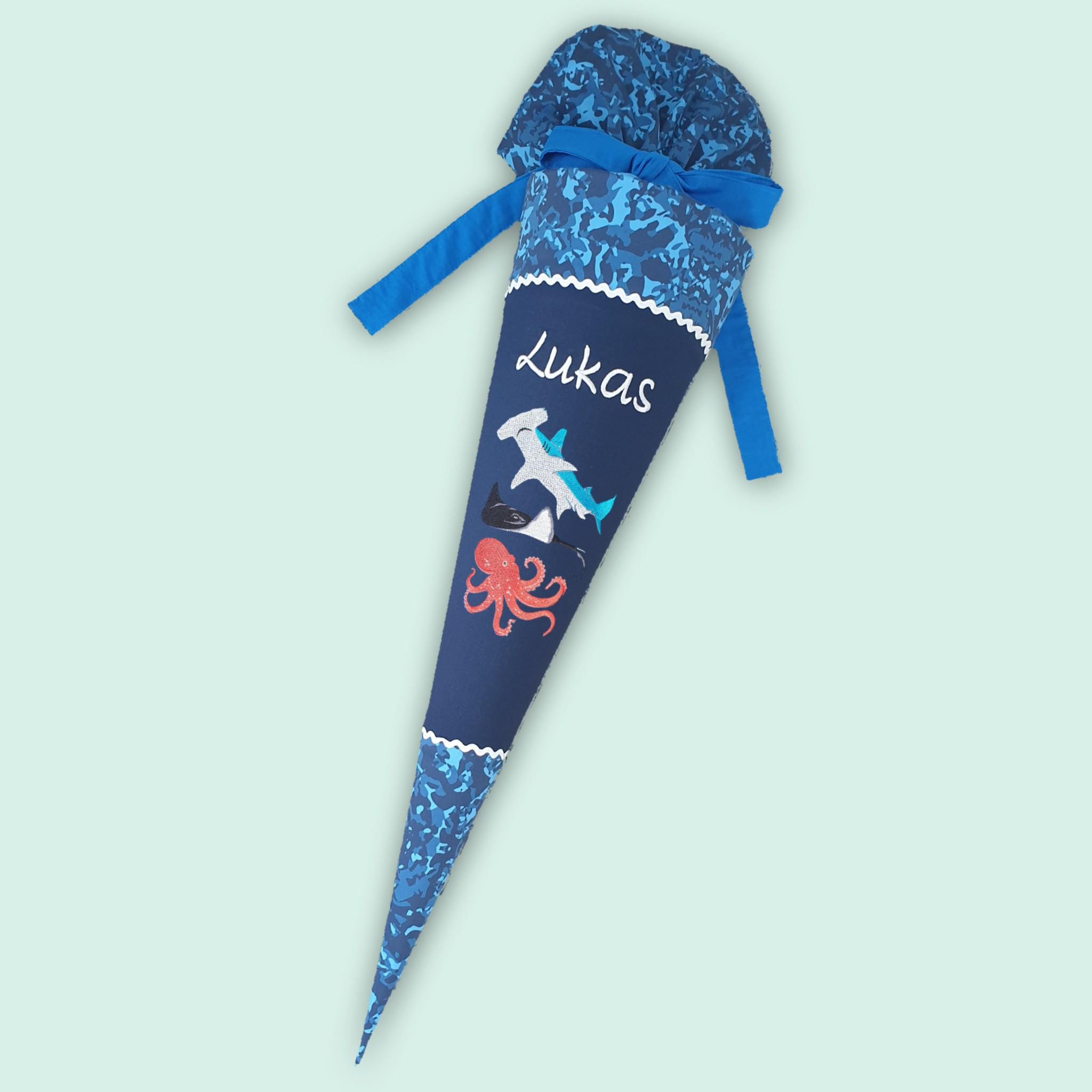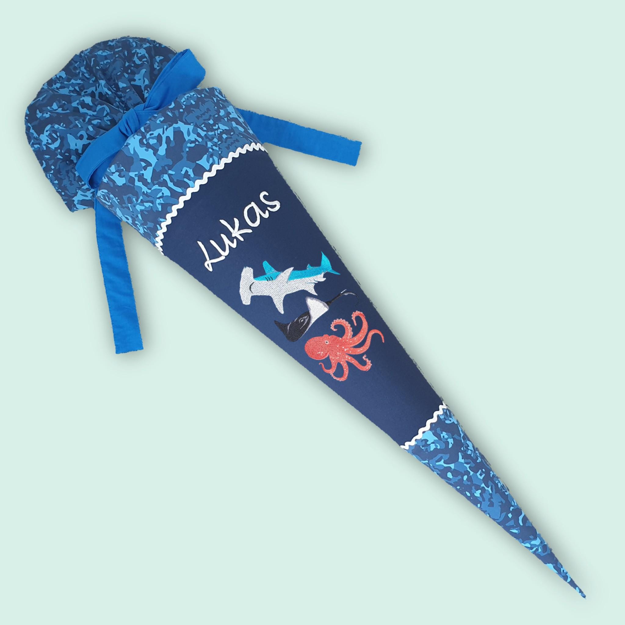 Schultüte mit Rochen Oktopus und Hammerhai und Namen farblich auf den Manta Rio Schulranzen abgestimmt.