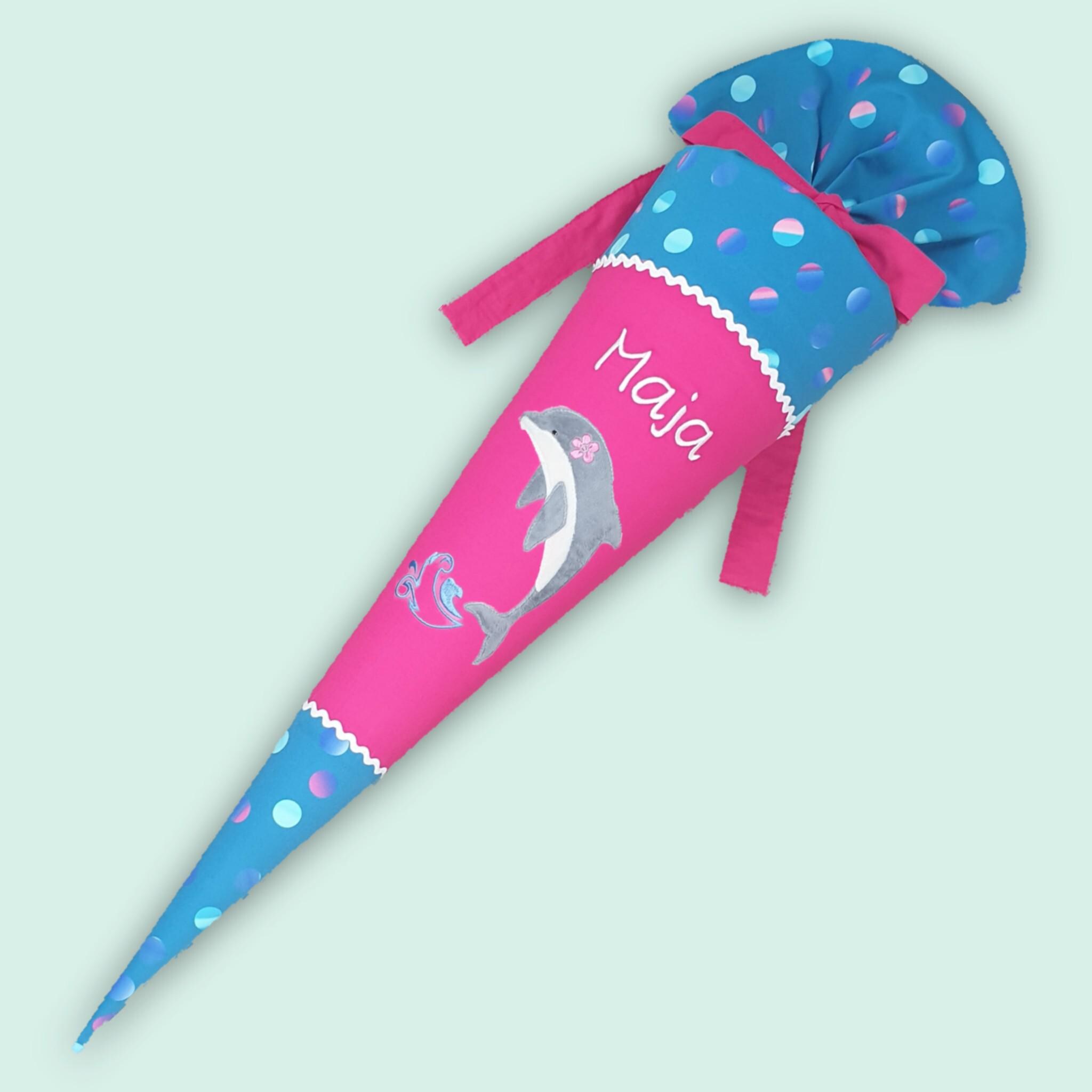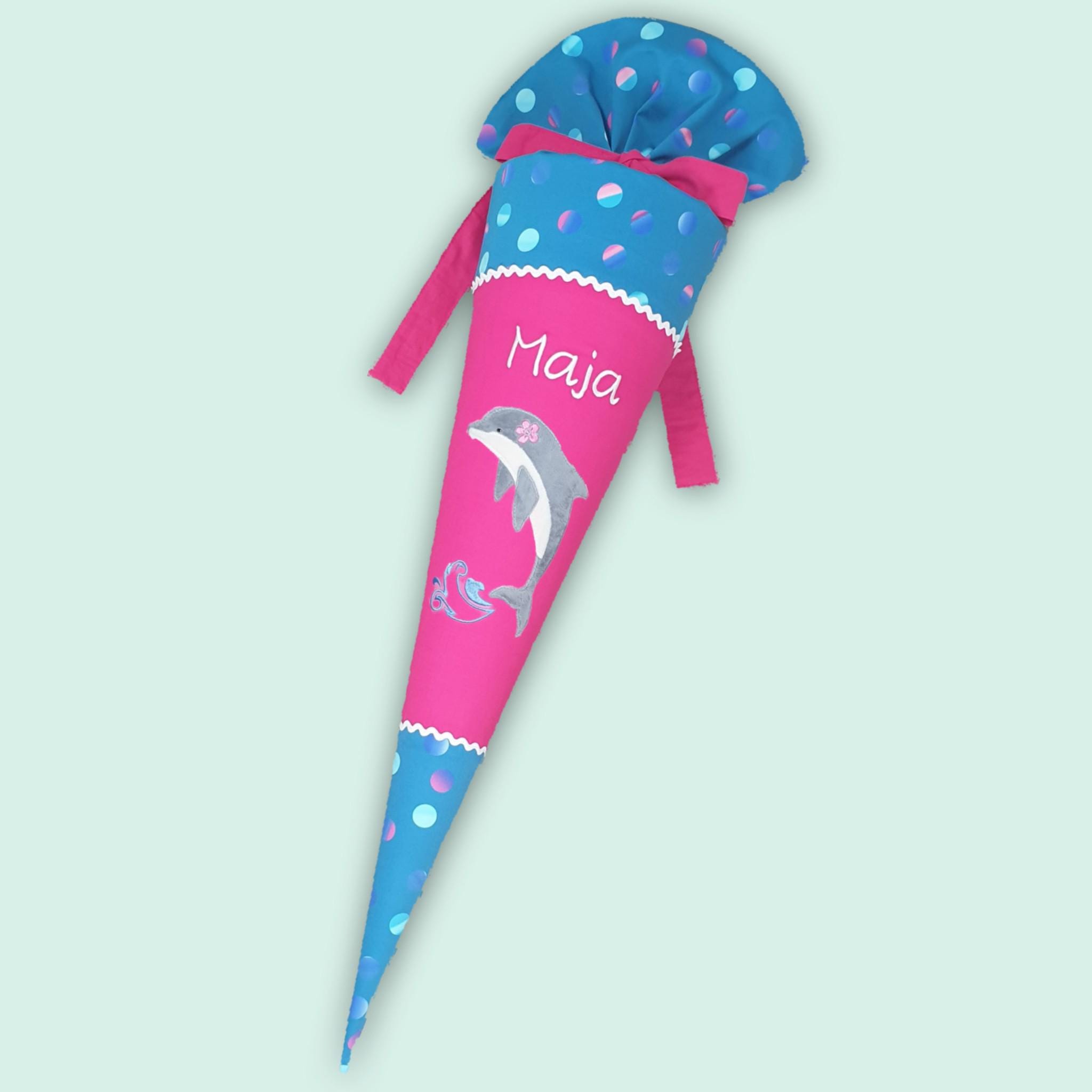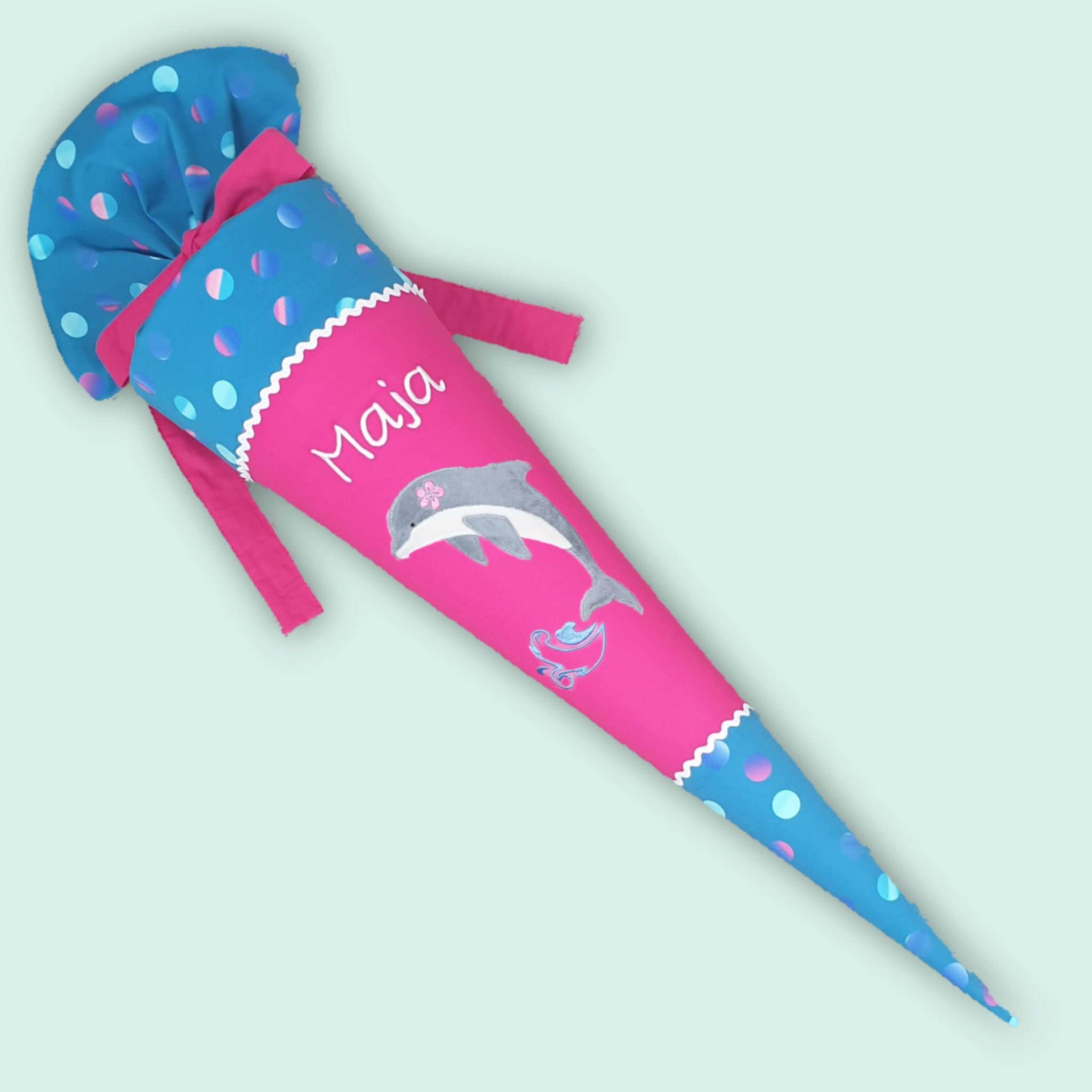 70 cm Schultüte oder 85 cm Schultüte mit Delfin und Namen farblich auf den Step by step Dolphin Finja Schulranzen abgestimmt.