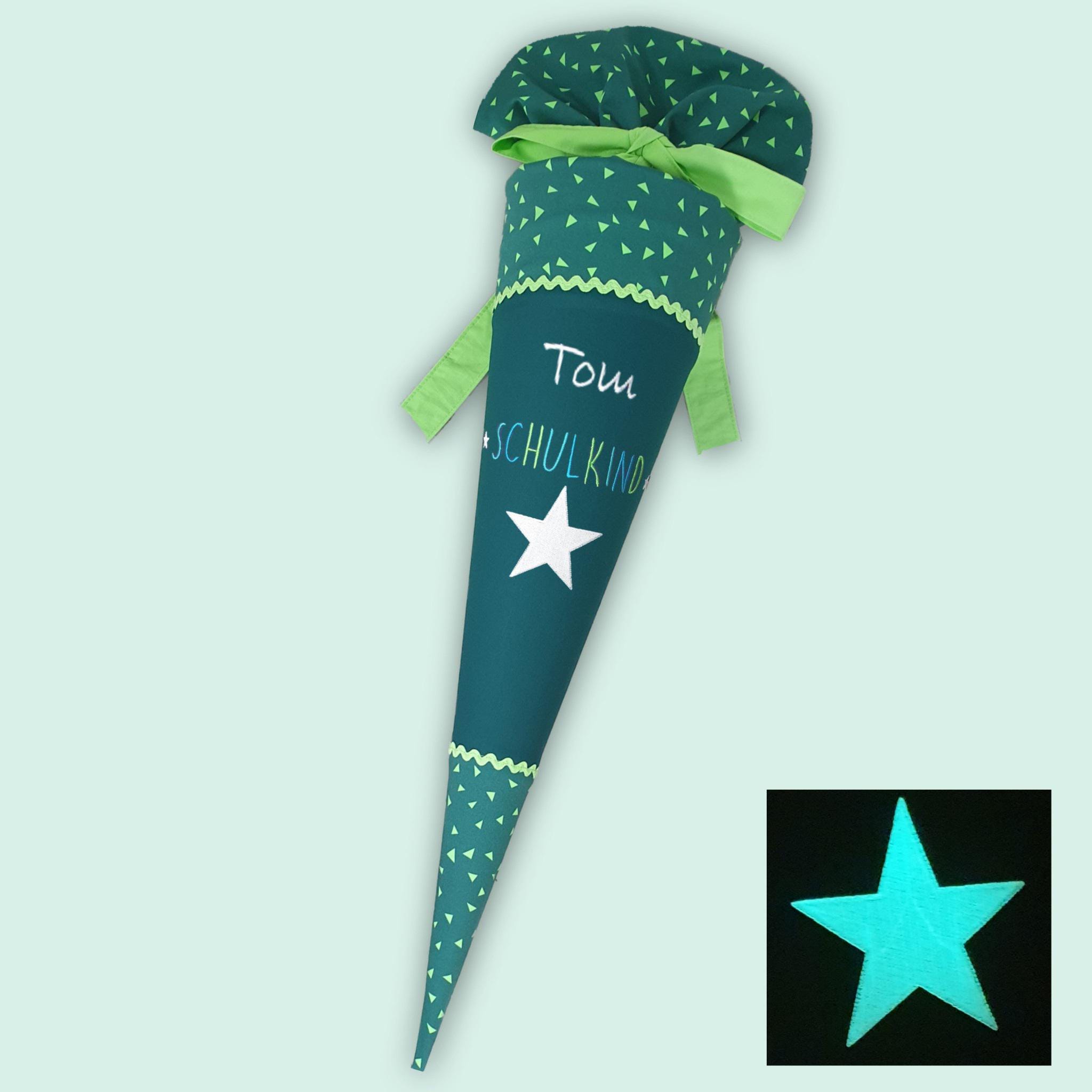 Schultüte mit Schulkind und Namen (leuchtet im Dunkeln) farblich auf den Green Grafics Schulranzen abgestimmt.
