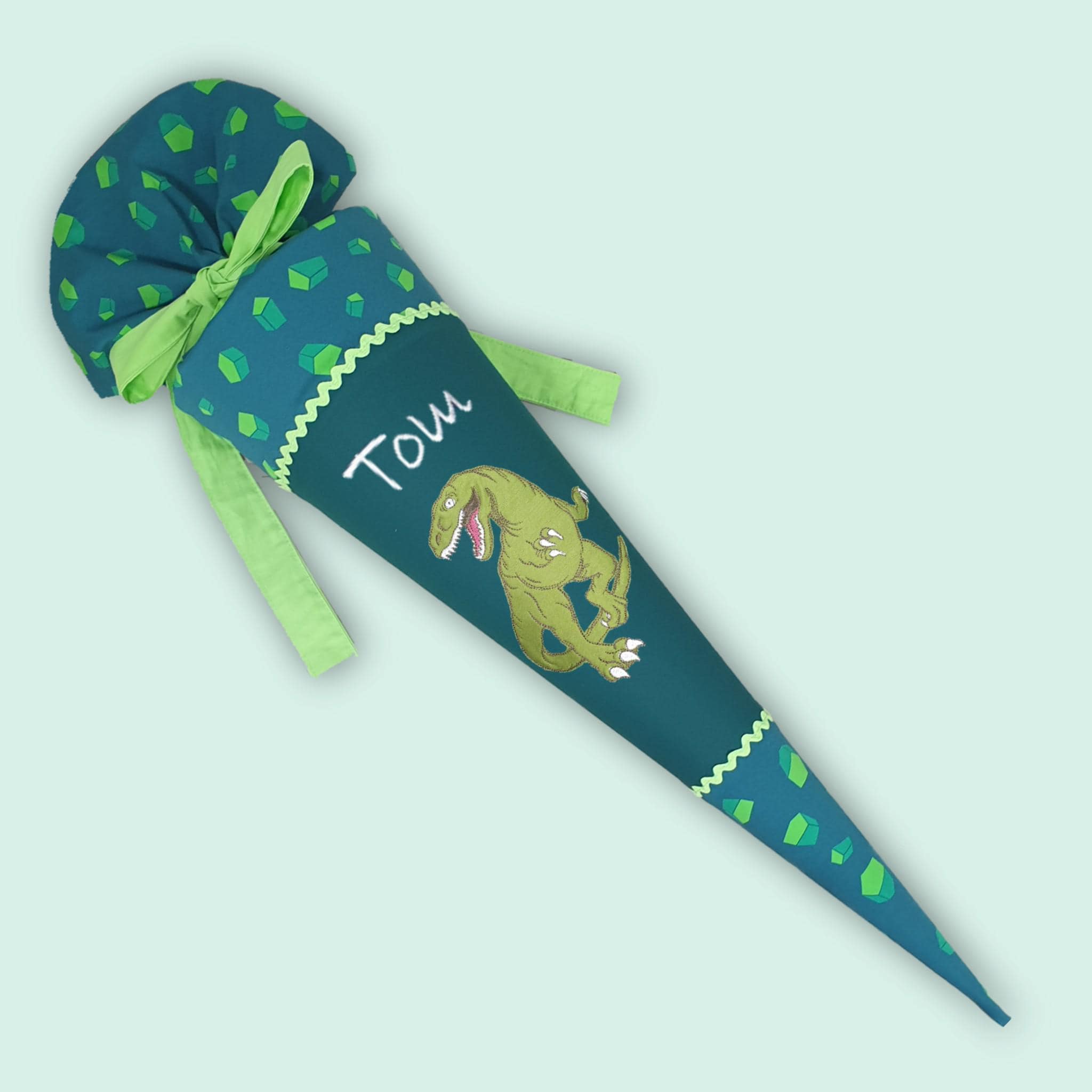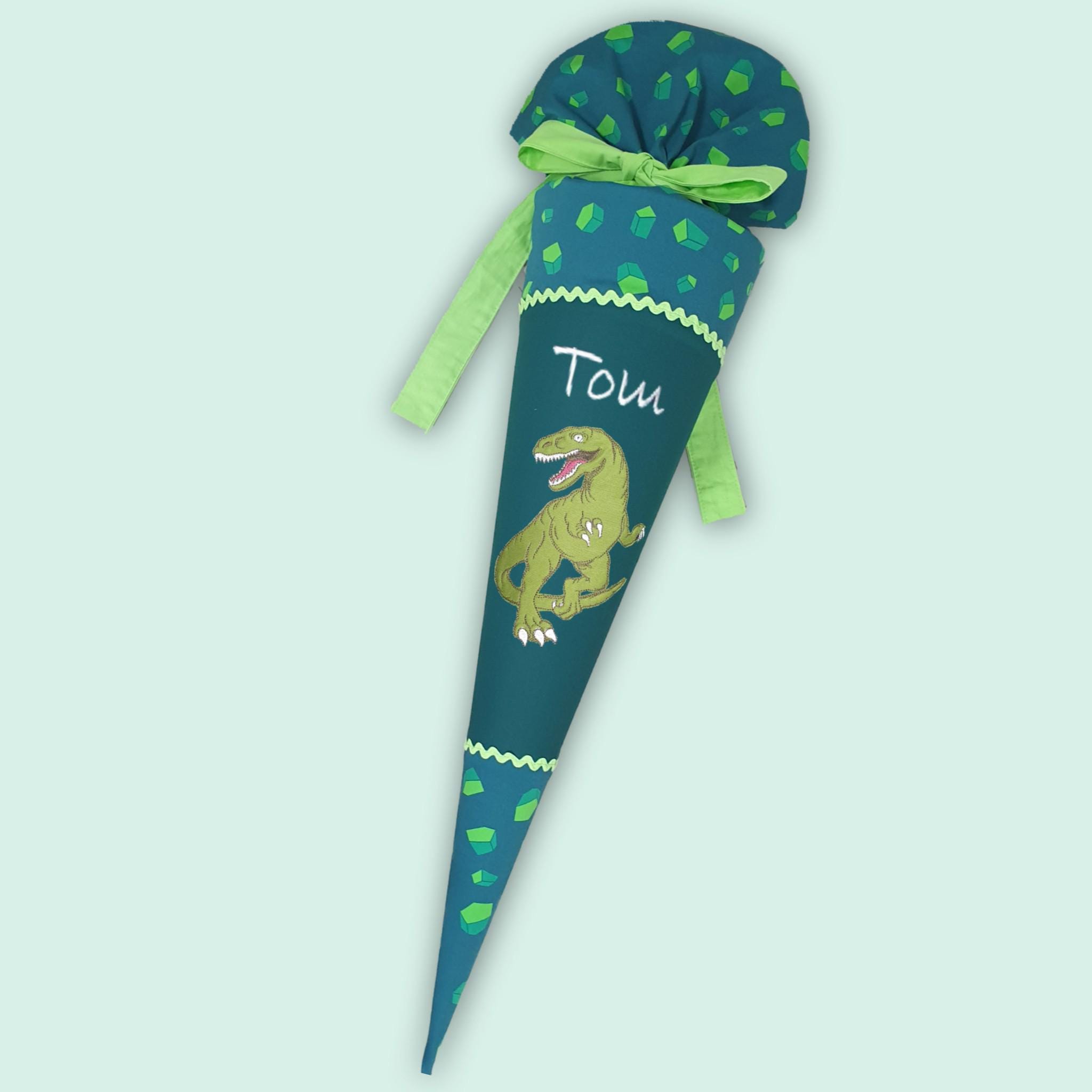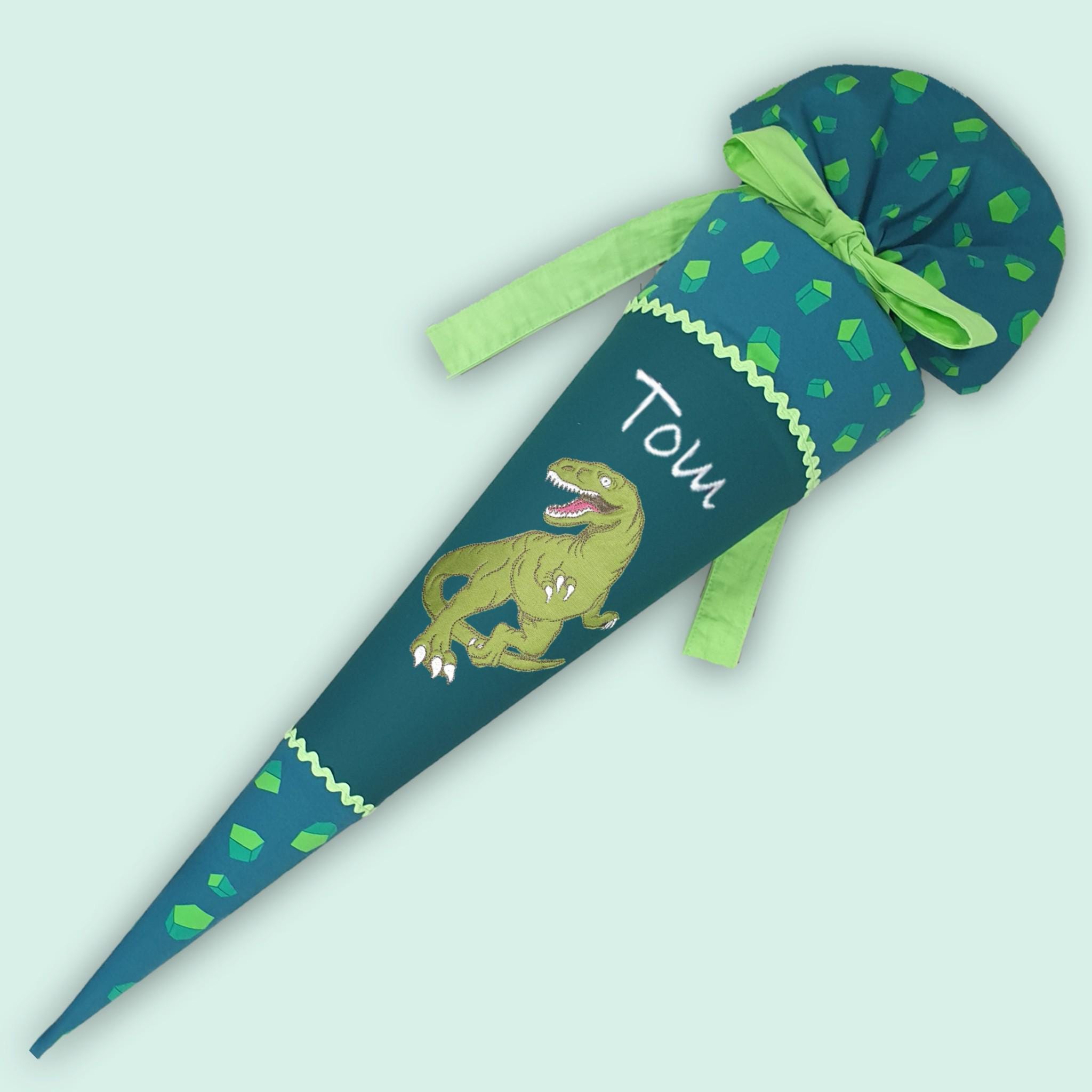 Schultüte mit Dino und Namen farblich auf den Dino Targo Schulranzen abgestimmt.