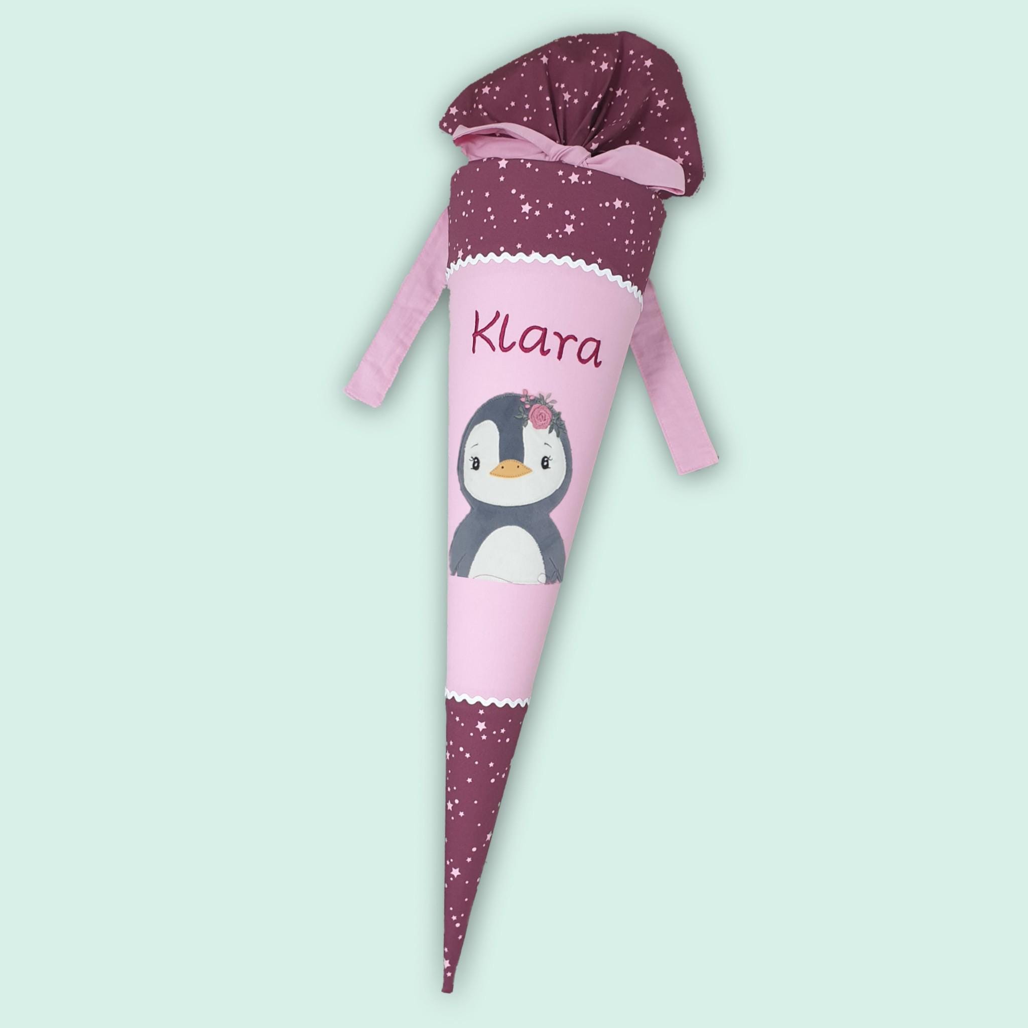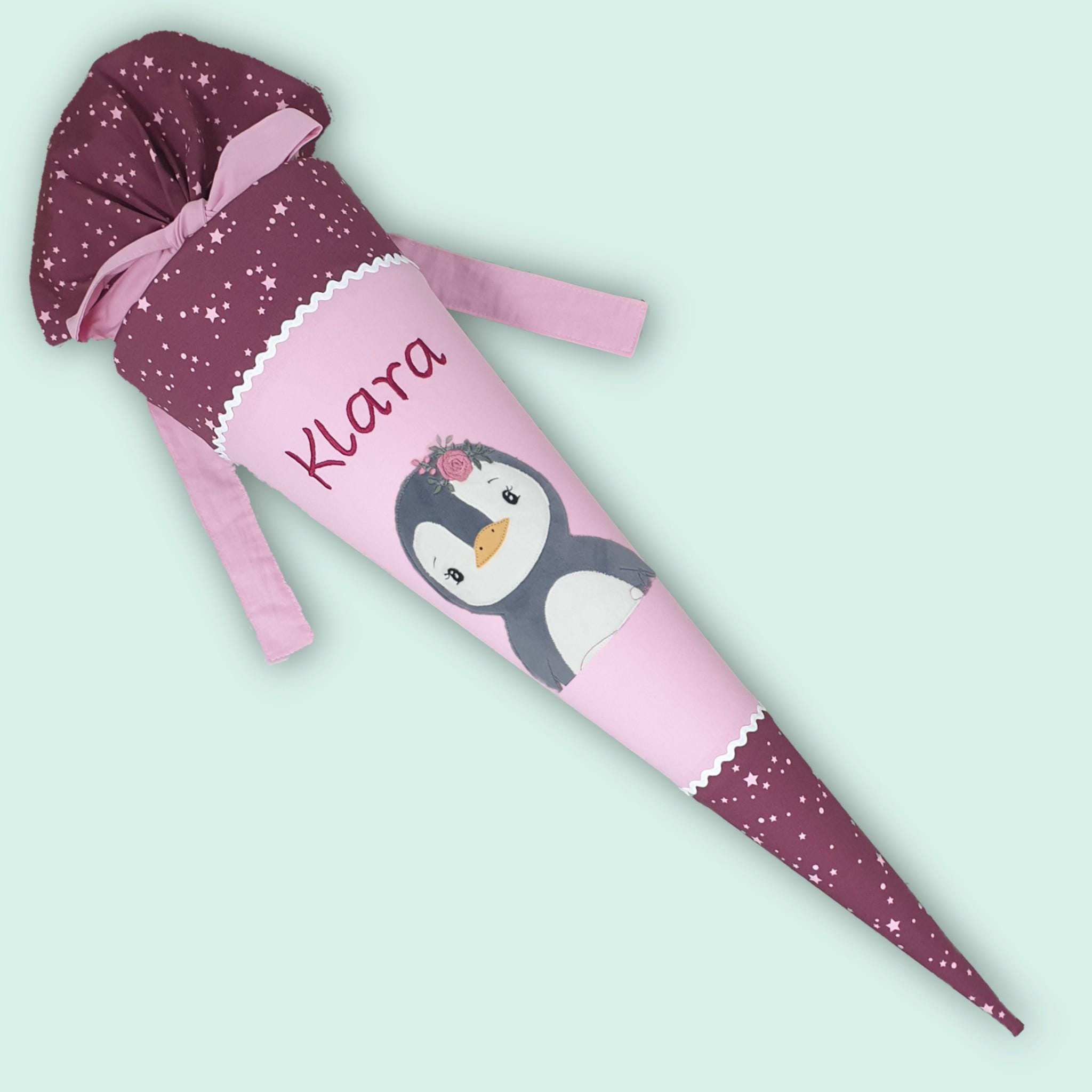 Schultüte Pinguin und Namen farblich auf den Berry Stars Schulranzen abgestimmt.