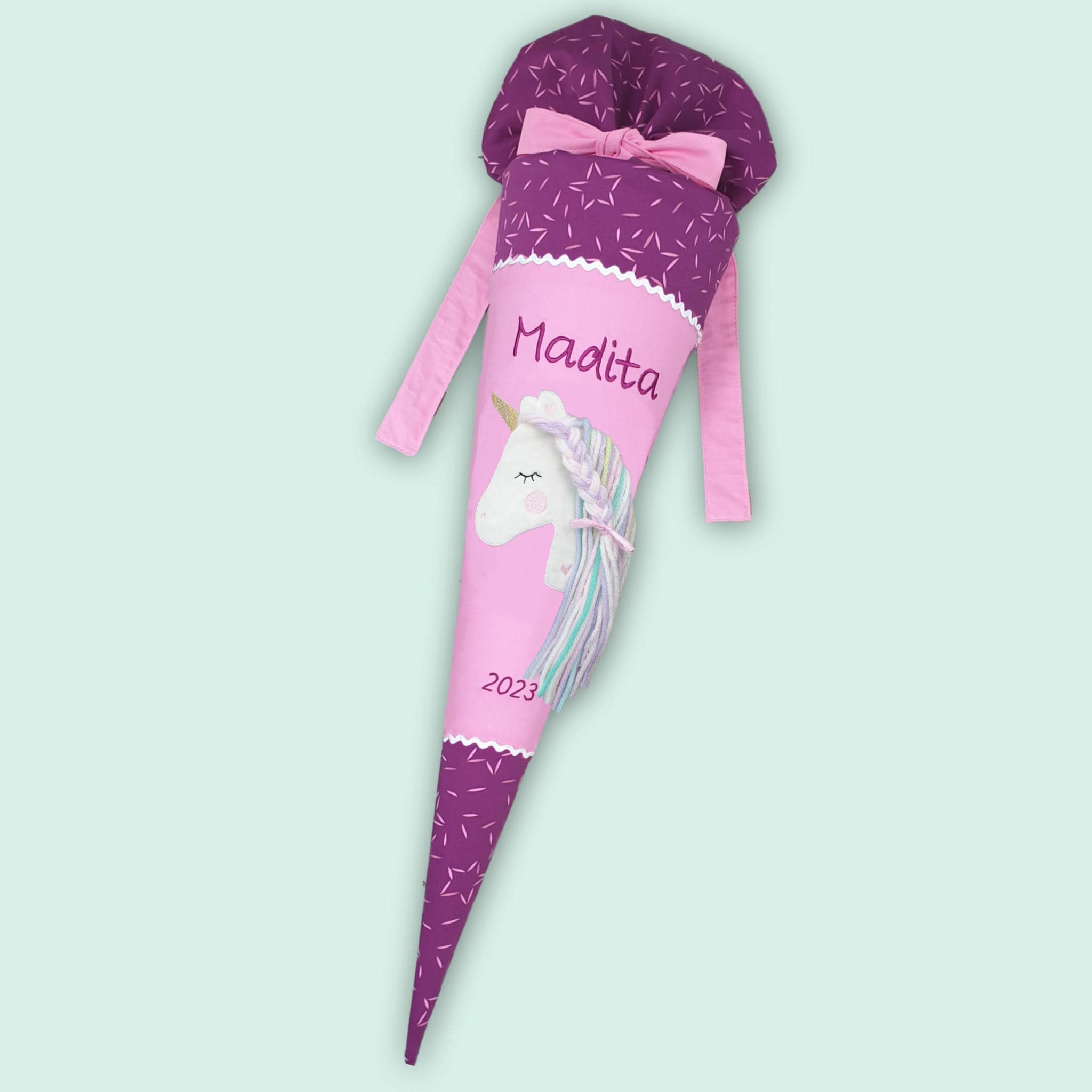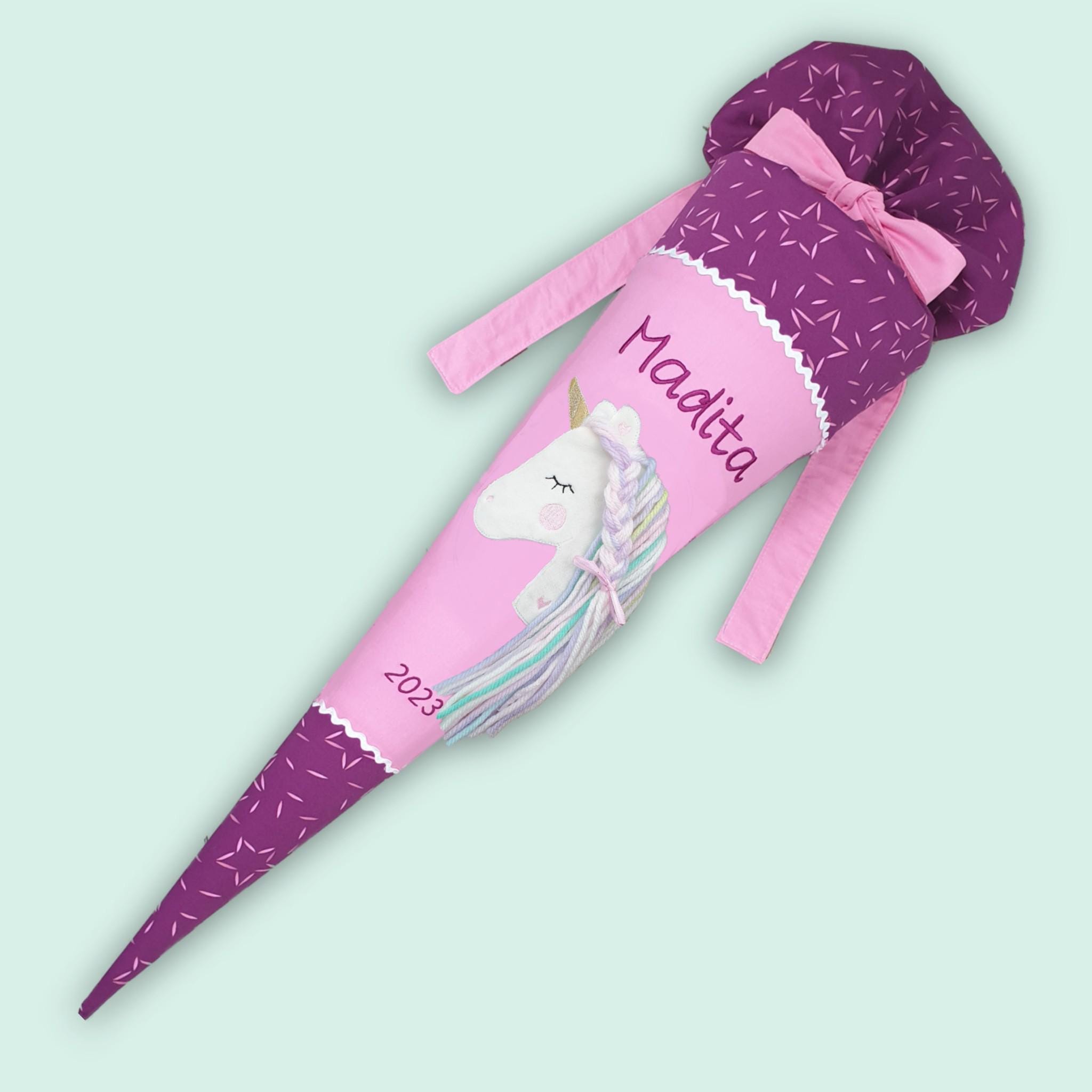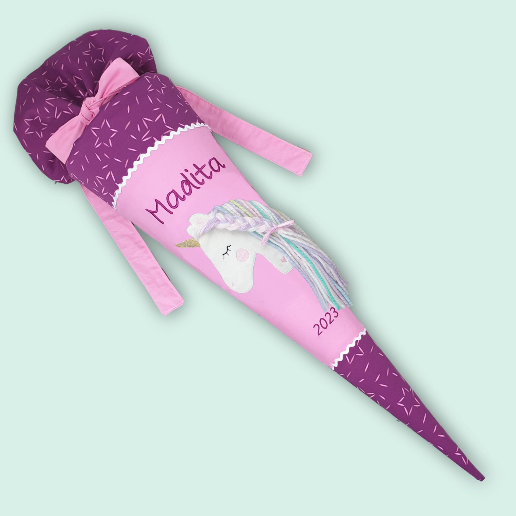 Schultüte mit Einhorn und Namen farblich auf den Pretty Unicorn Nuala Schulranzen abgestimmt.