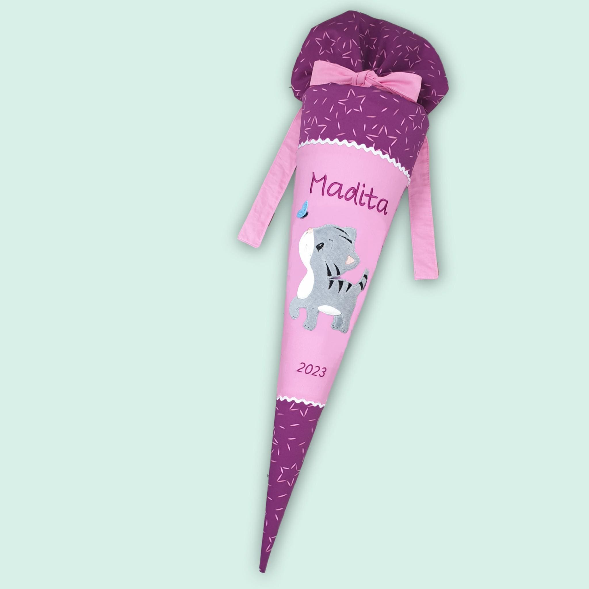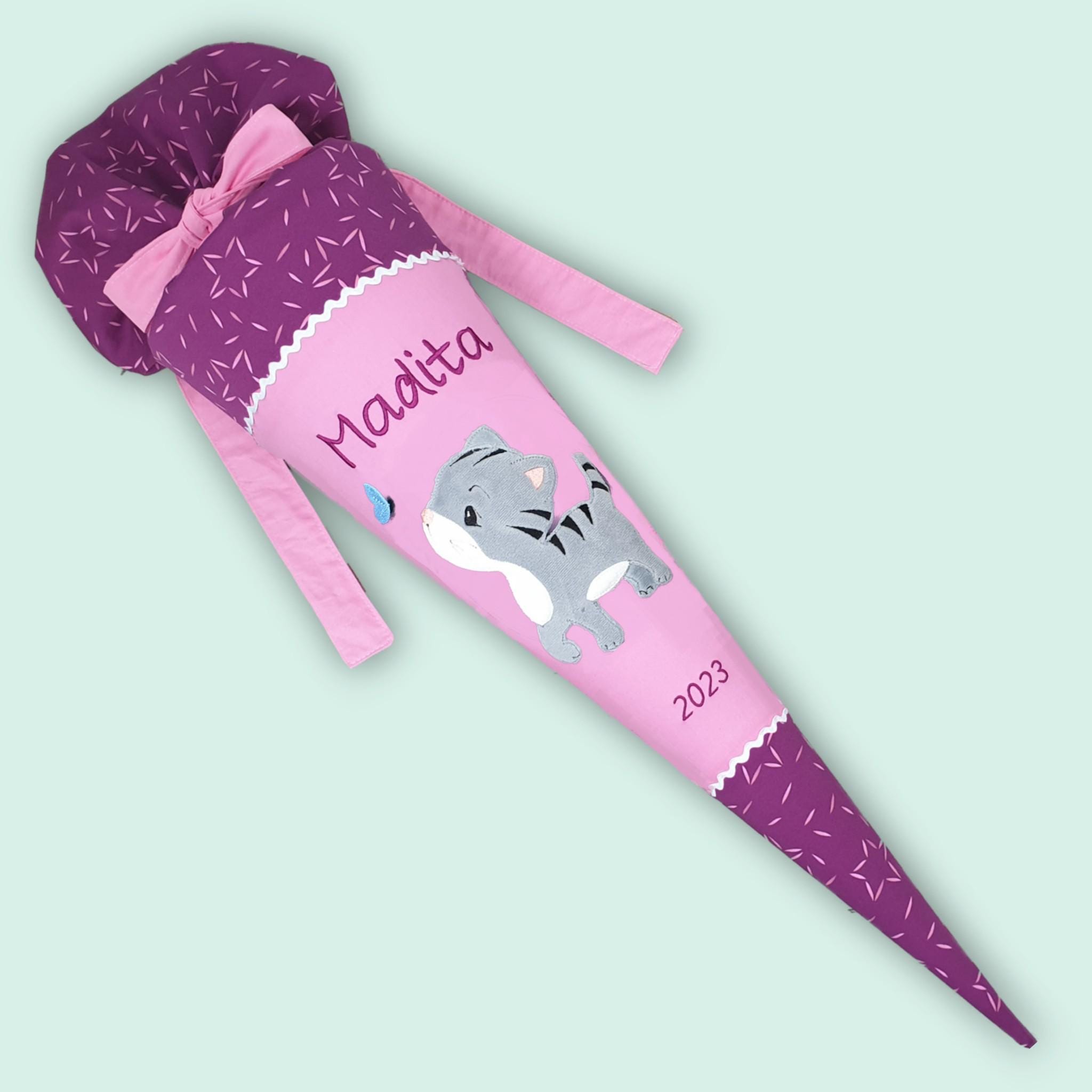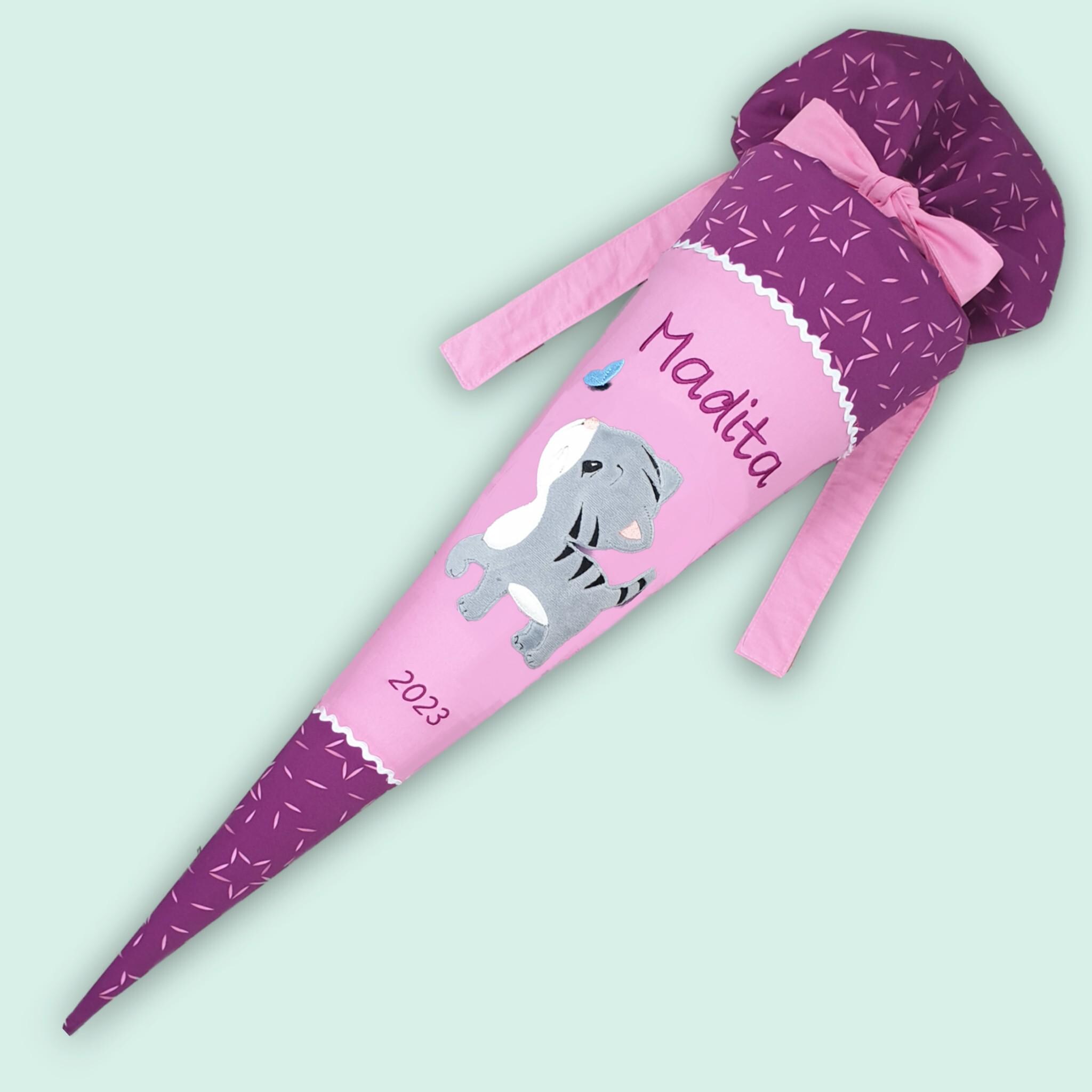 Schultüte mit Katze und Namen farblich auf den Pretty Unicorn Nuala Schulranzen abgestimmt.