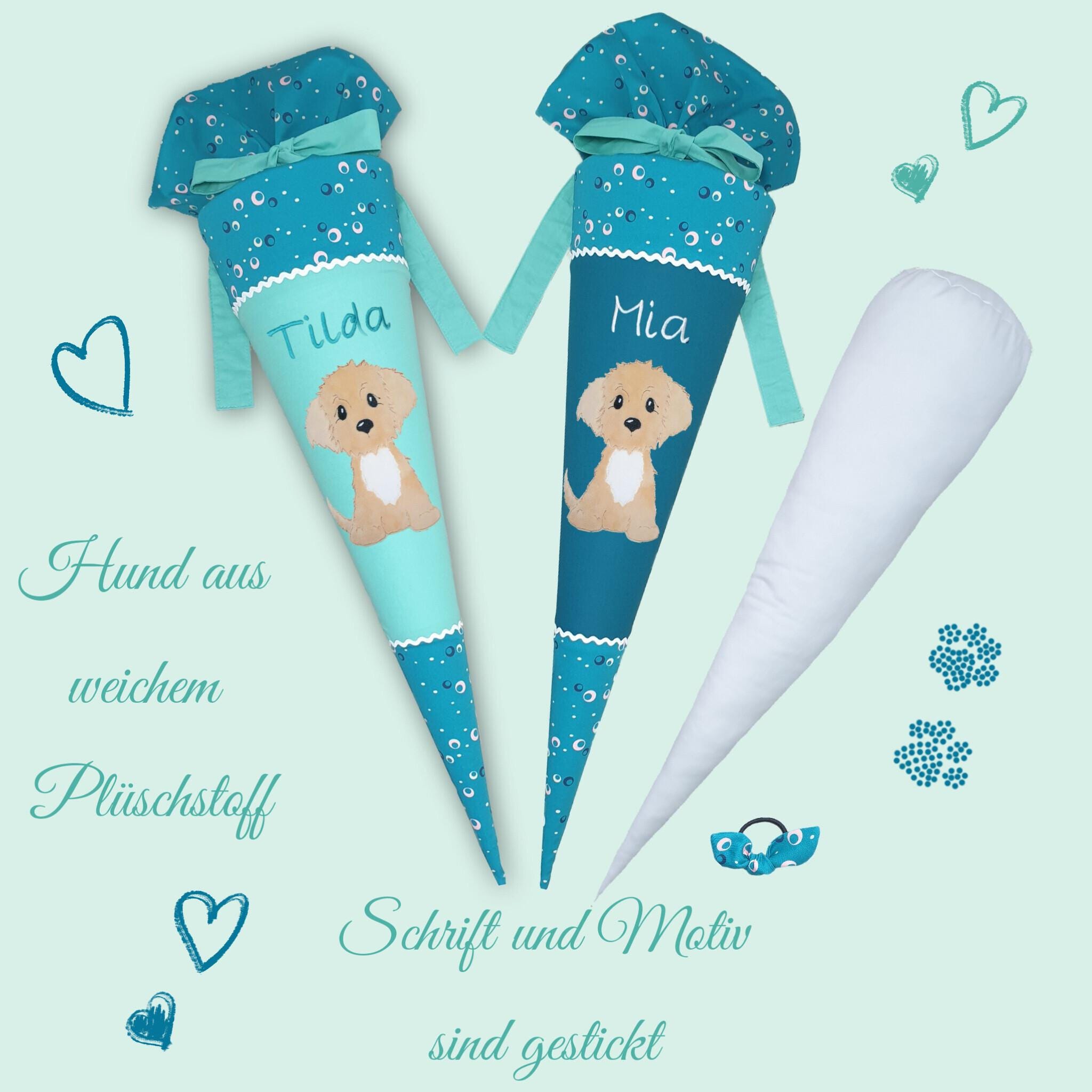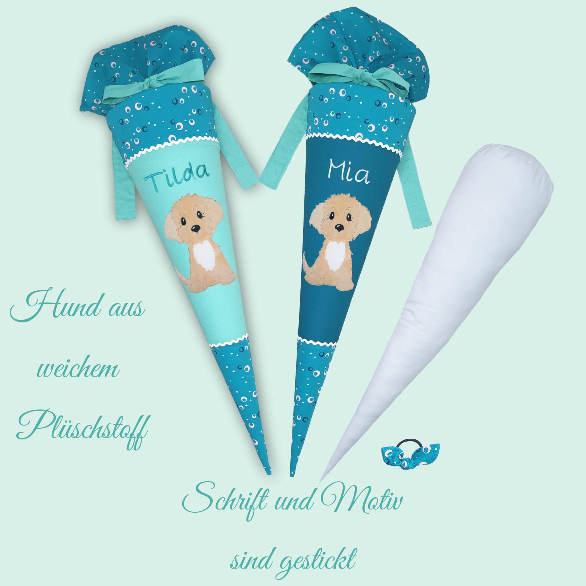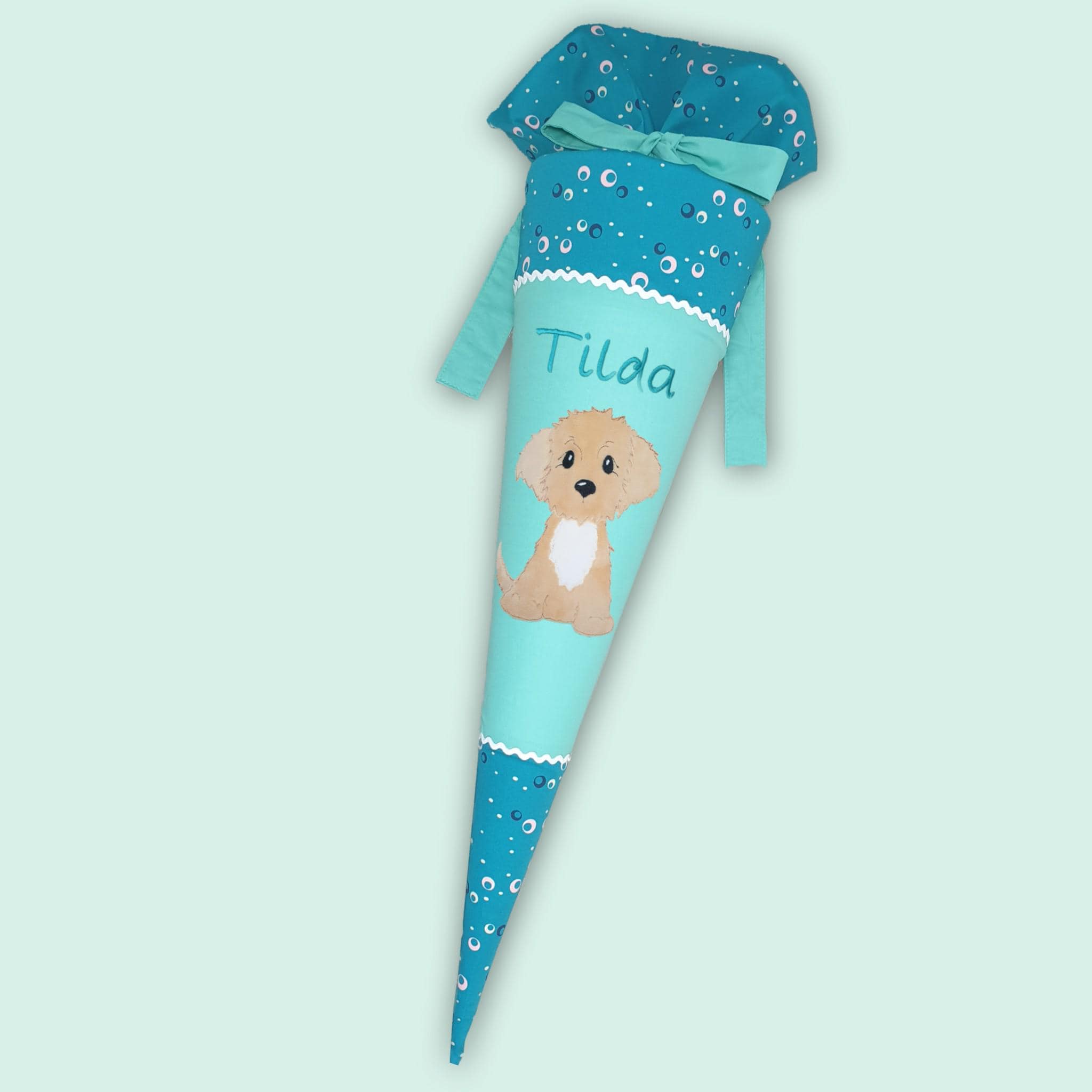 Schultüte mit Wunschmotiv und Namen farblich auf den Dog Basty abgestimmt.