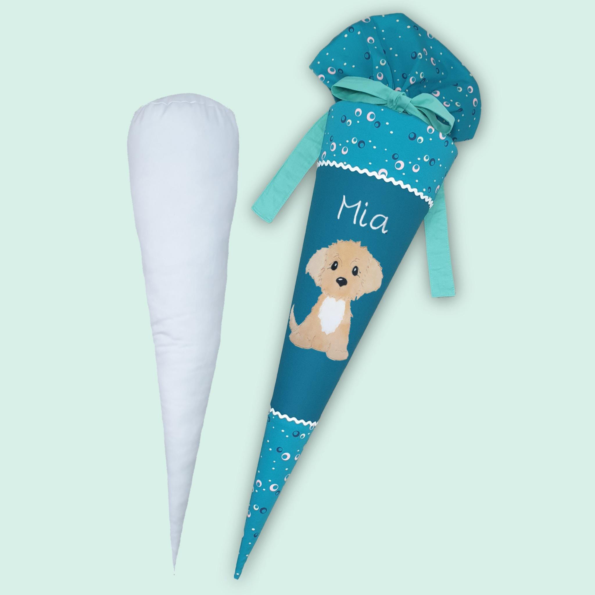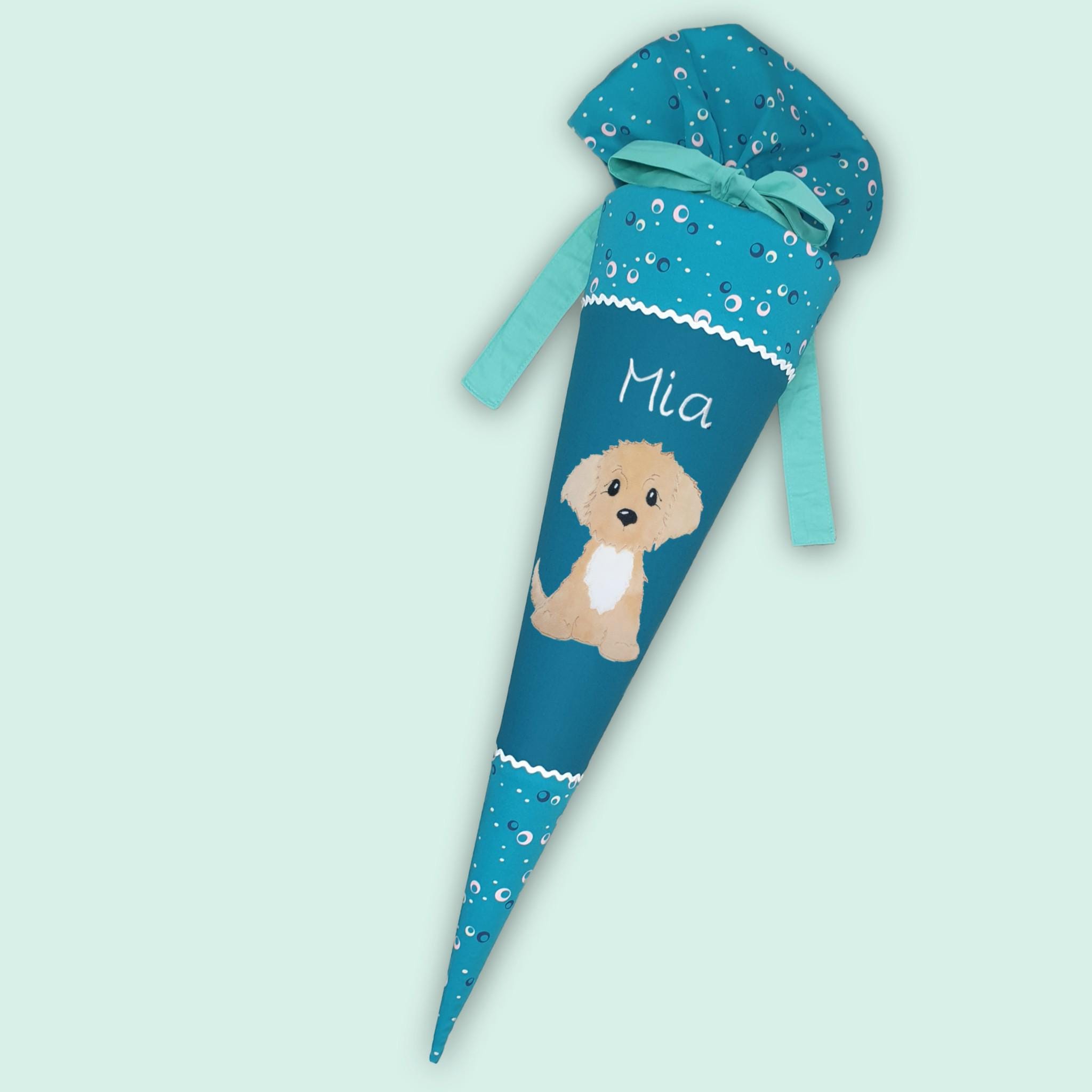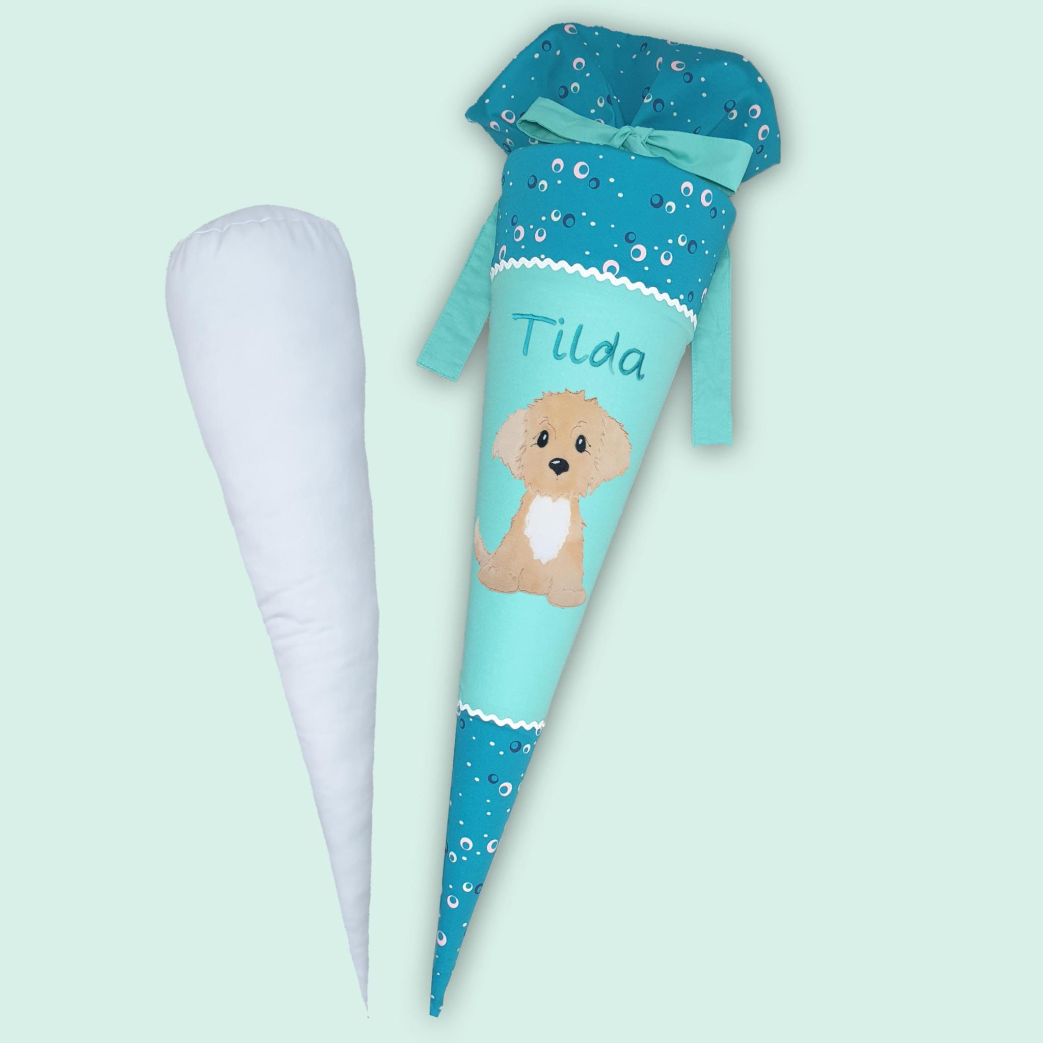 Schultüte mit Wunschmotiv und Namen farblich auf den Dog Basty abgestimmt.