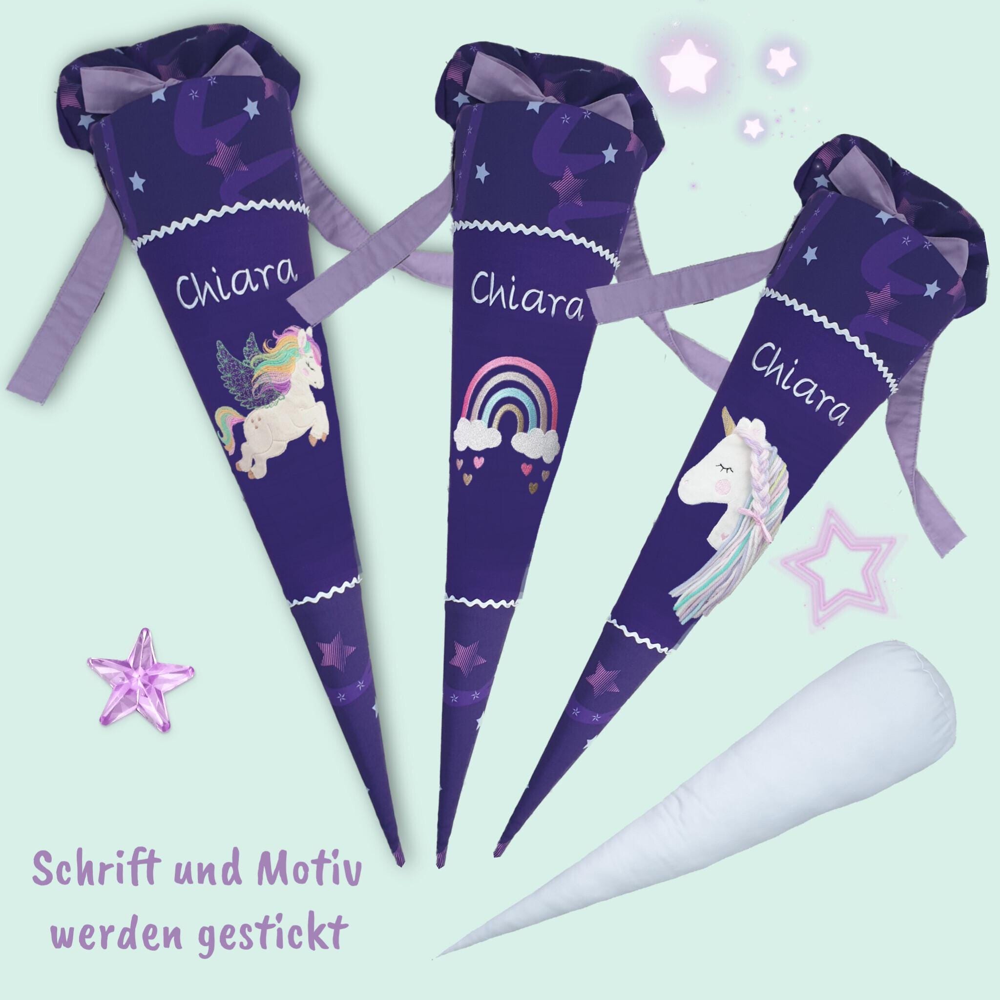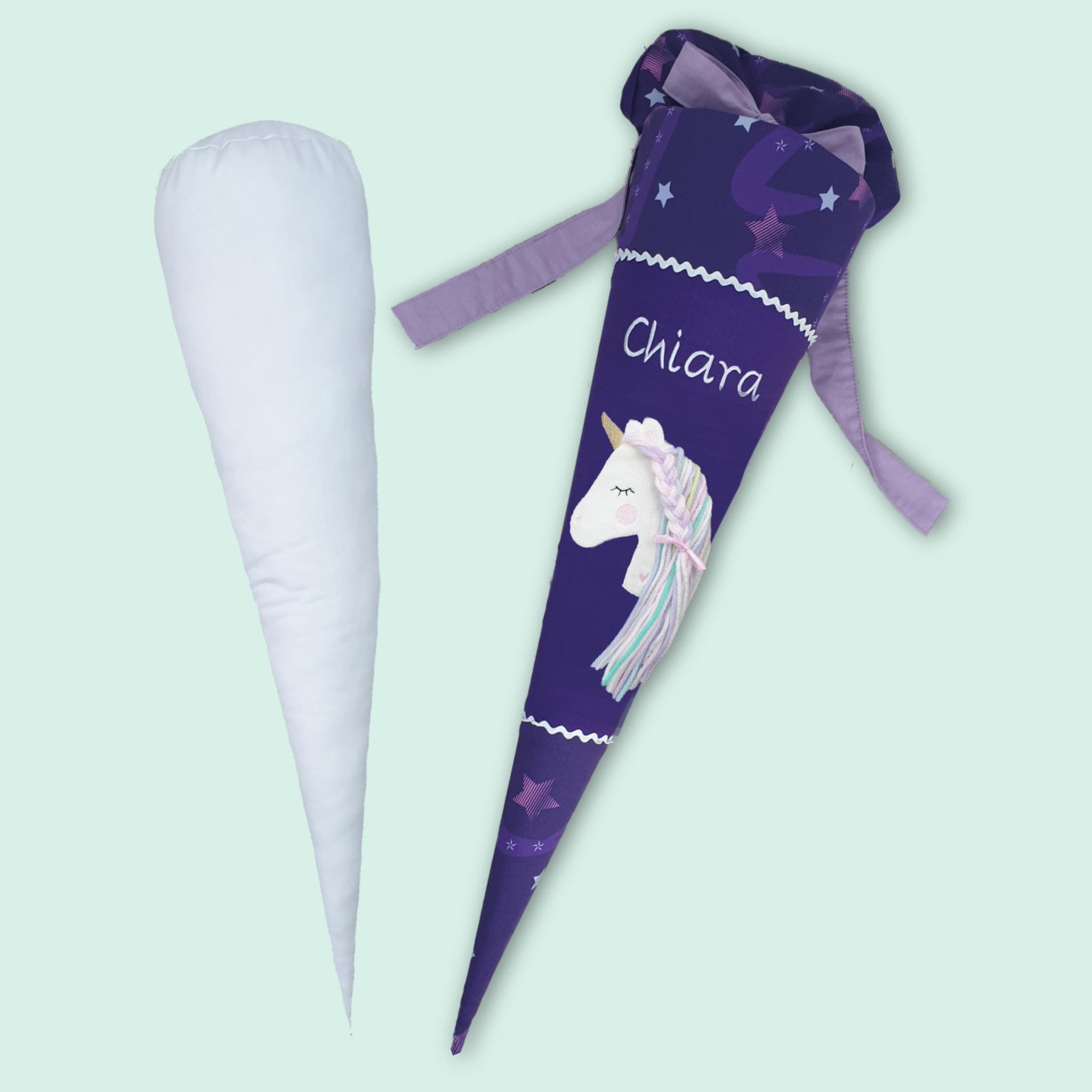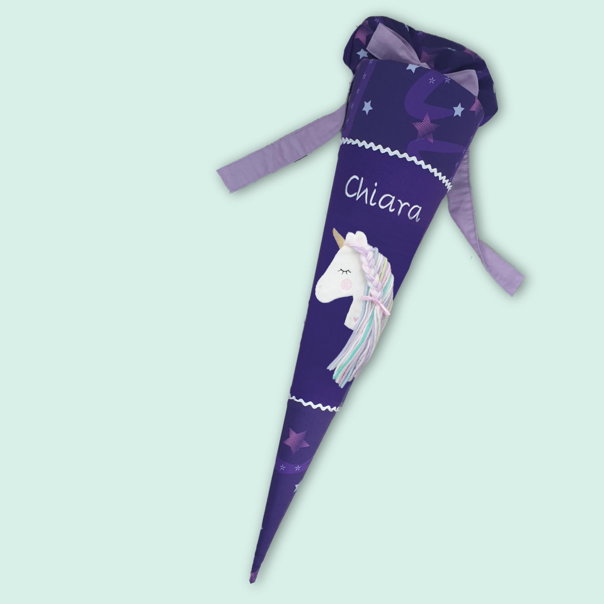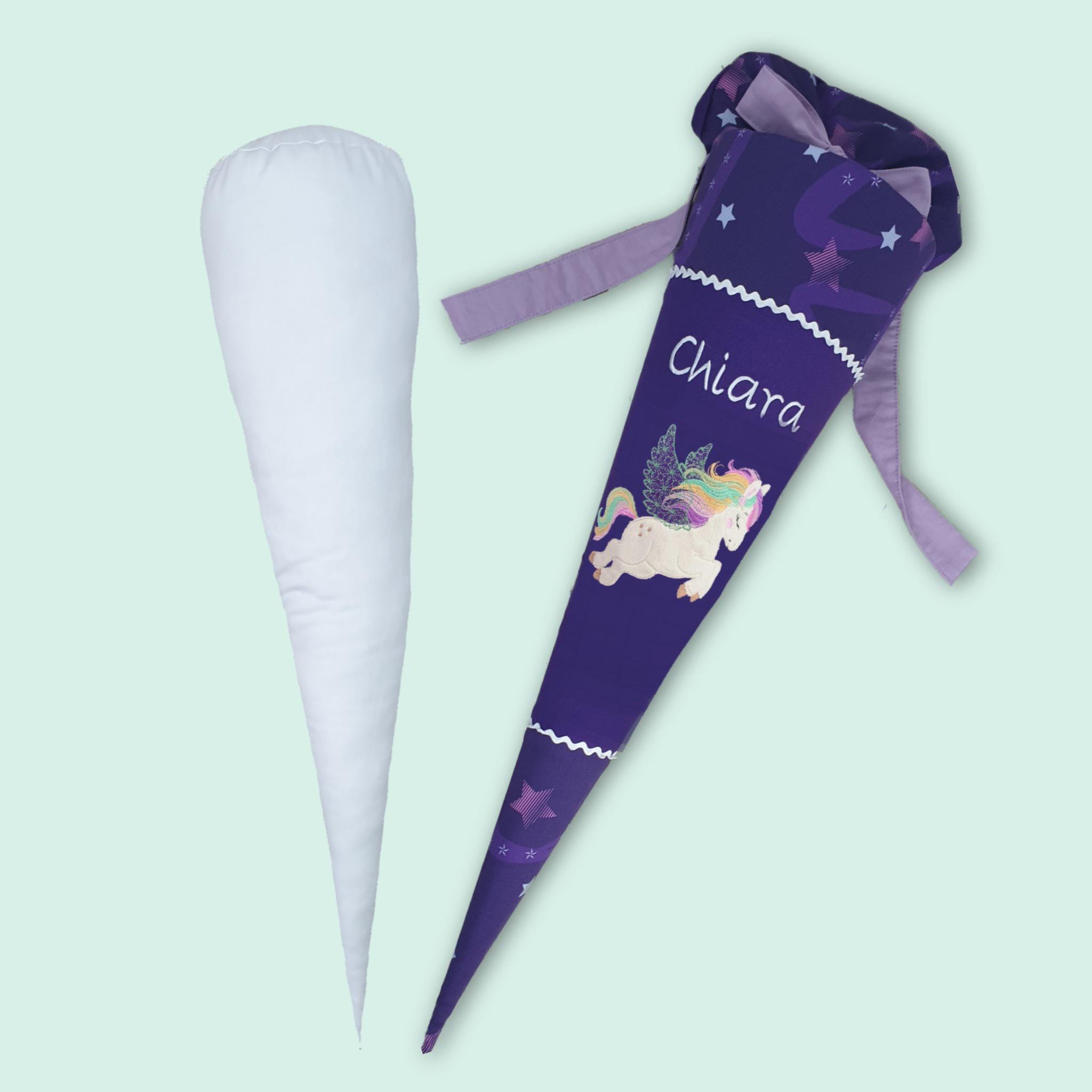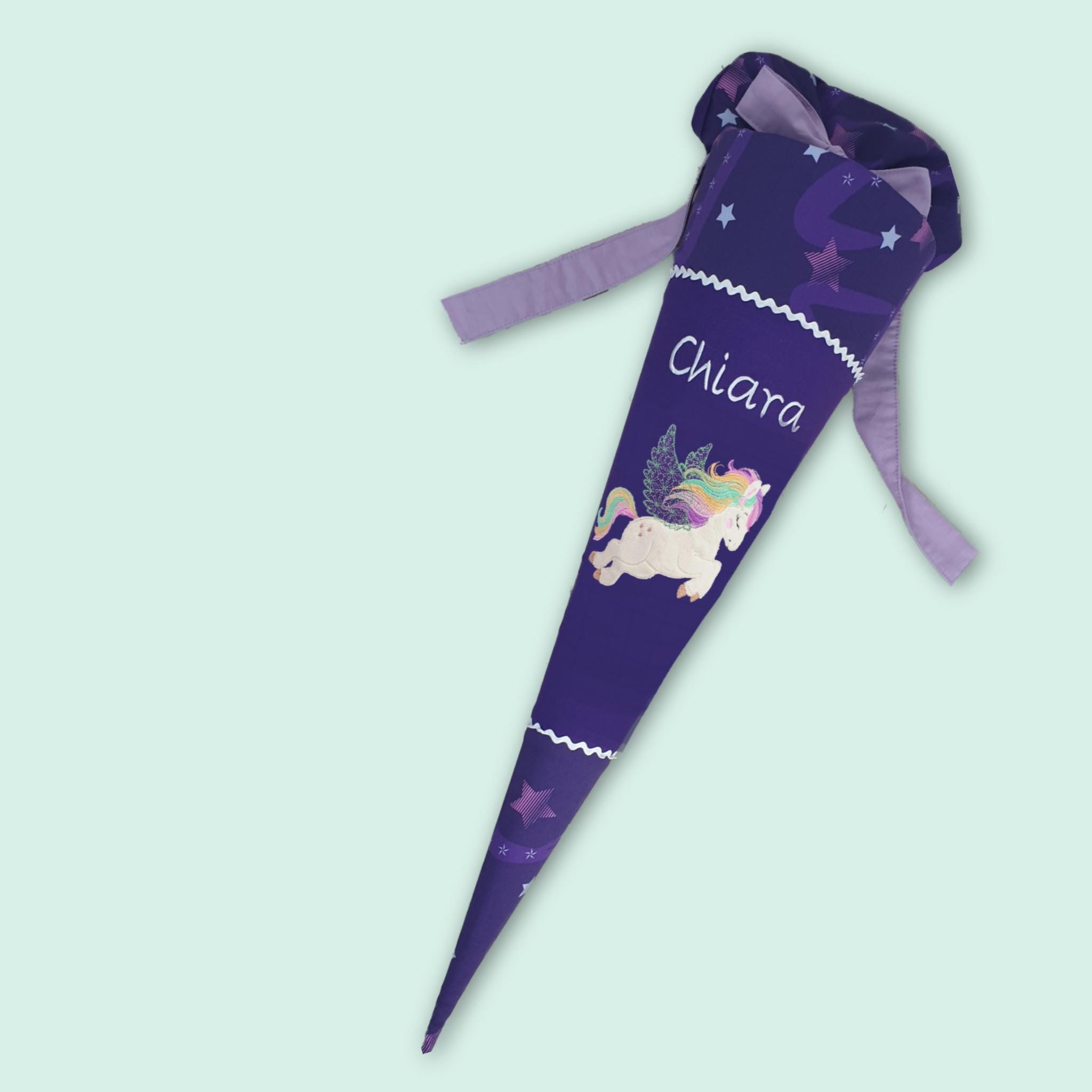 Schultüte mit Wunschmotiv und Namen farblich auf den Pegasus Emily abgestimmt.