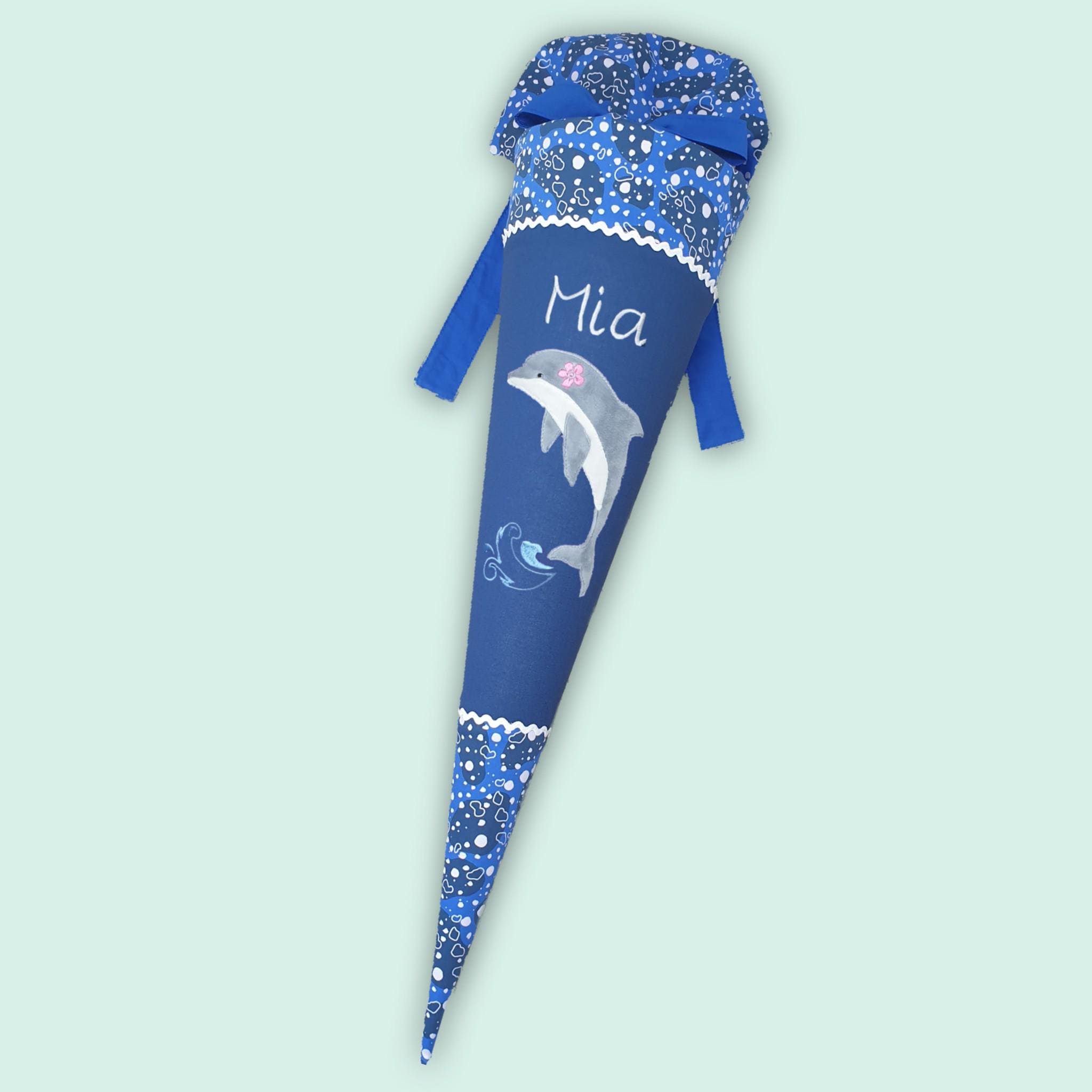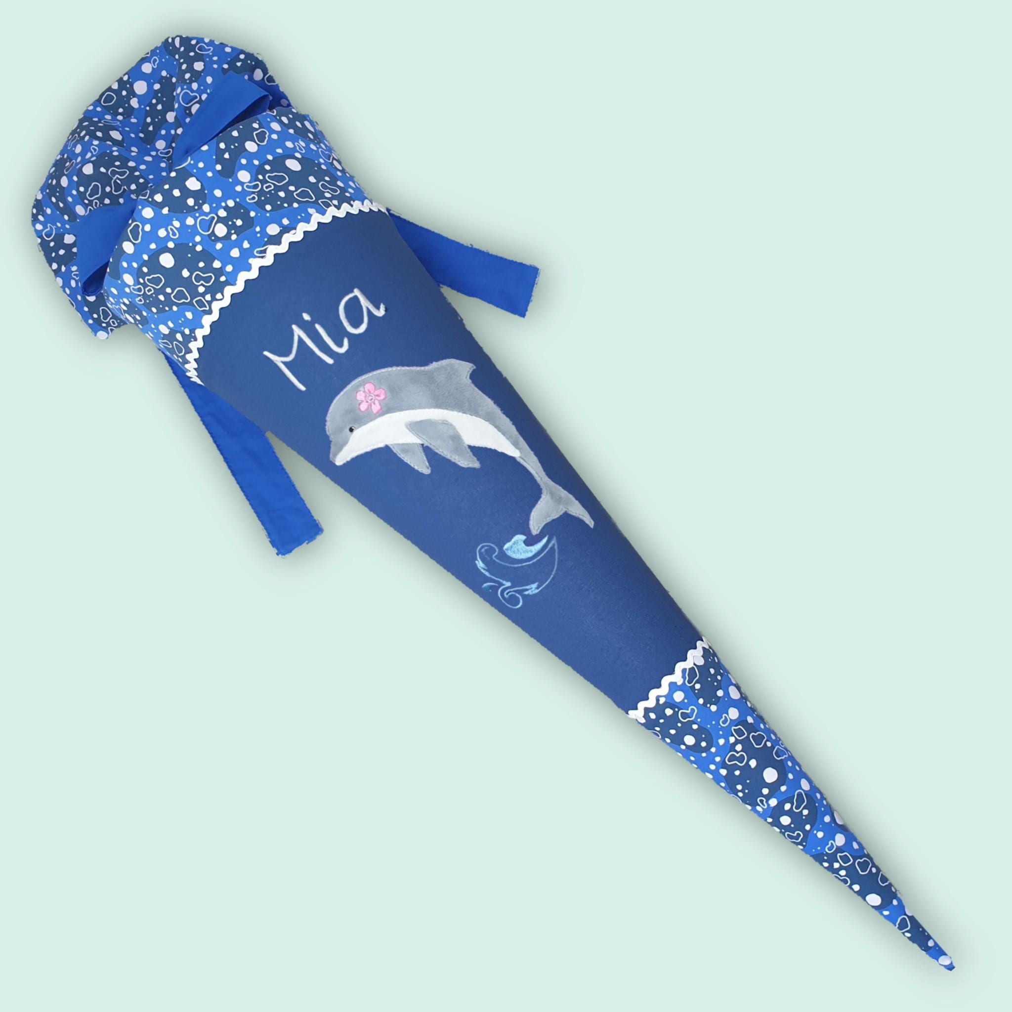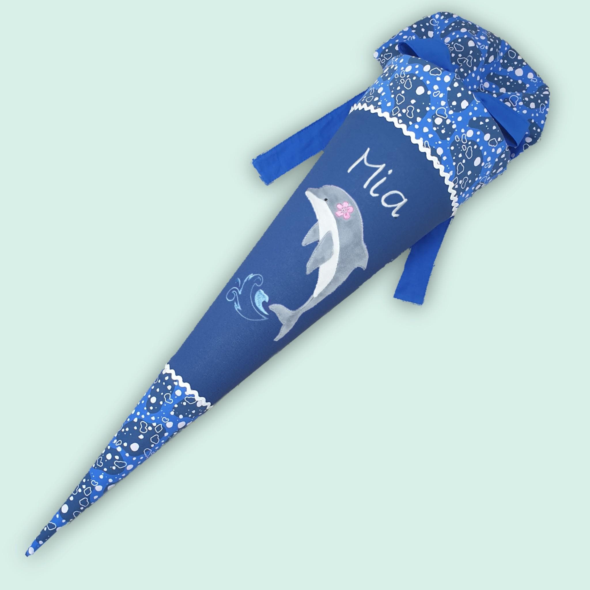 70 cm Schultüte oder 85 cm Schultüte mit Delfin und Namen farblich auf den Ozeanbärwohner Schulranzen abgestimmt.