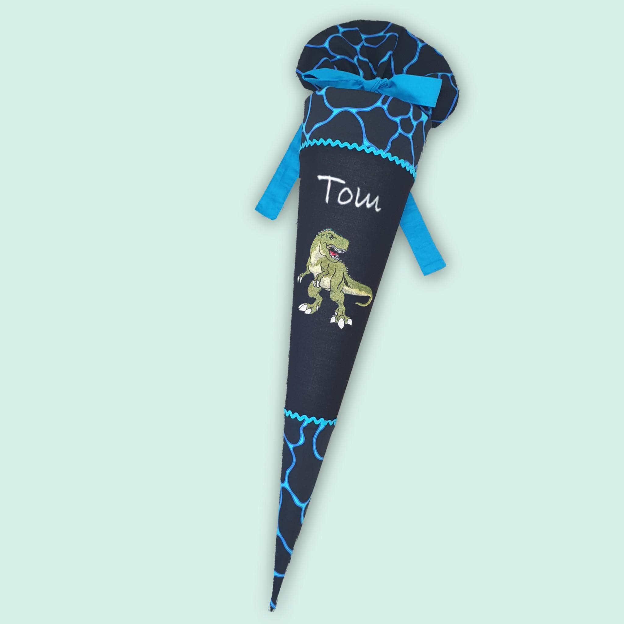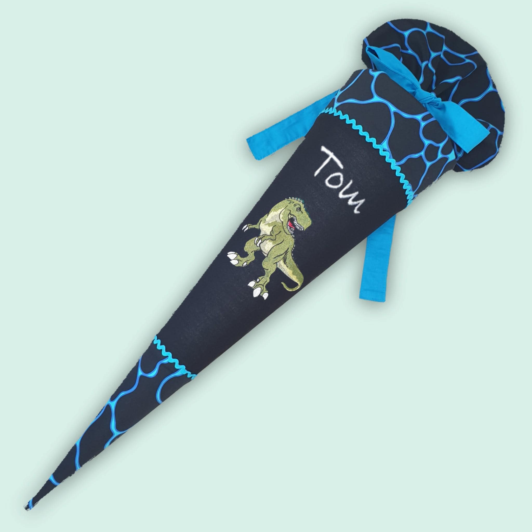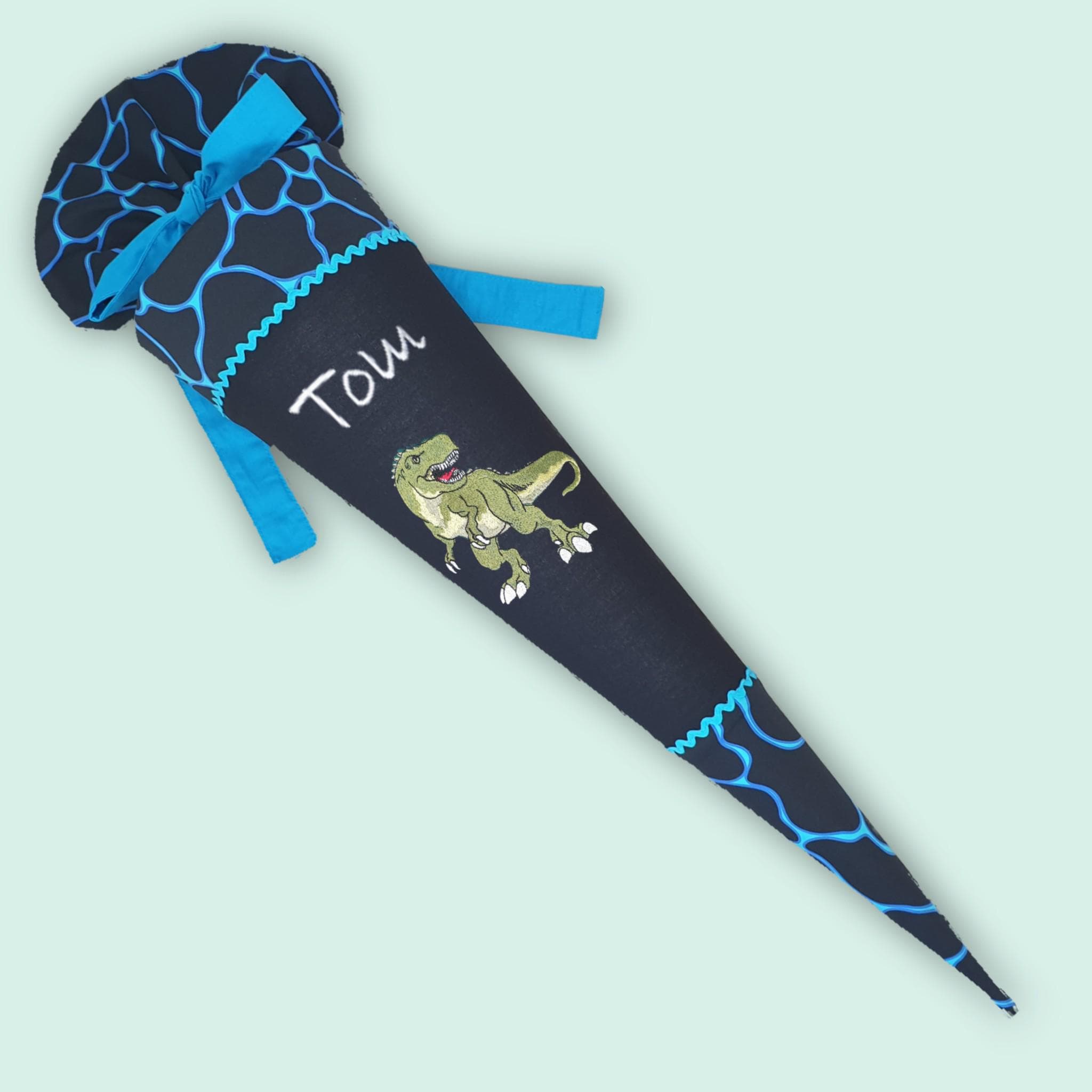 Schultüte mit Dinosaurier und Namen farblich auf den Bärassic Garden Schulranzen abgestimmt.