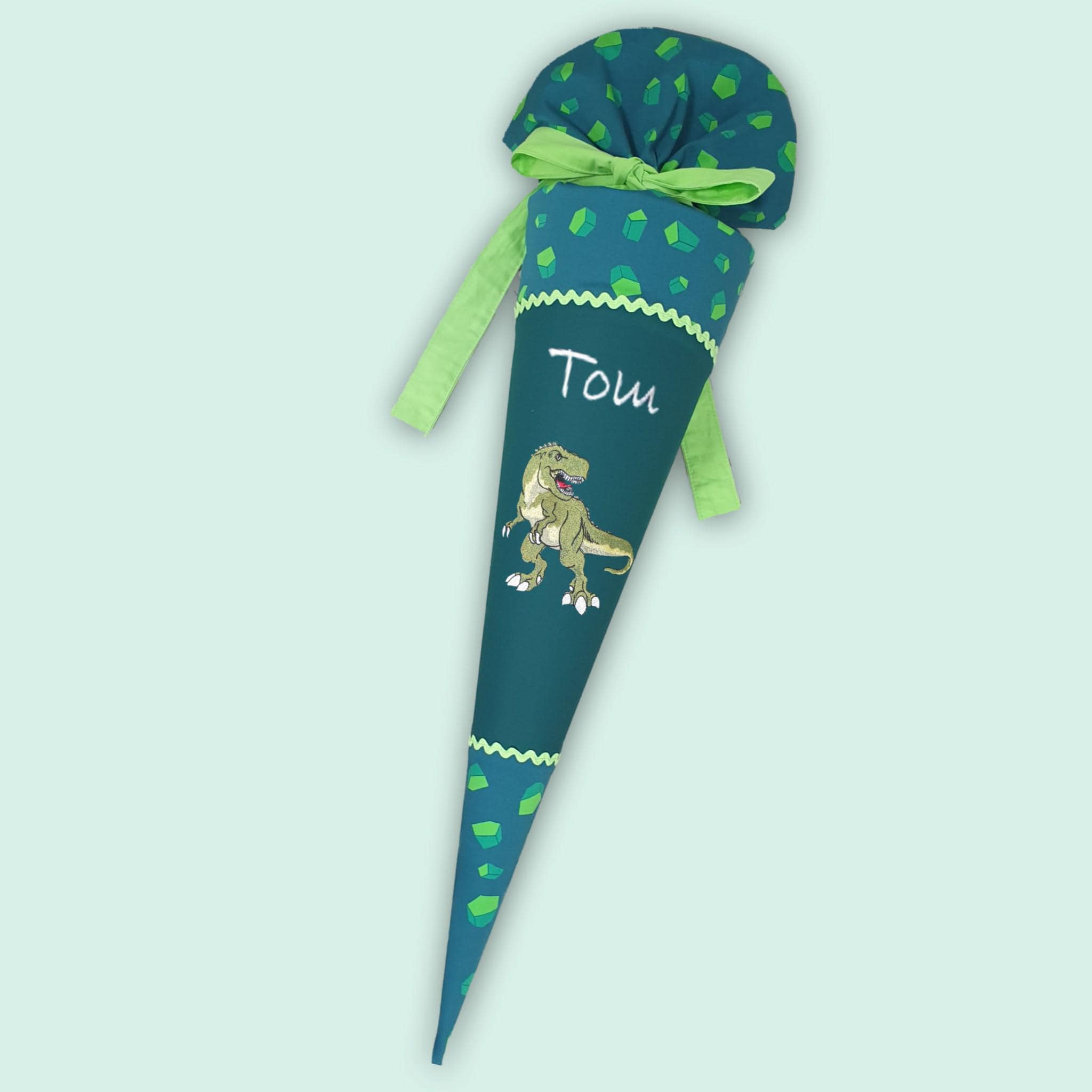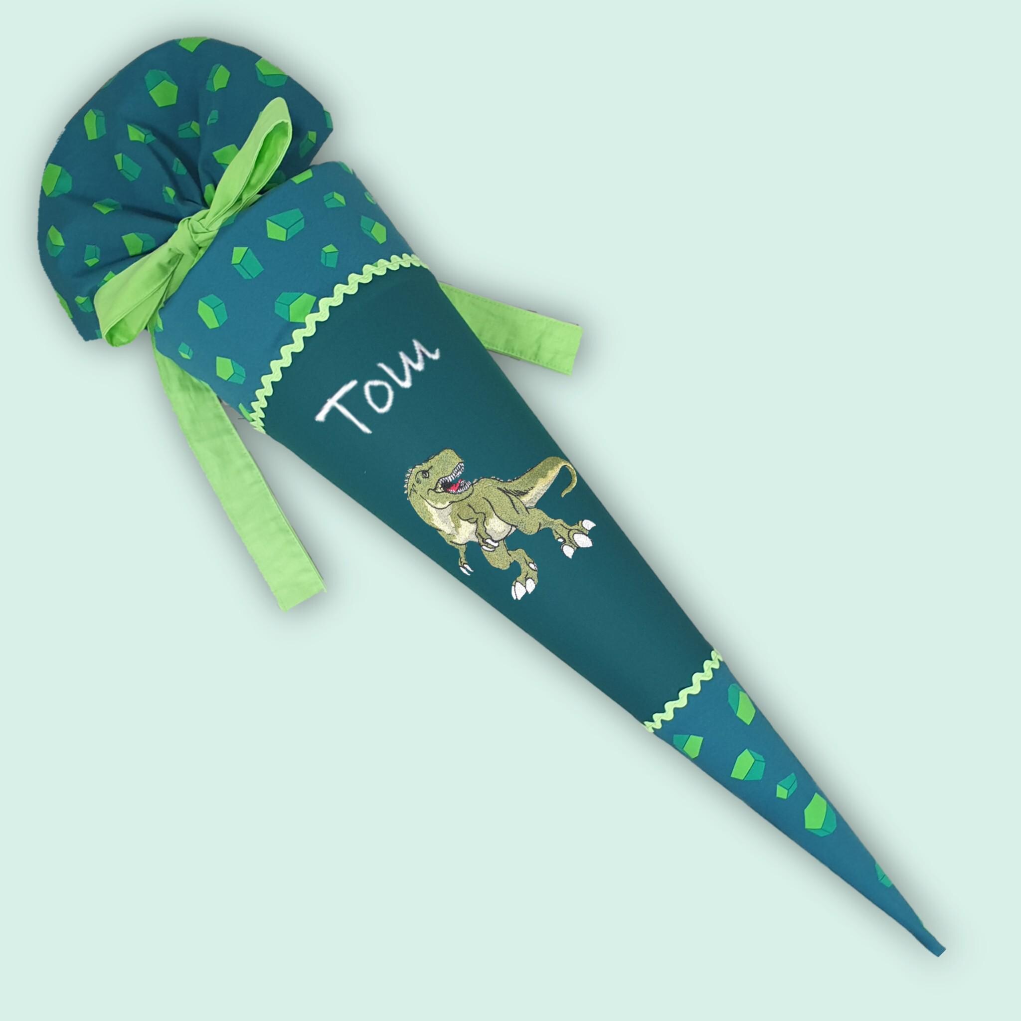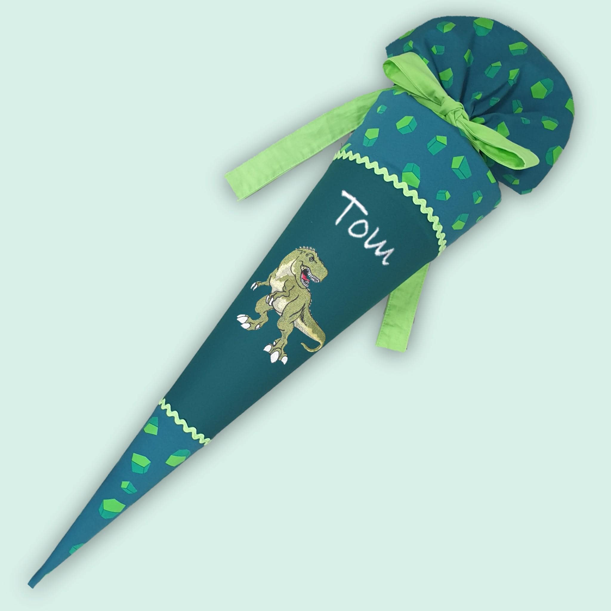 Schultüte mit Dino und Namen farblich auf den Dino Targo Schulranzen abgestimmt.