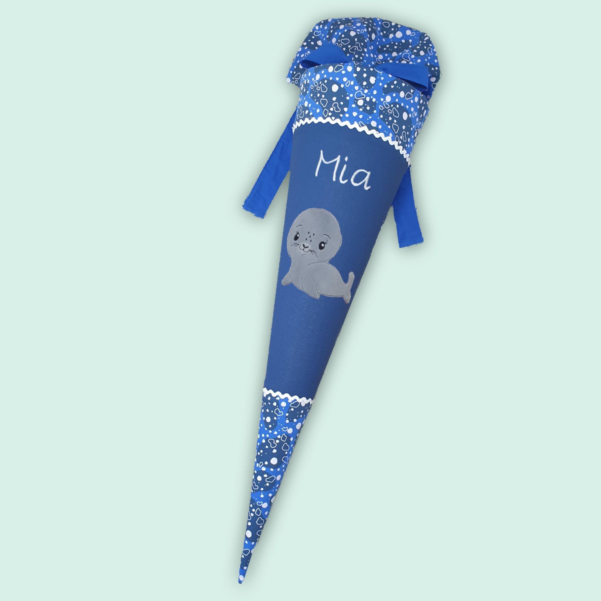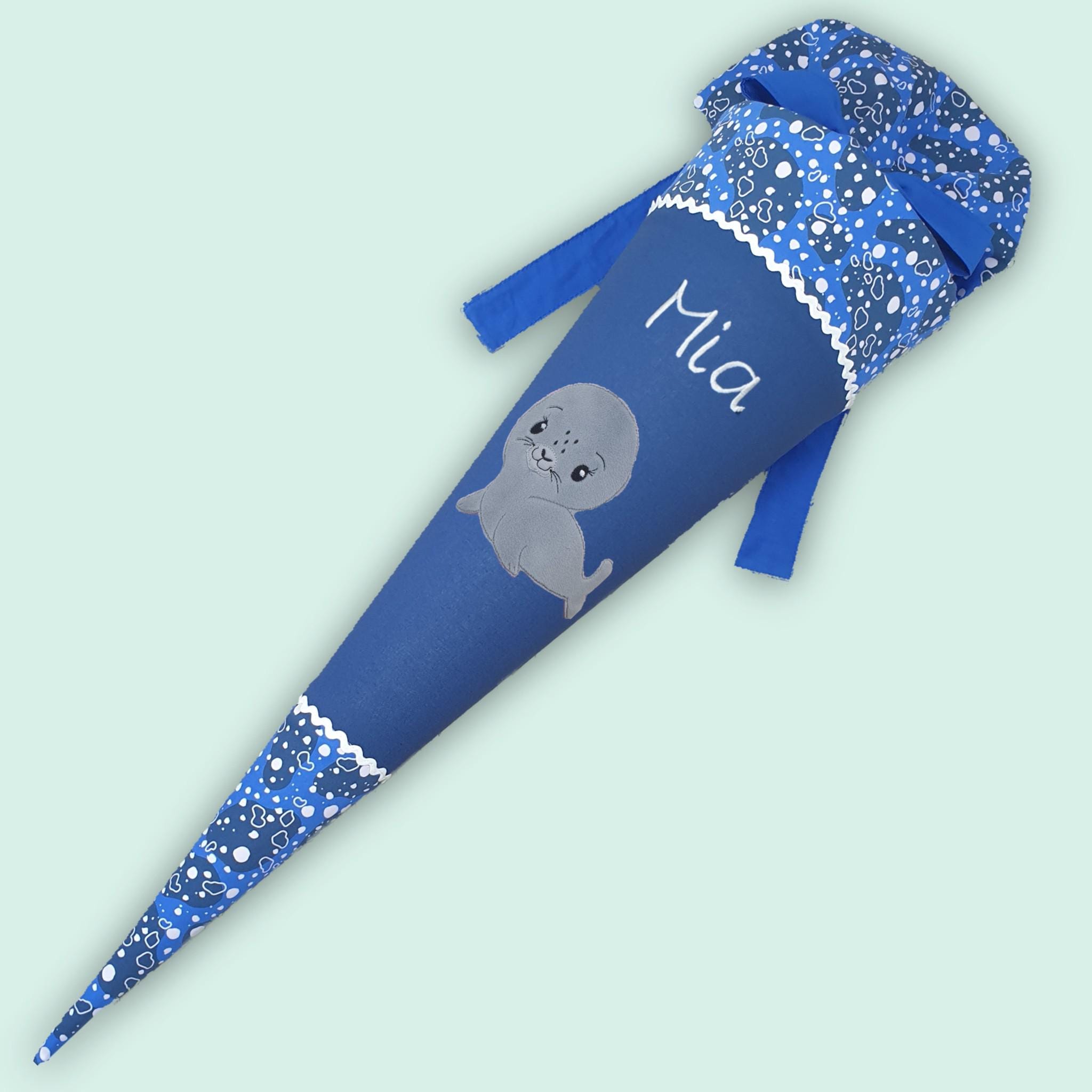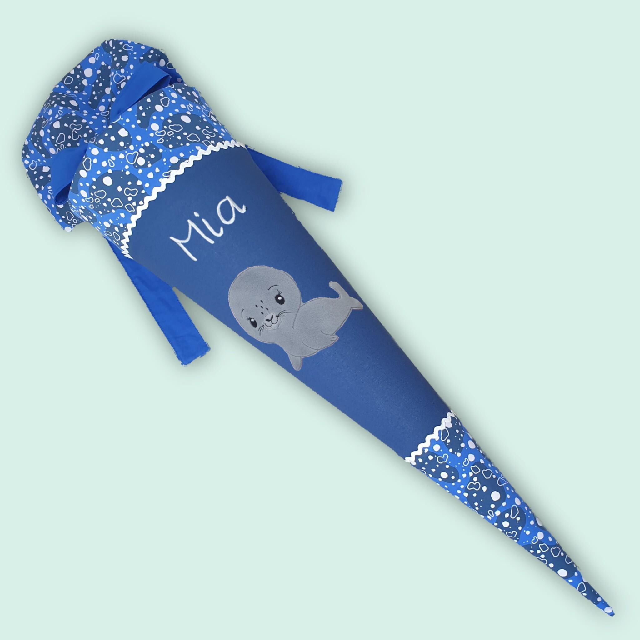 70 cm Schultüte oder 85 cm Schultüte mit Robbe Seehund und Namen farblich auf den Ozeanbärwohner Schulranzen abgestimmt.