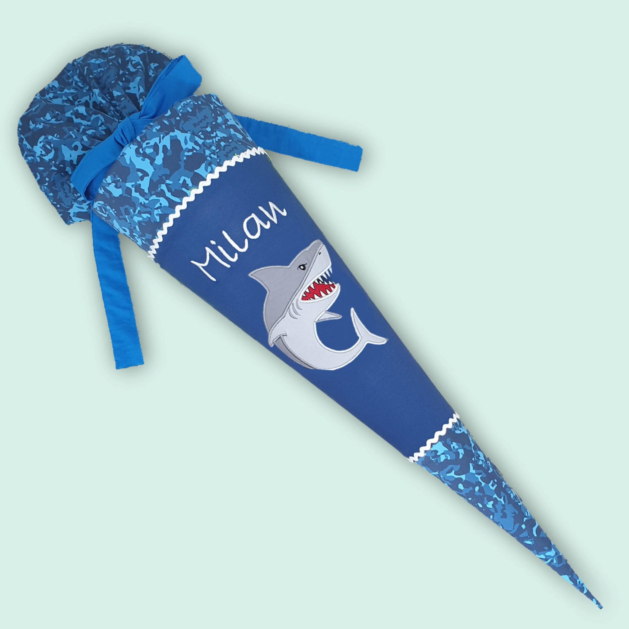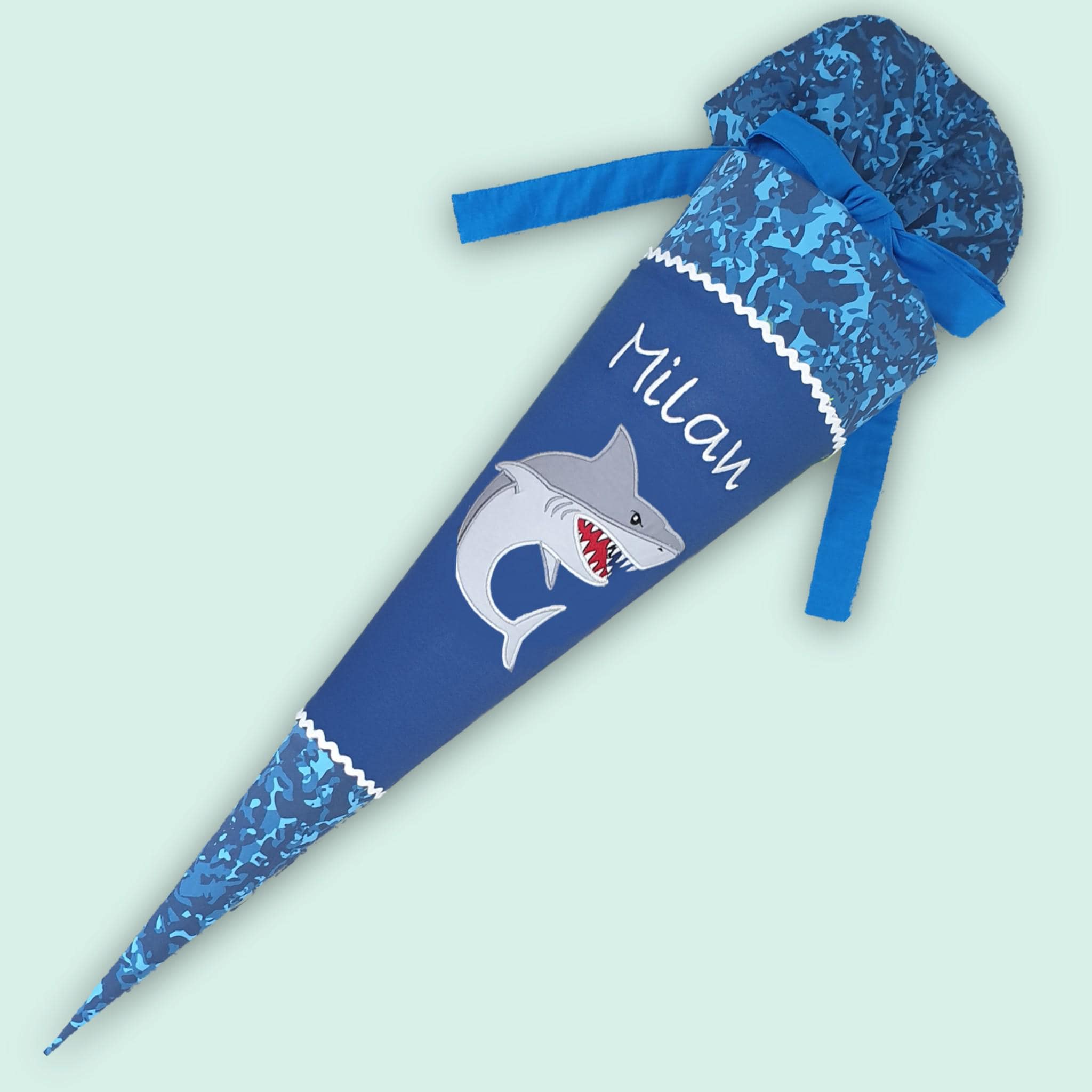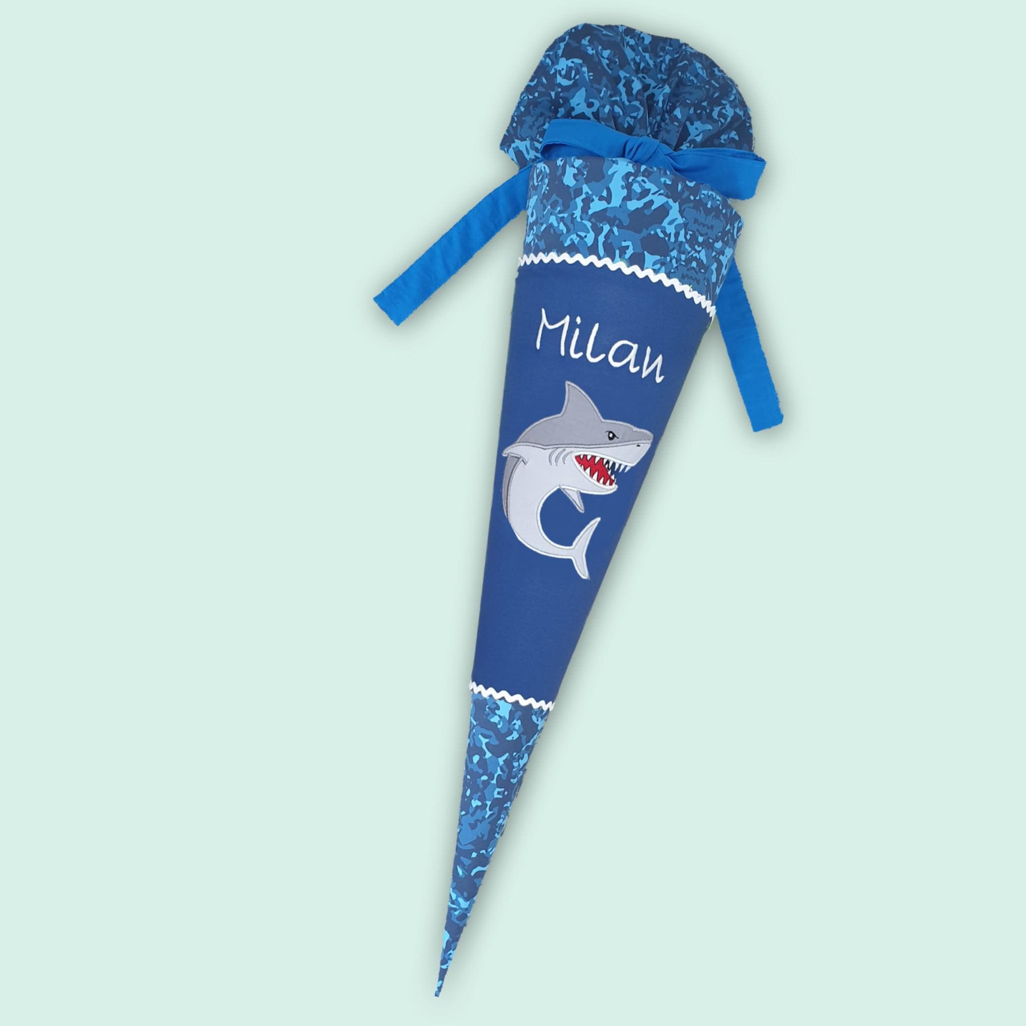 Schultüte mit Hai und Namen farblich auf den Manta Rio Schulranzen abgestimmt.