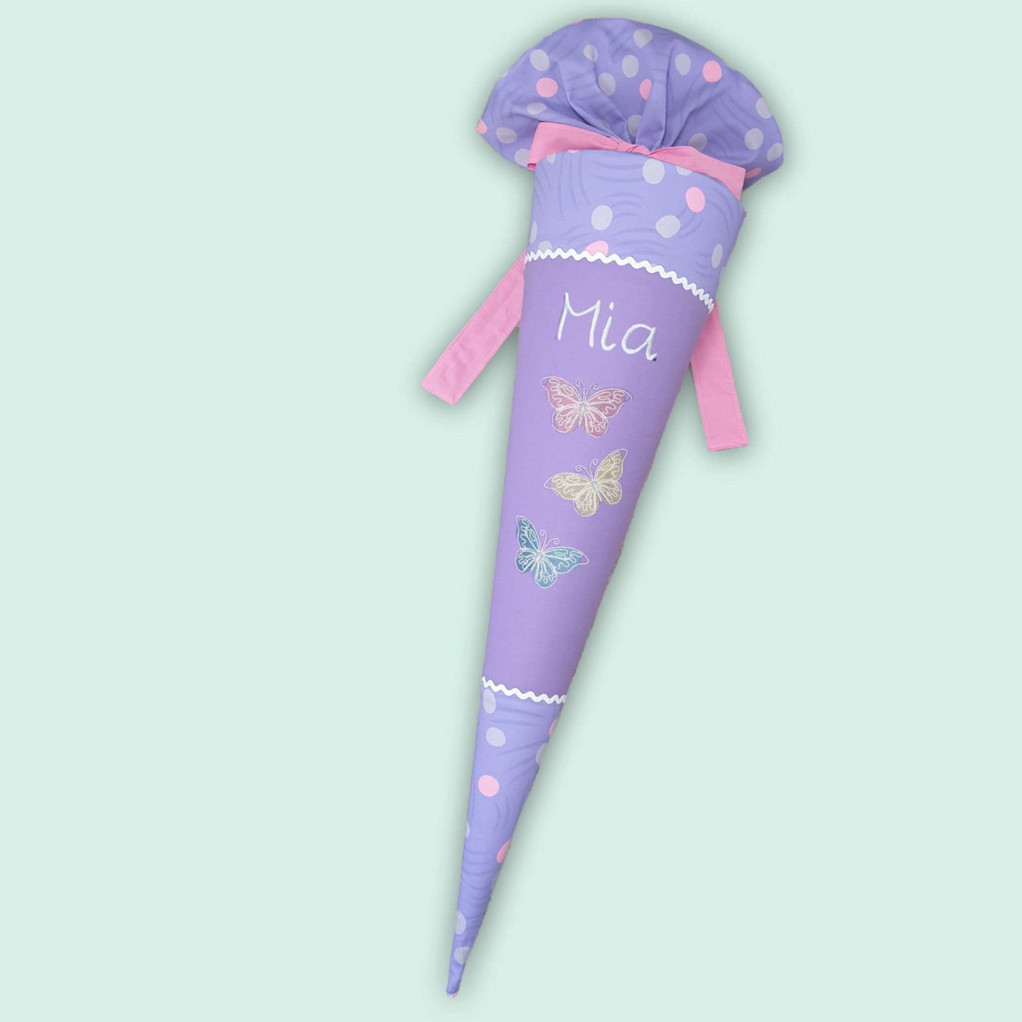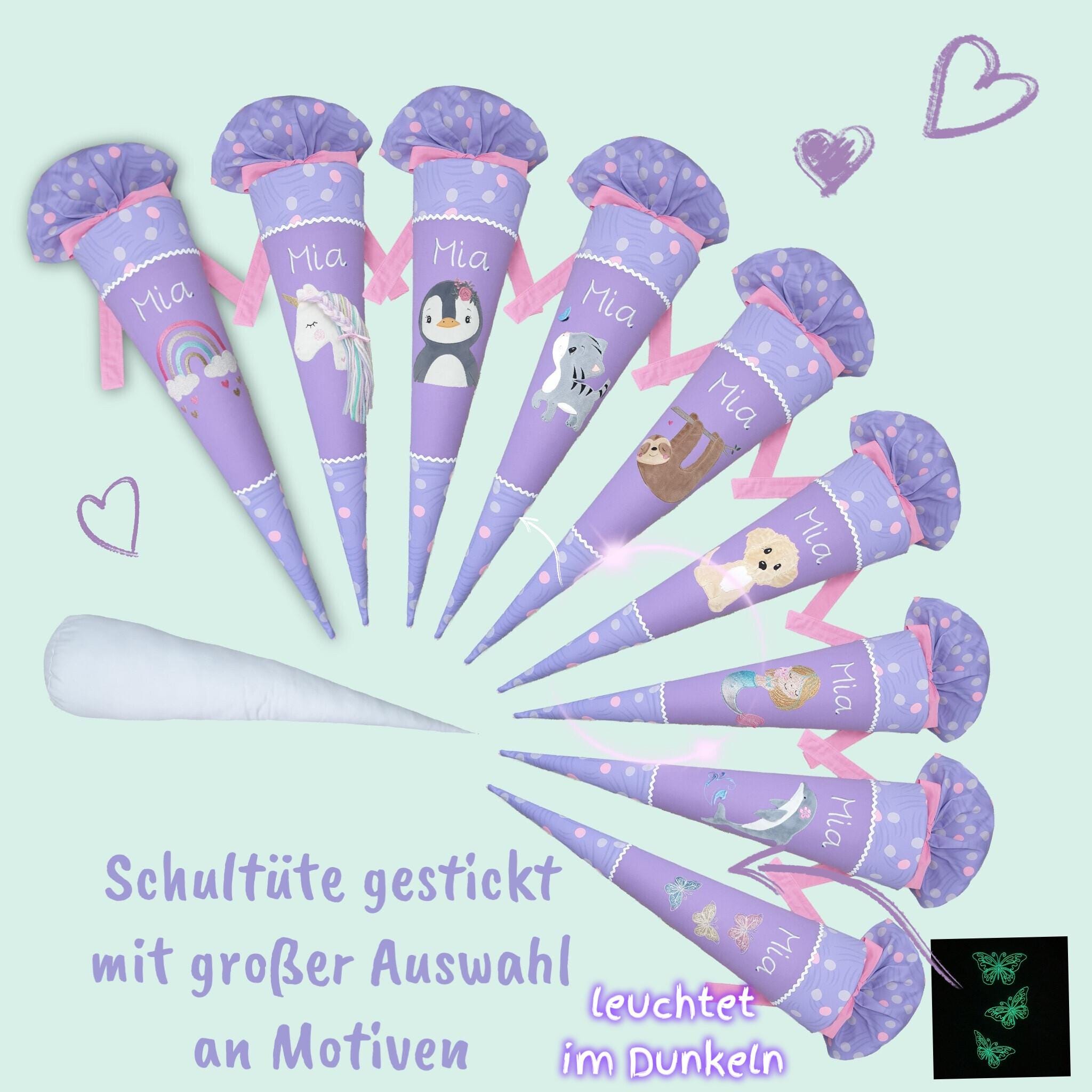 Jede Schultüte wird mit einem gestickten Motiv und dem Namen deines Kindes individuell gestaltet. Auf Wunsch fügen wir auch das Datum des ersten Schultages hinzu.