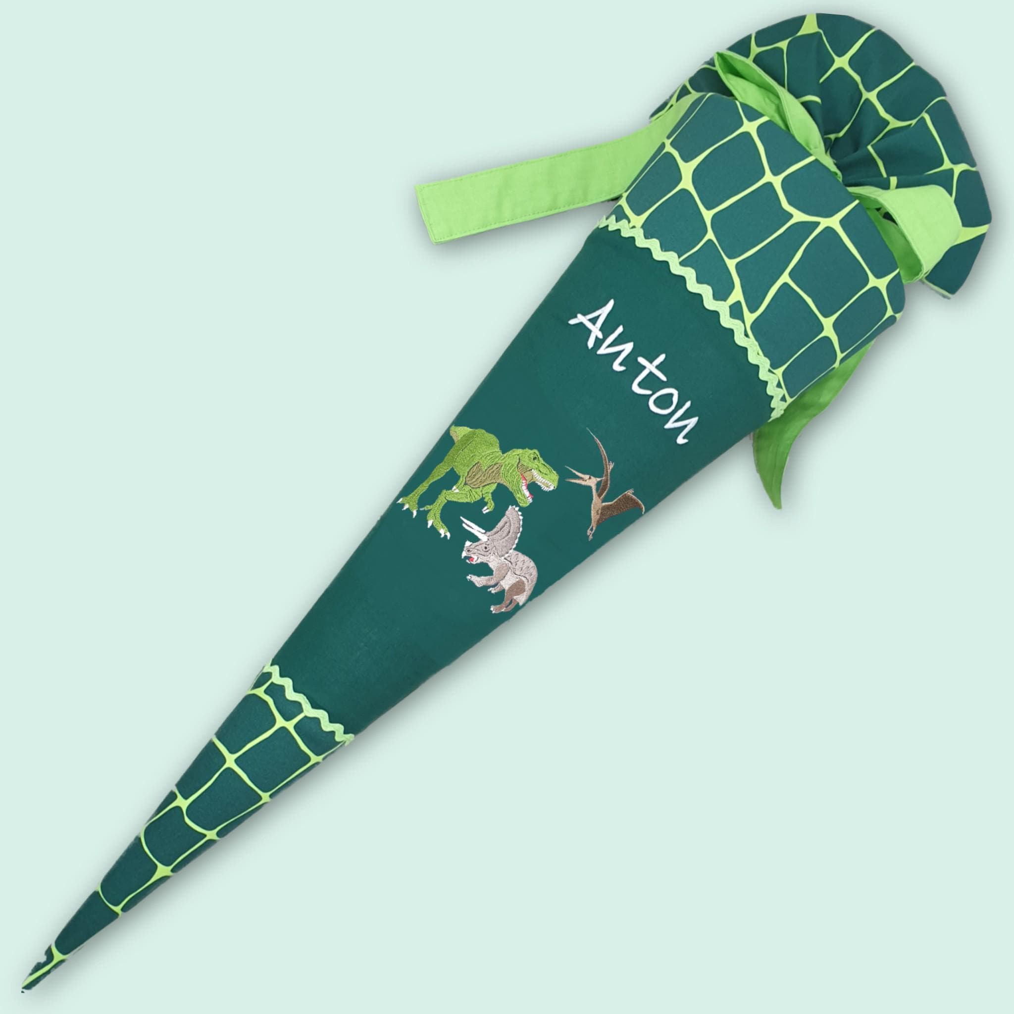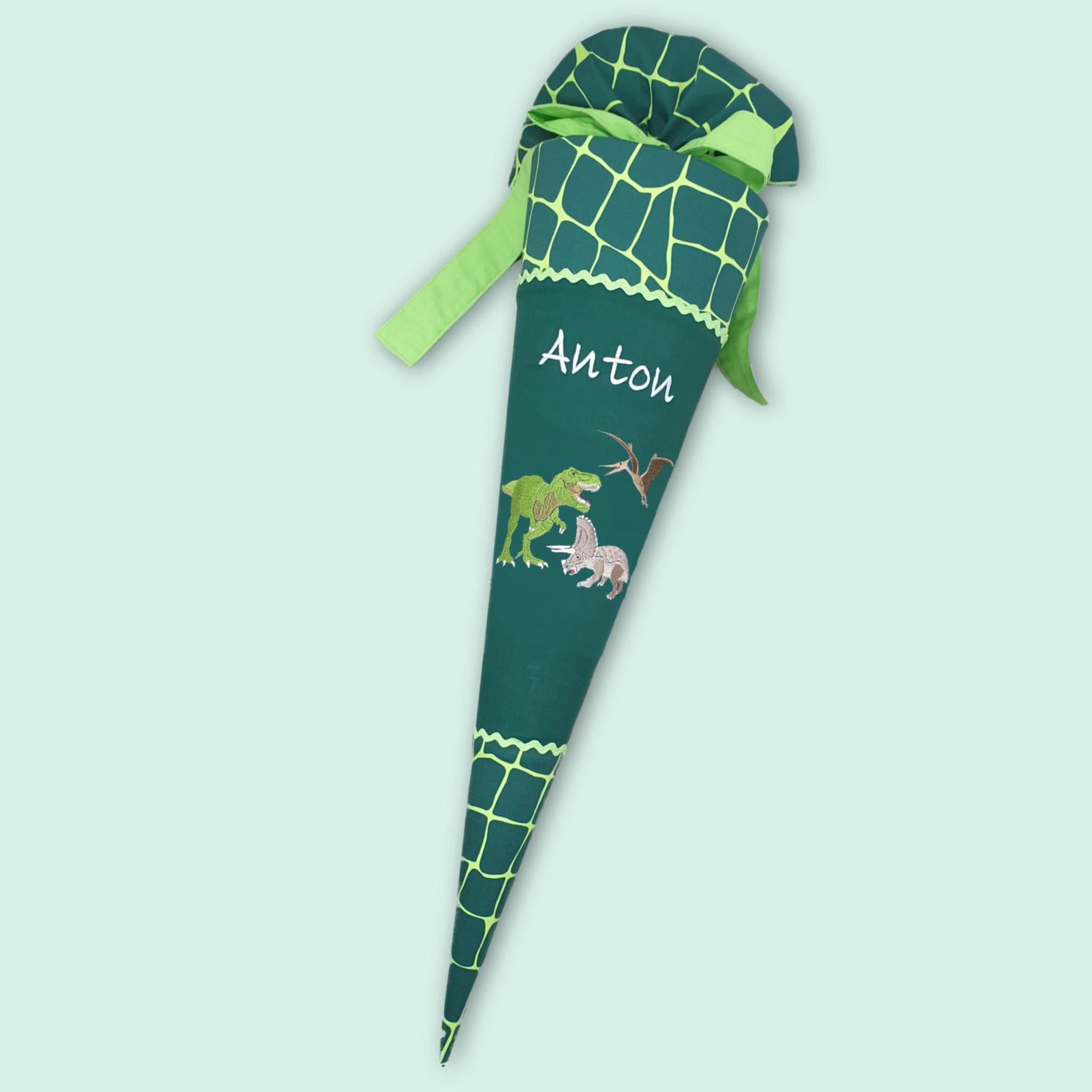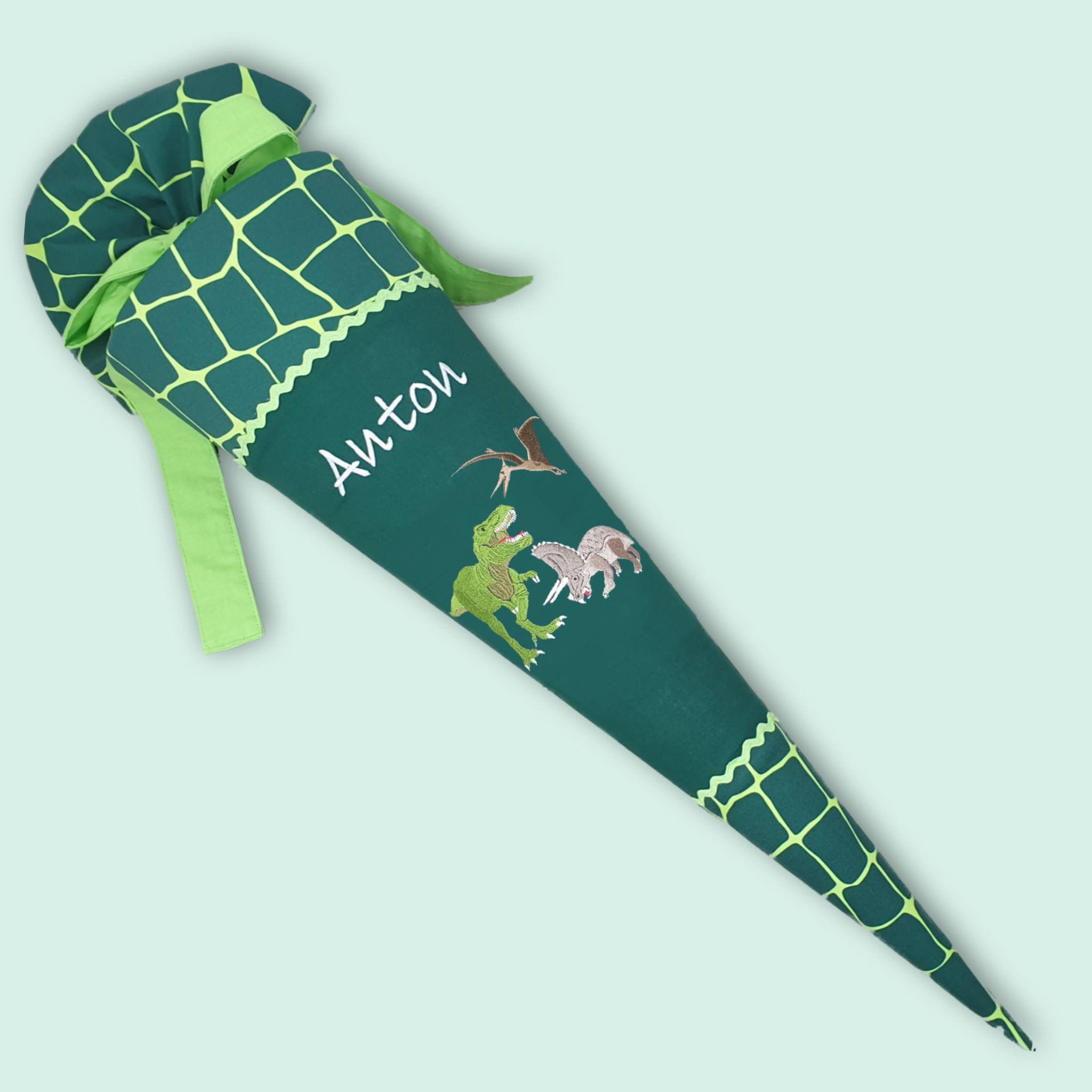 Schultüte mit Dinos und Namen farblich auf den Bärex Schulranzen abgestimmt.