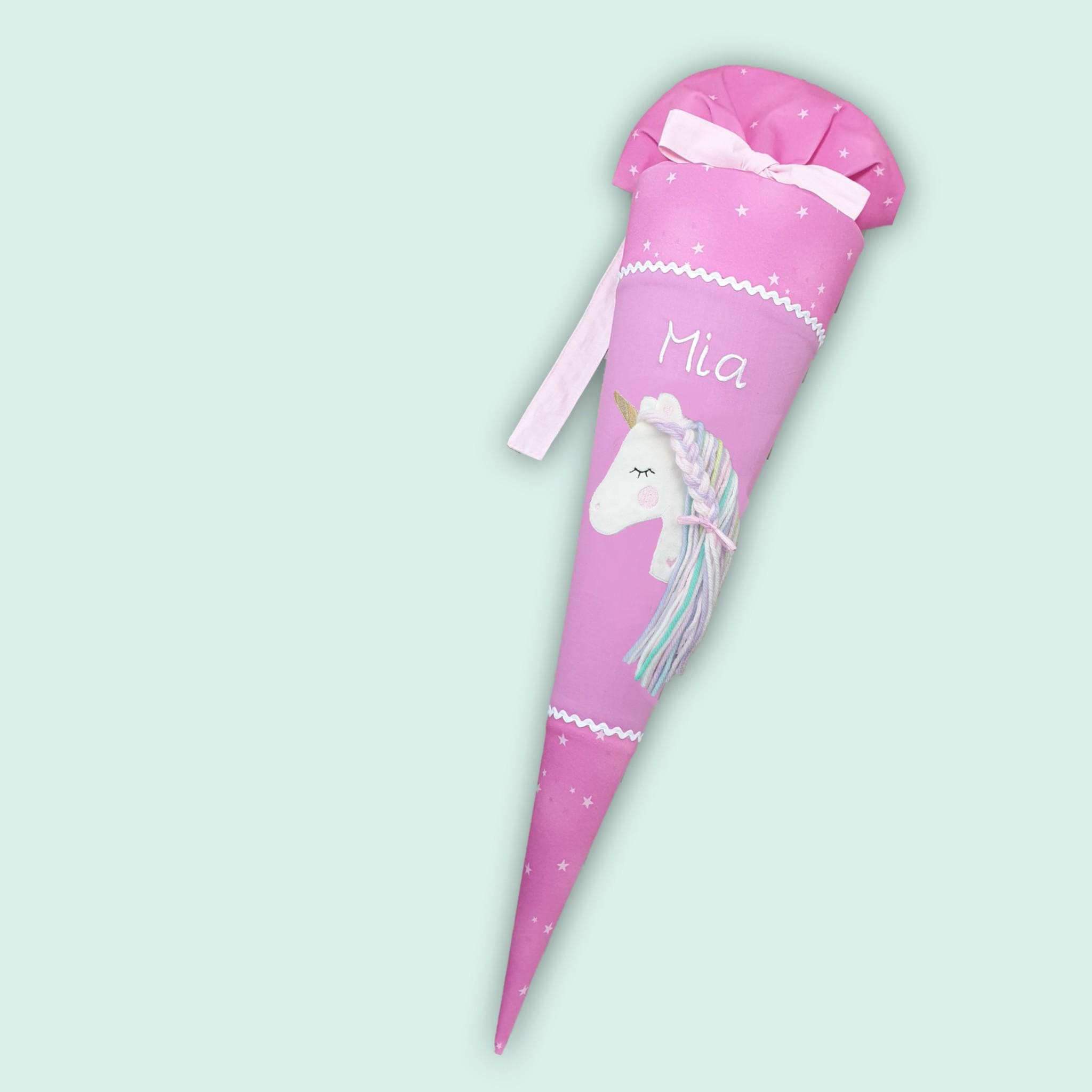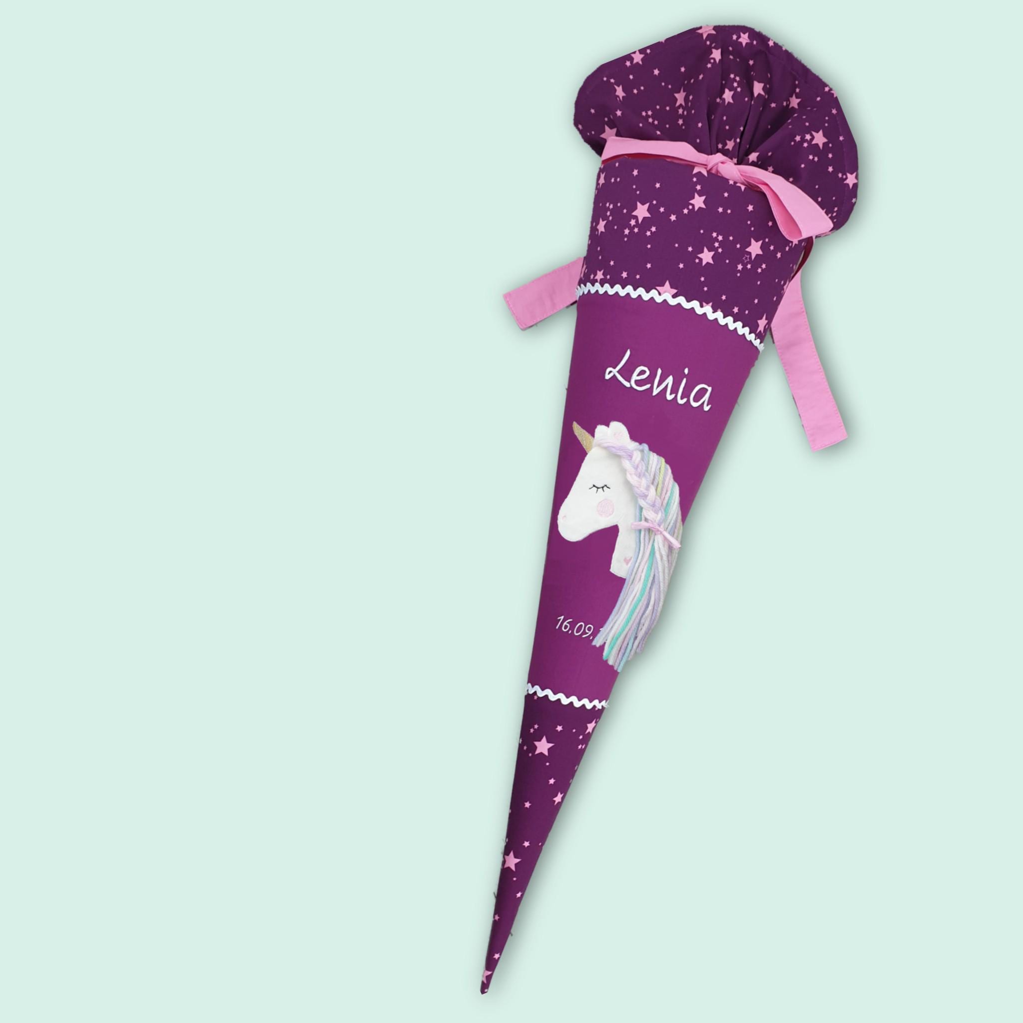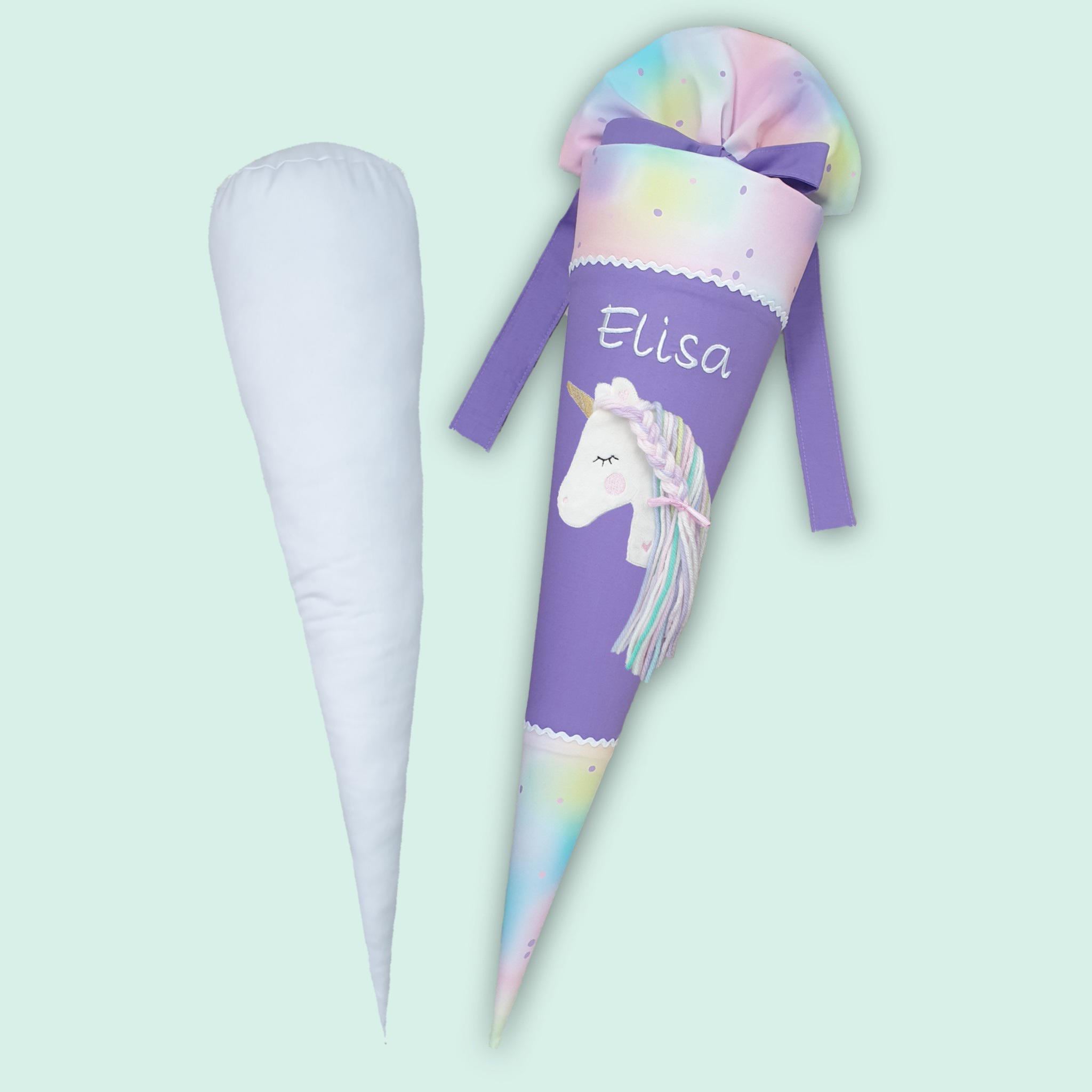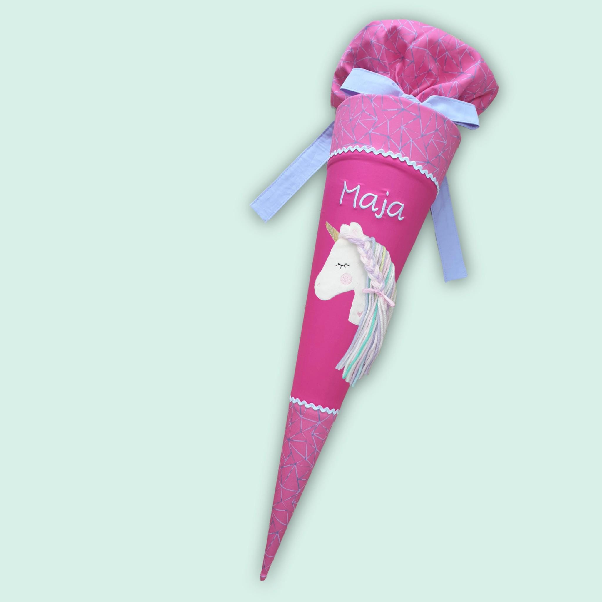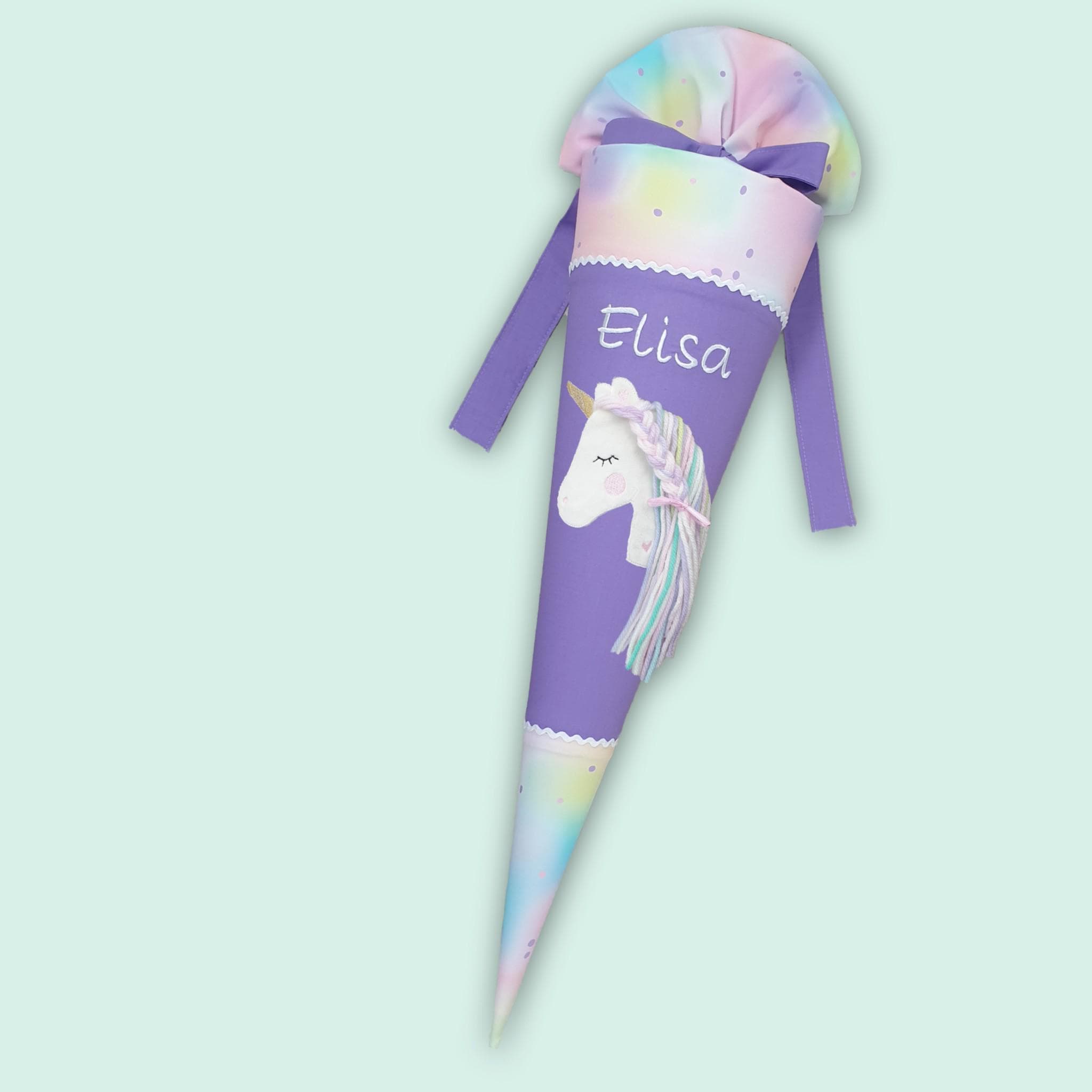 Schultüte mit Einhorn und Namen farblich auf den Schulranzen abgestimmt.