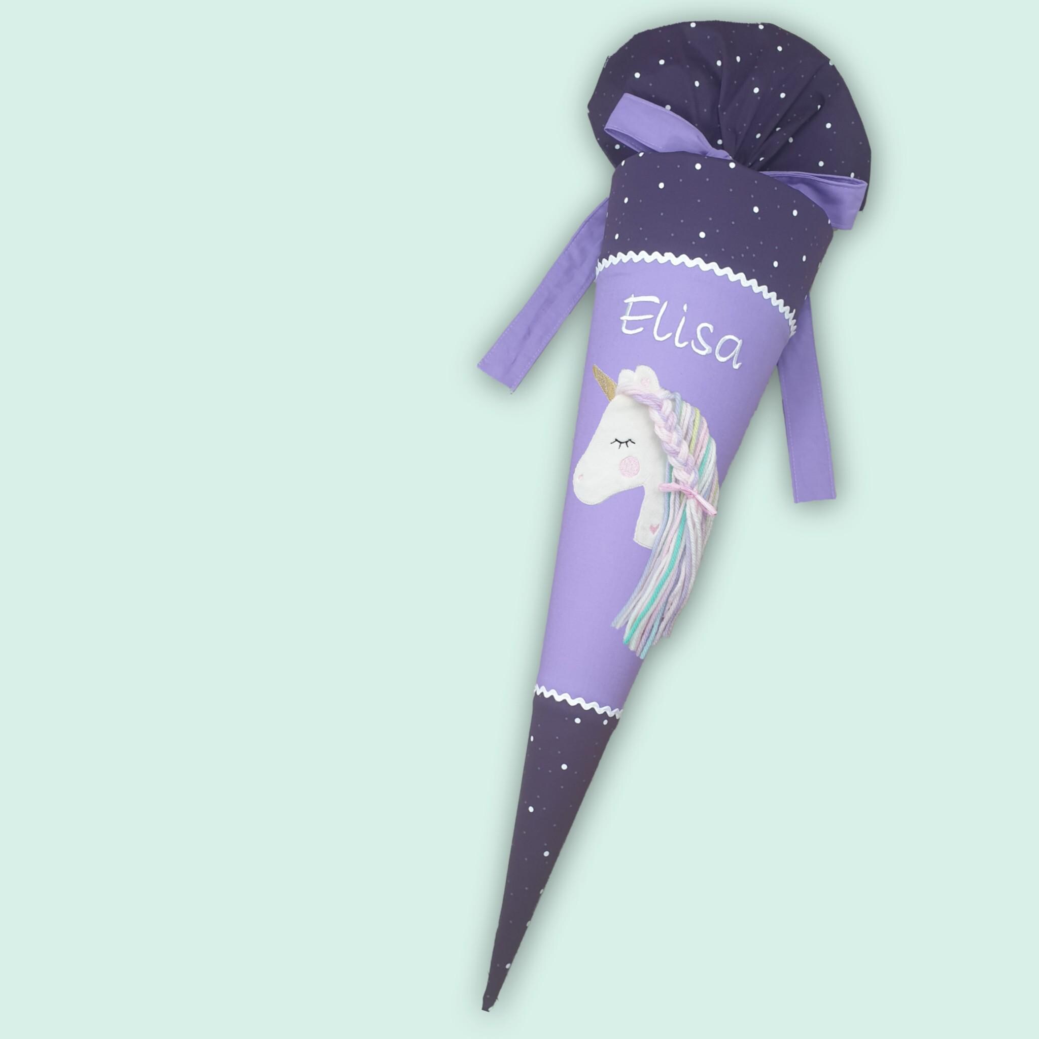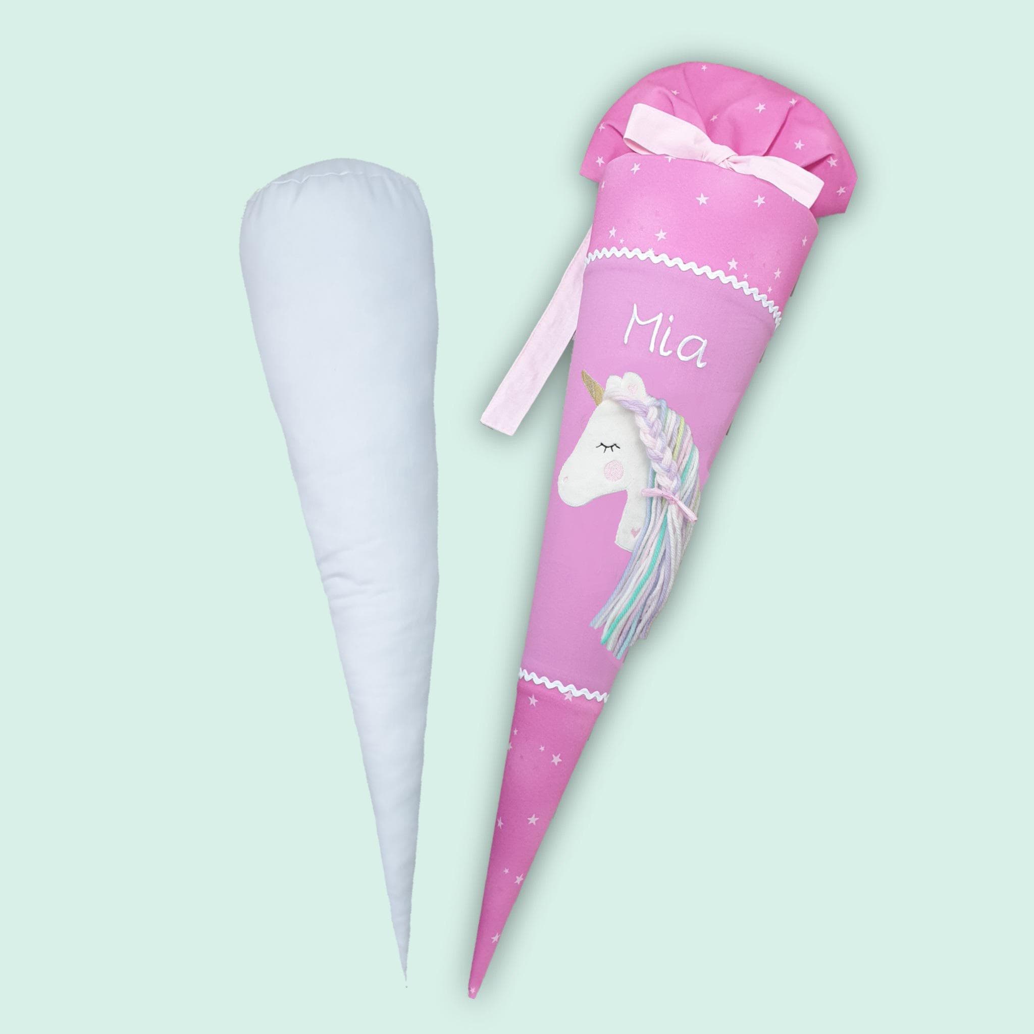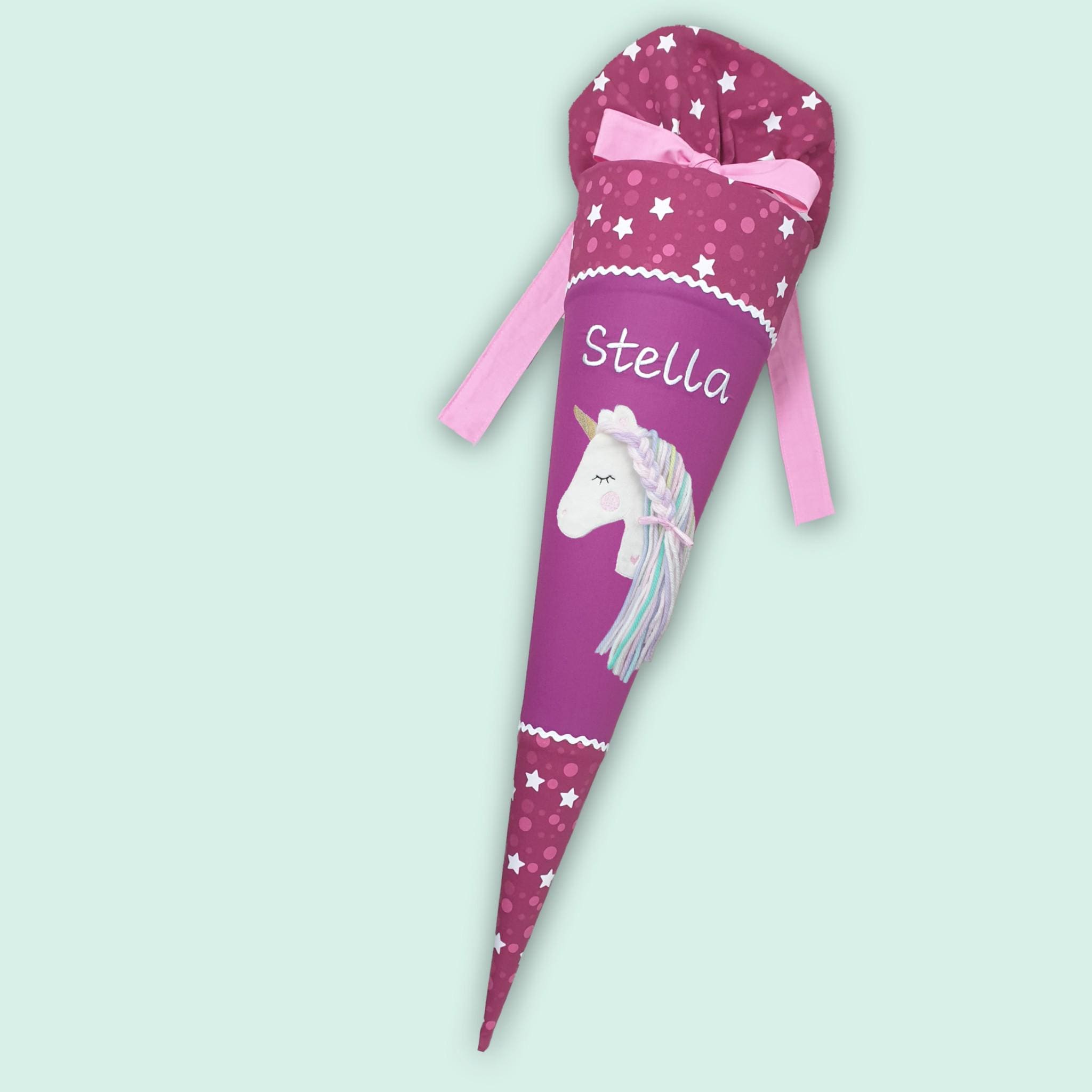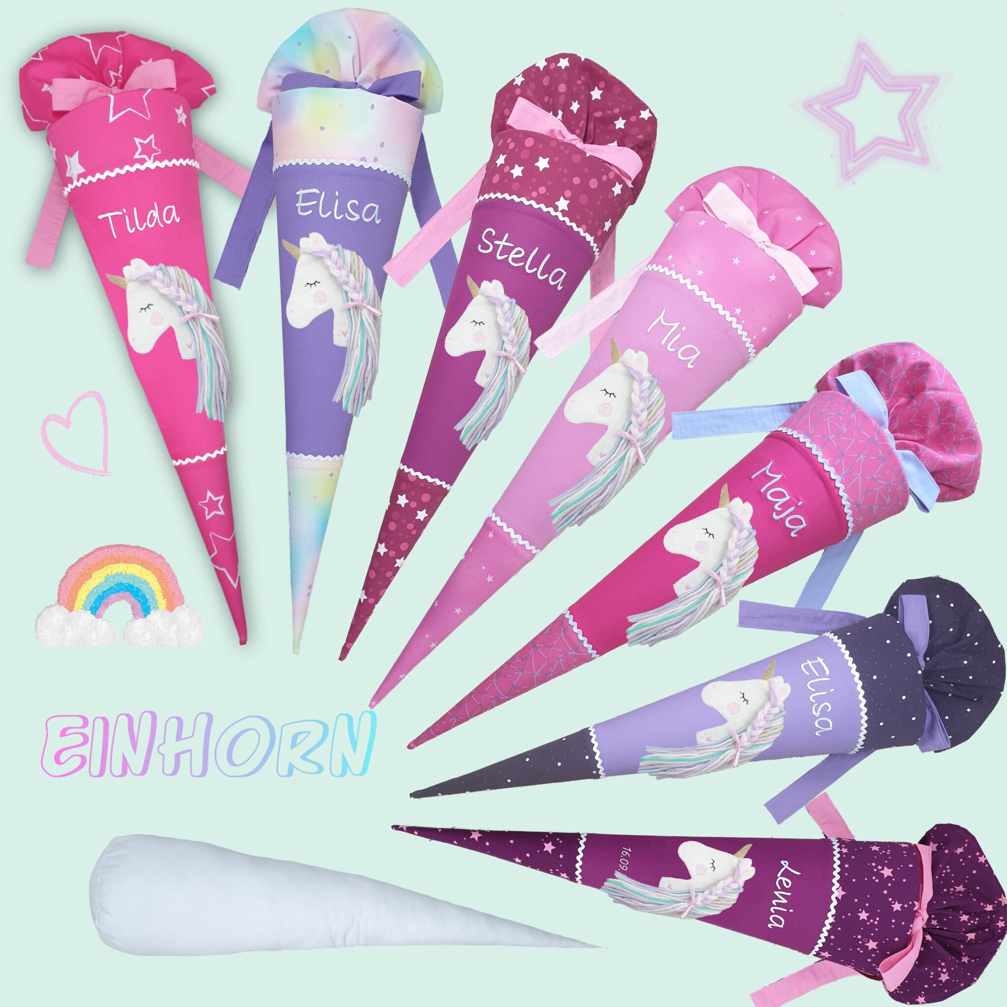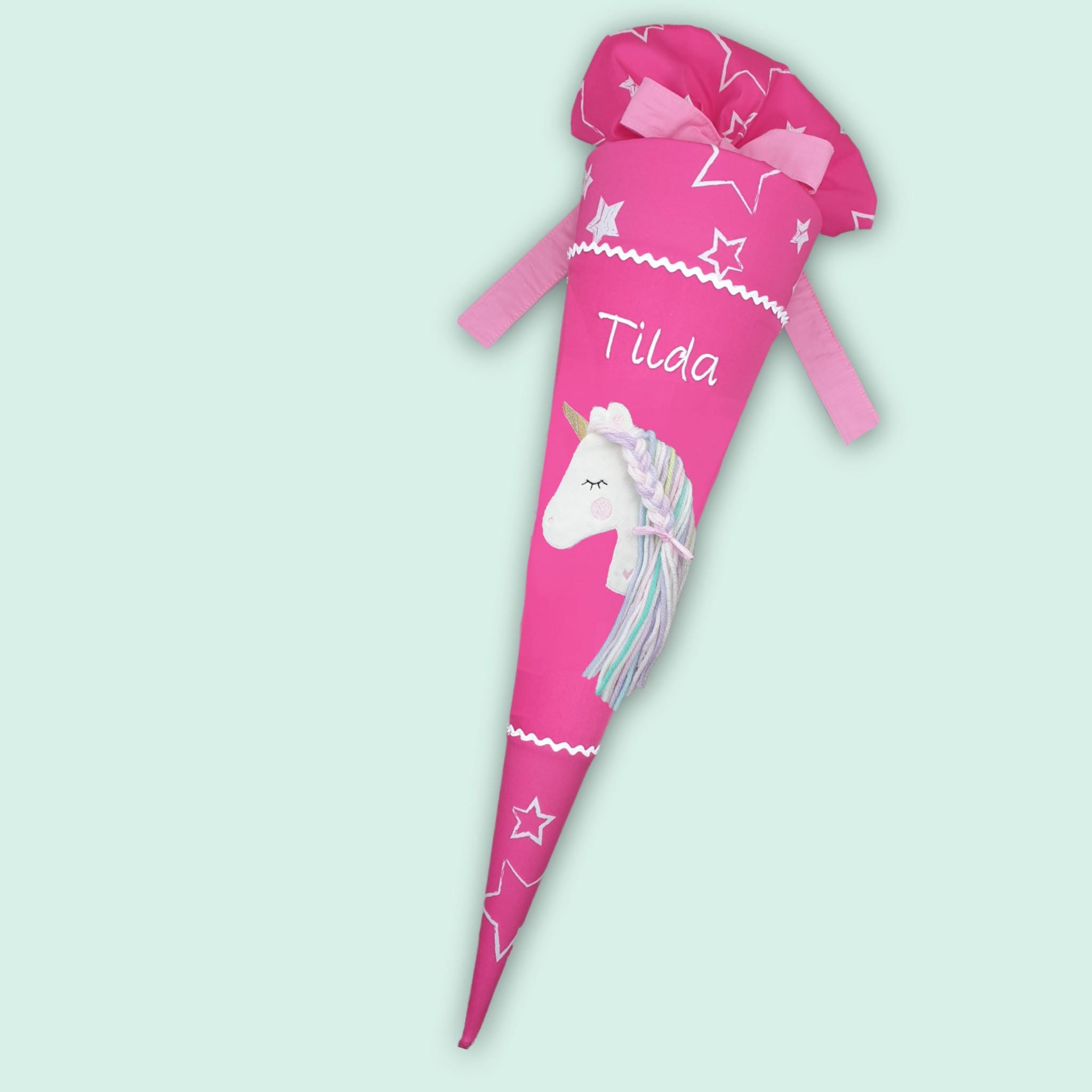 Schultüte mit Einhorn und Namen farblich auf den Schulranzen abgestimmt.