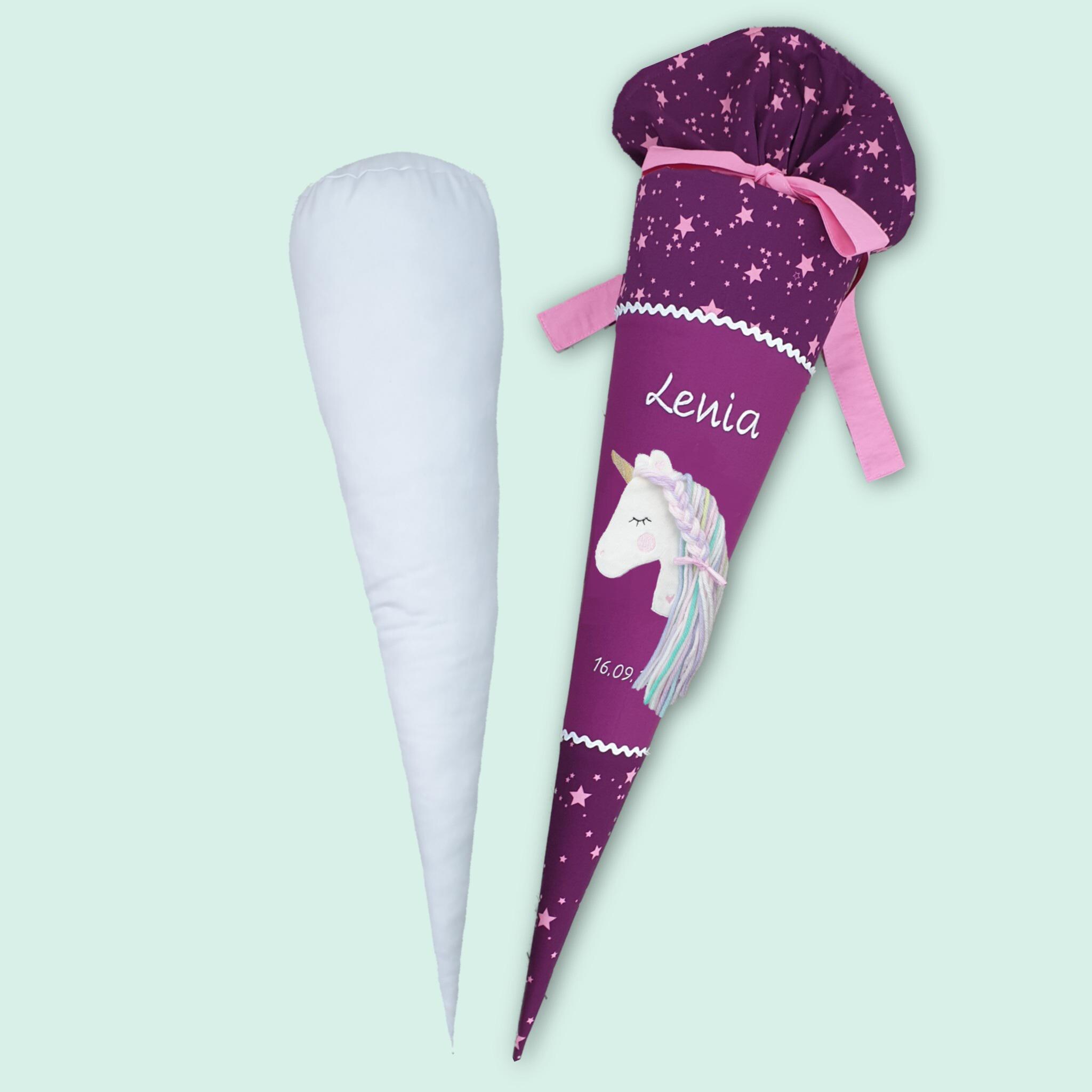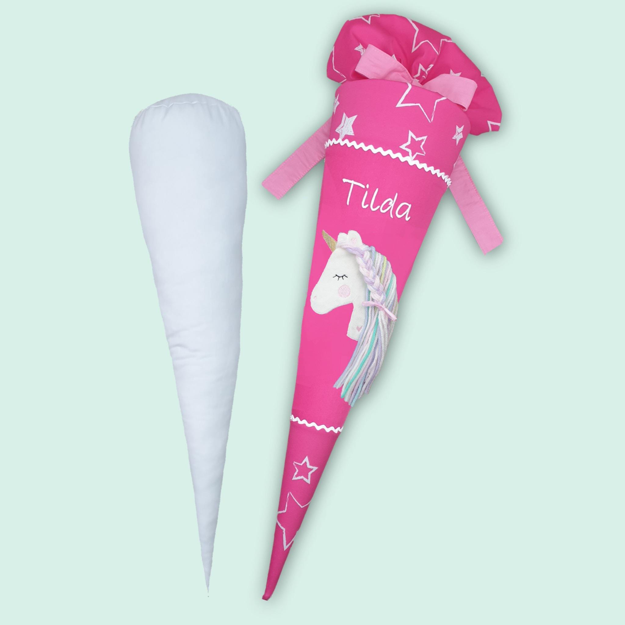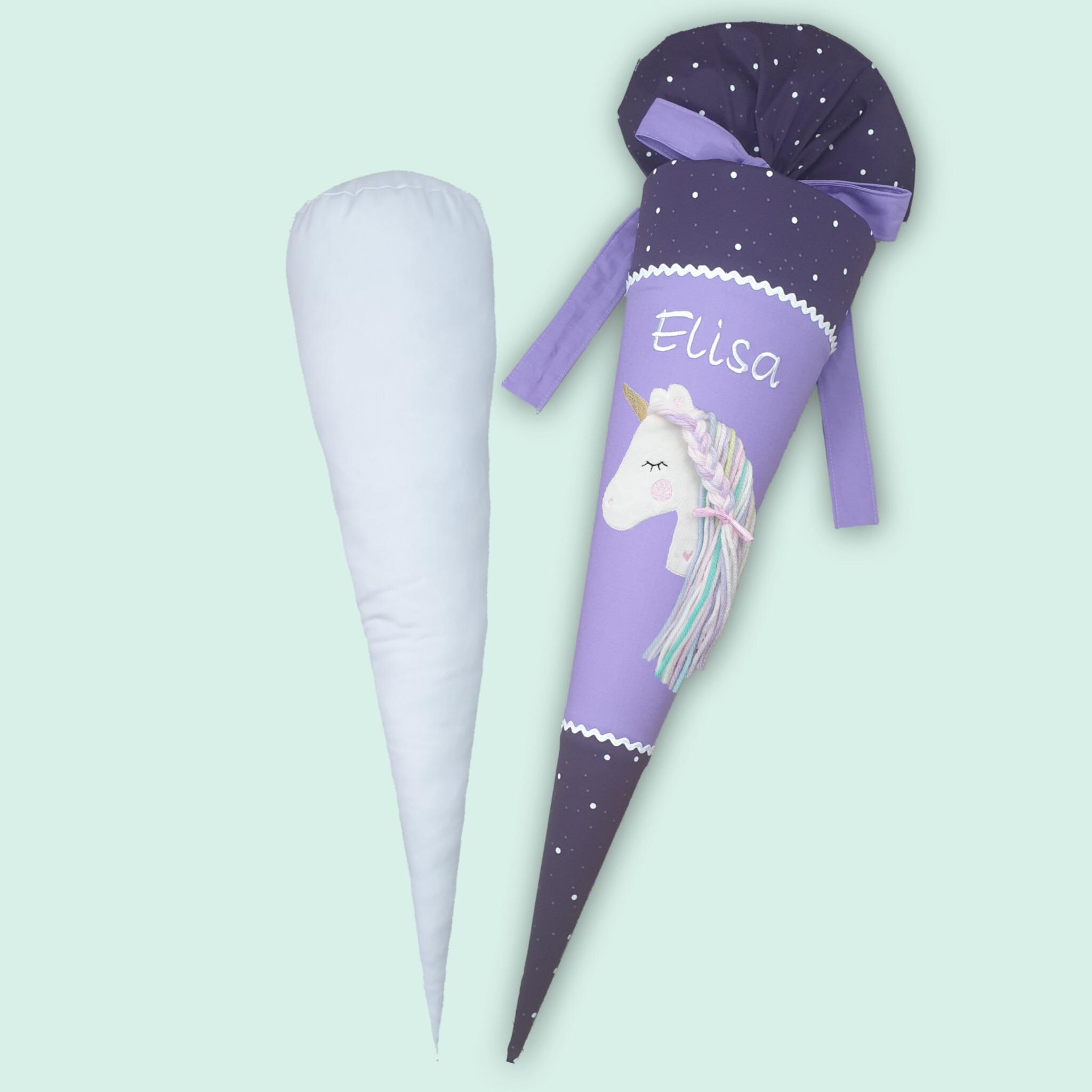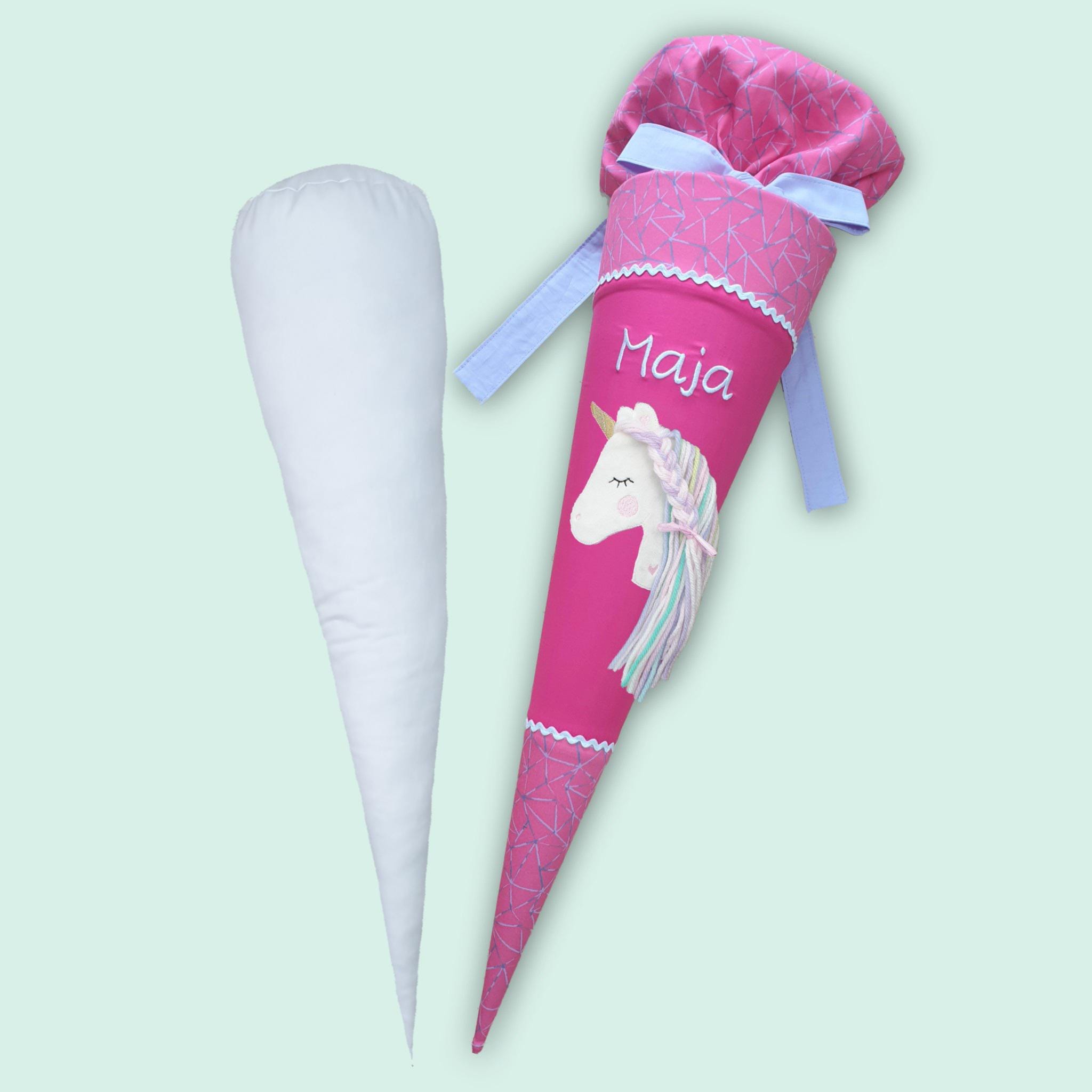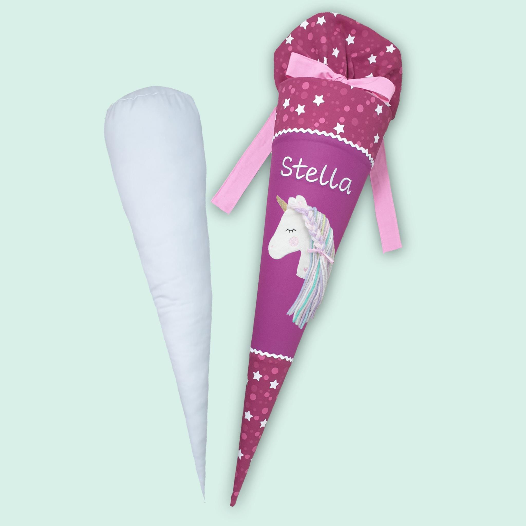 Schultüte mit Einhorn und Namen farblich auf den Schulranzen abgestimmt.