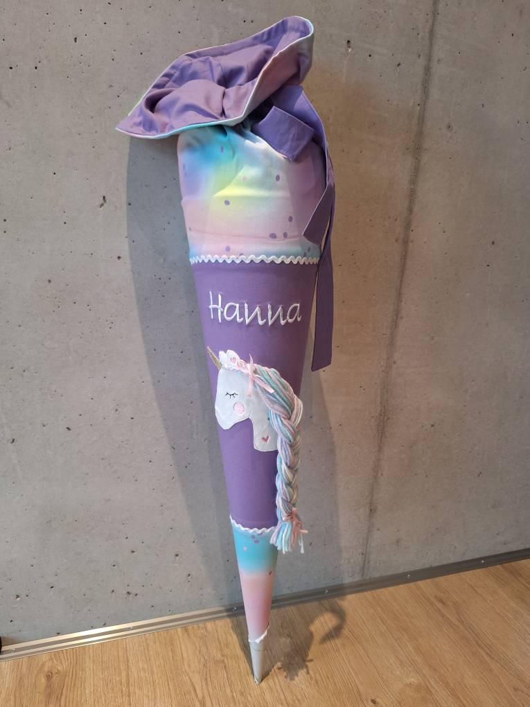 Schultüte mit Einhorn und Namen farblich auf den Schulranzen abgestimmt.