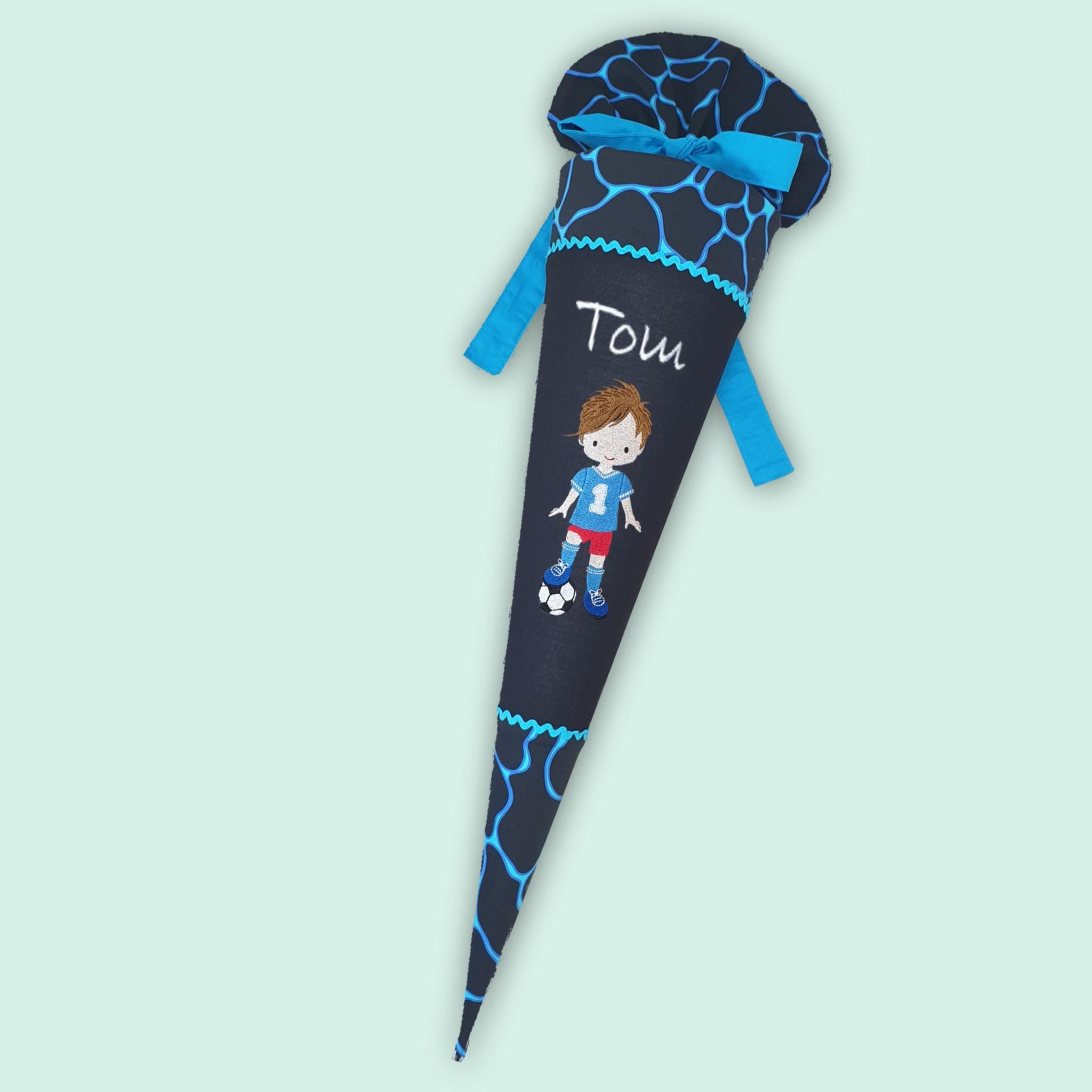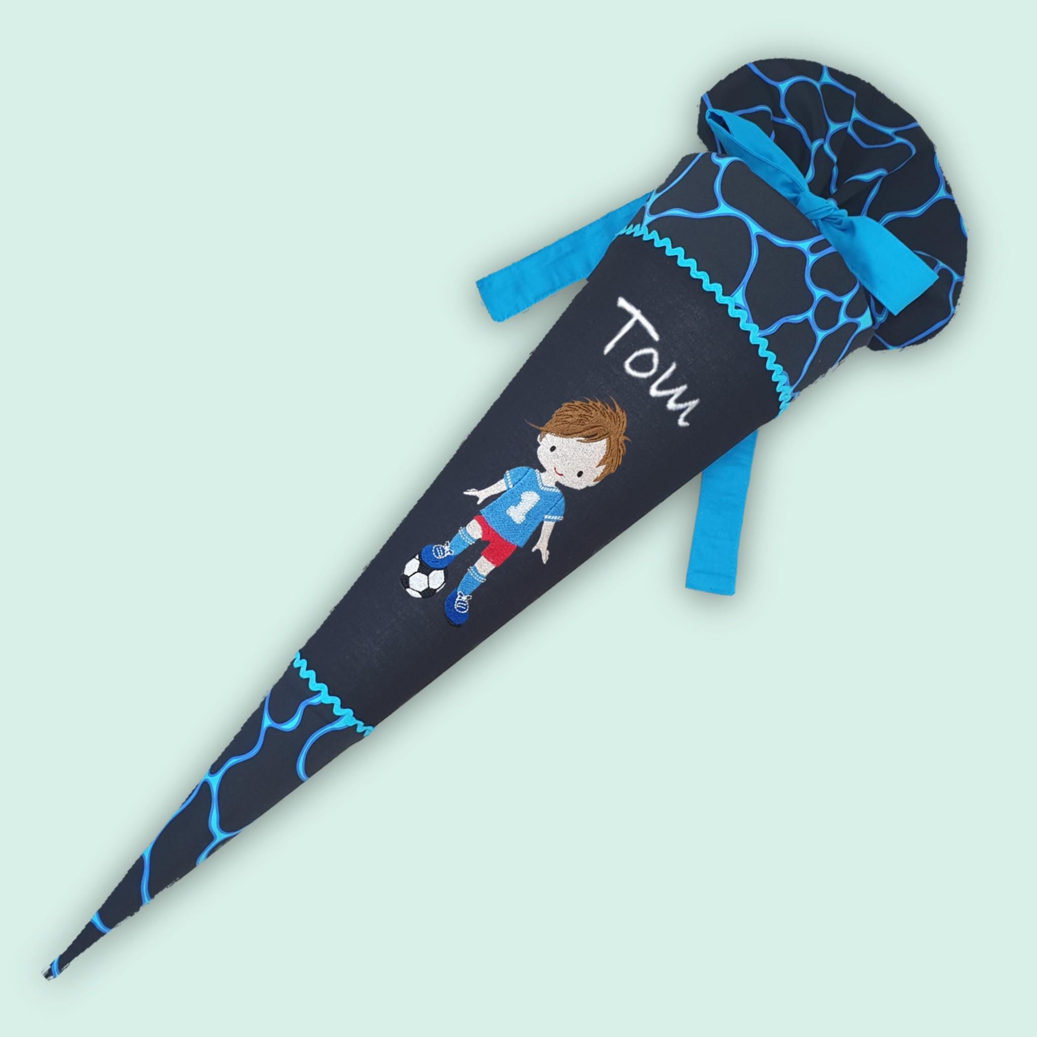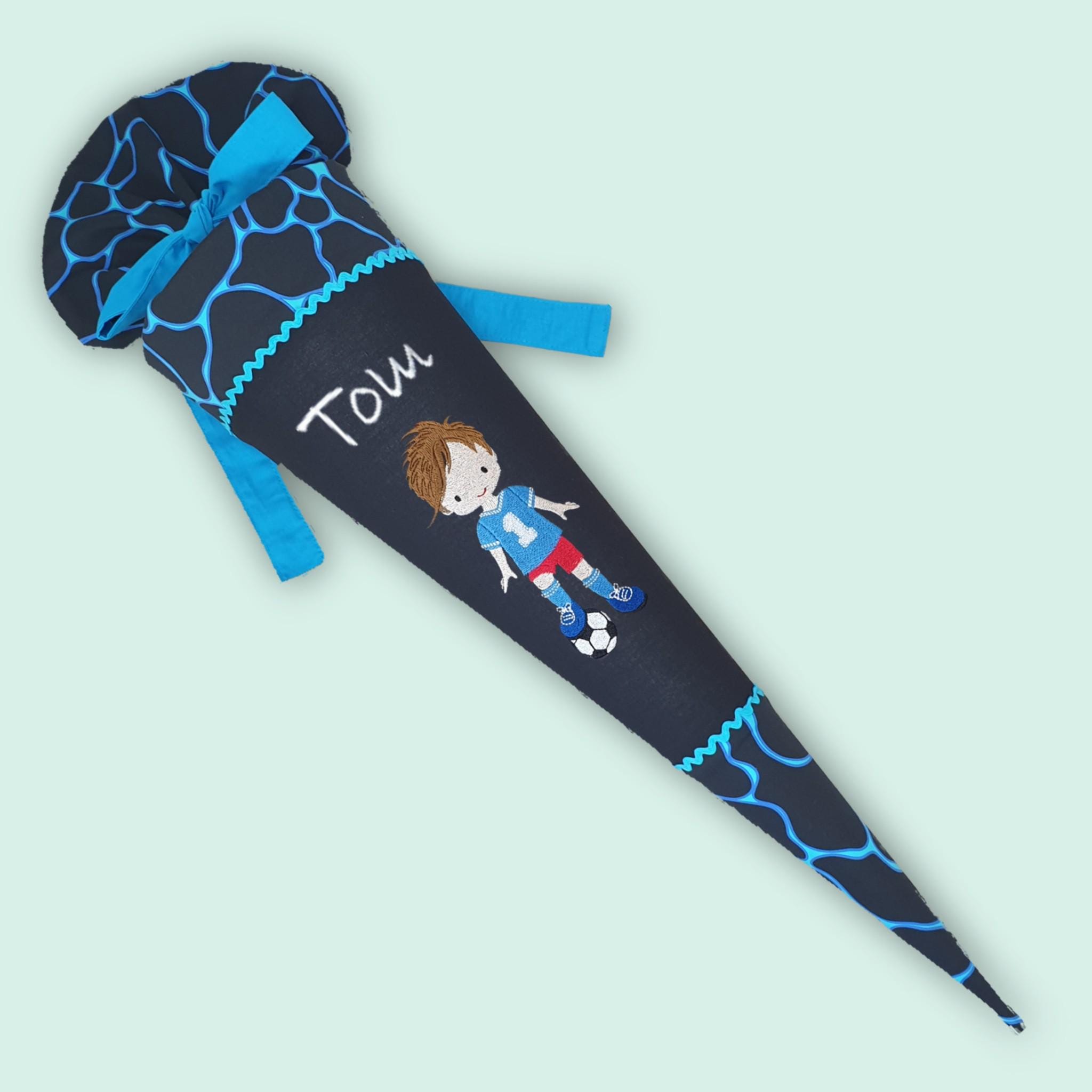 Schultüte mit Fusballer und Namen farblich auf den Bärassic Garden Schulranzen abgestimmt.