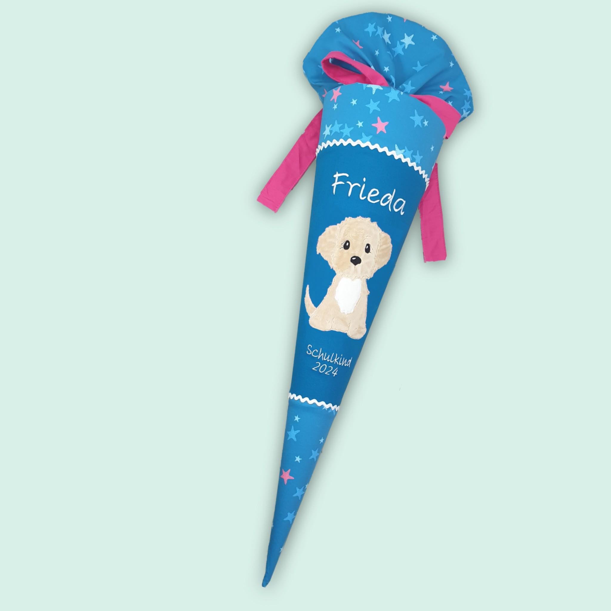Schultüte mit Hund und Namen farblich auf den Step by step Mermaid Lola Schulranzen abgestimmt.