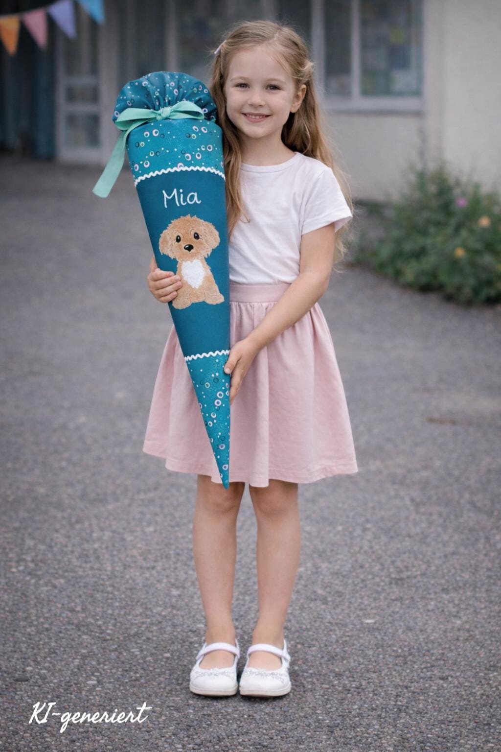 Schultüte mit Hund und Namen farblich auf den Dog Basty Schulranzen abgestimmt.