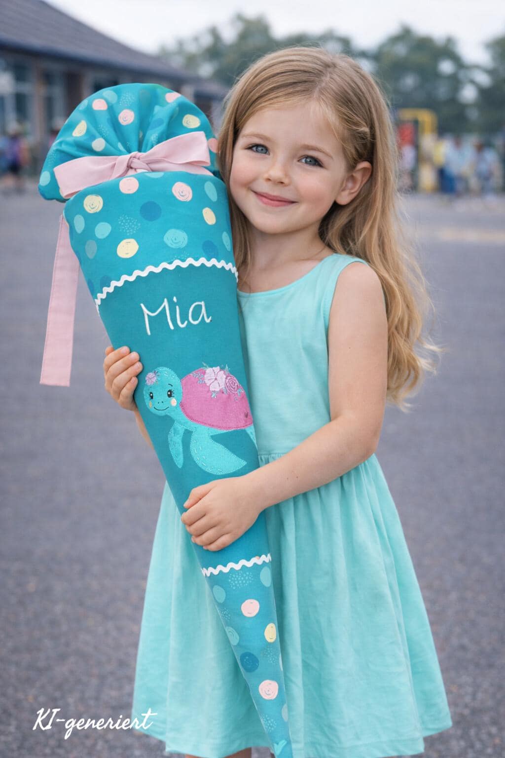 70 cm Schultüte oder 85 cm Schultüte mit Schildkröte und Namen farblich auf den Turtle Josie Schulranzen abgestimmt.