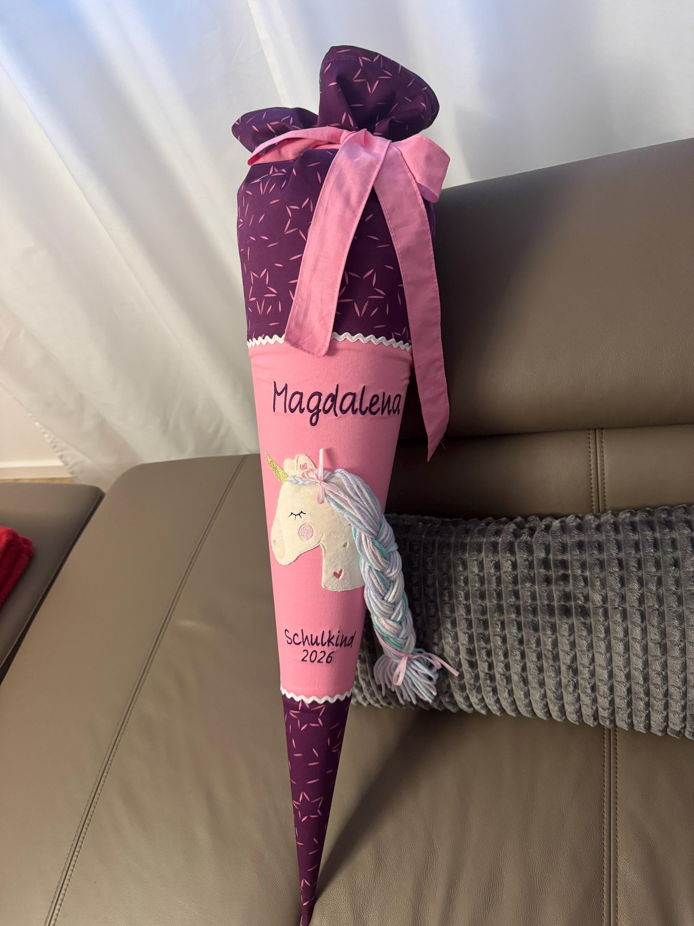 Schultüte mit Einhorn und Namen farblich auf den Pretty Unicorn Nuala Schulranzen abgestimmt.
