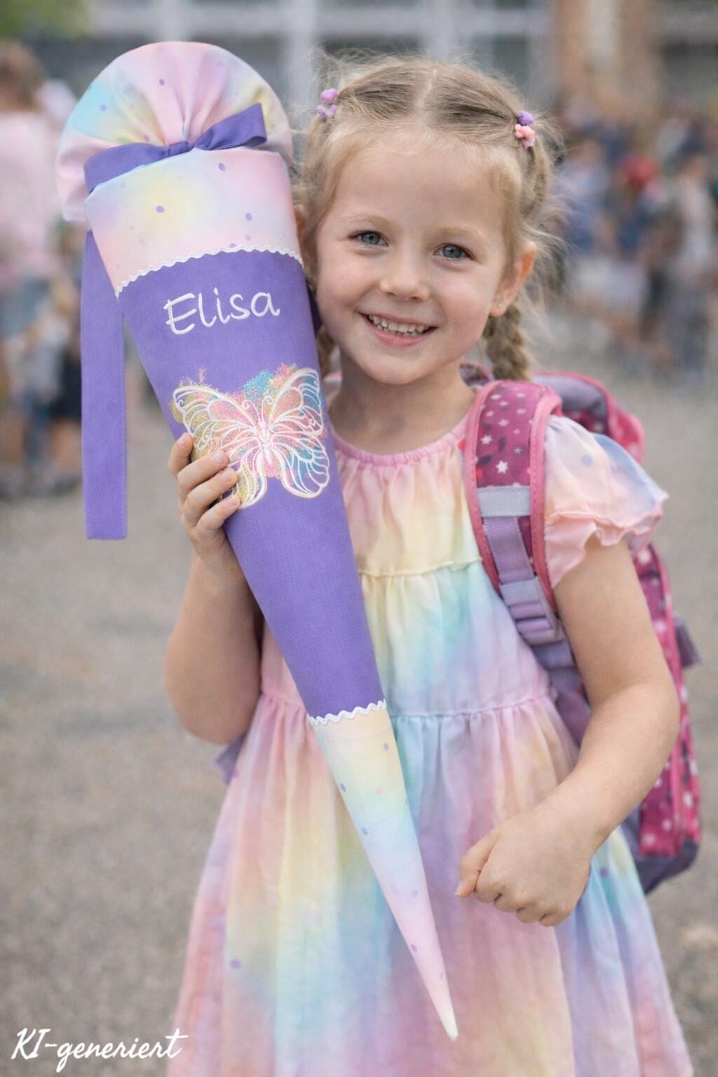 Schultüte mit Schmetterling und Namen farblich auf den Step by step Butterfly Luna abgestimmt.