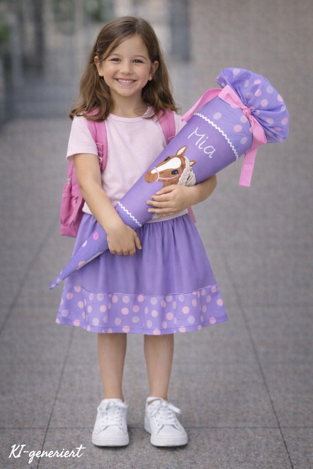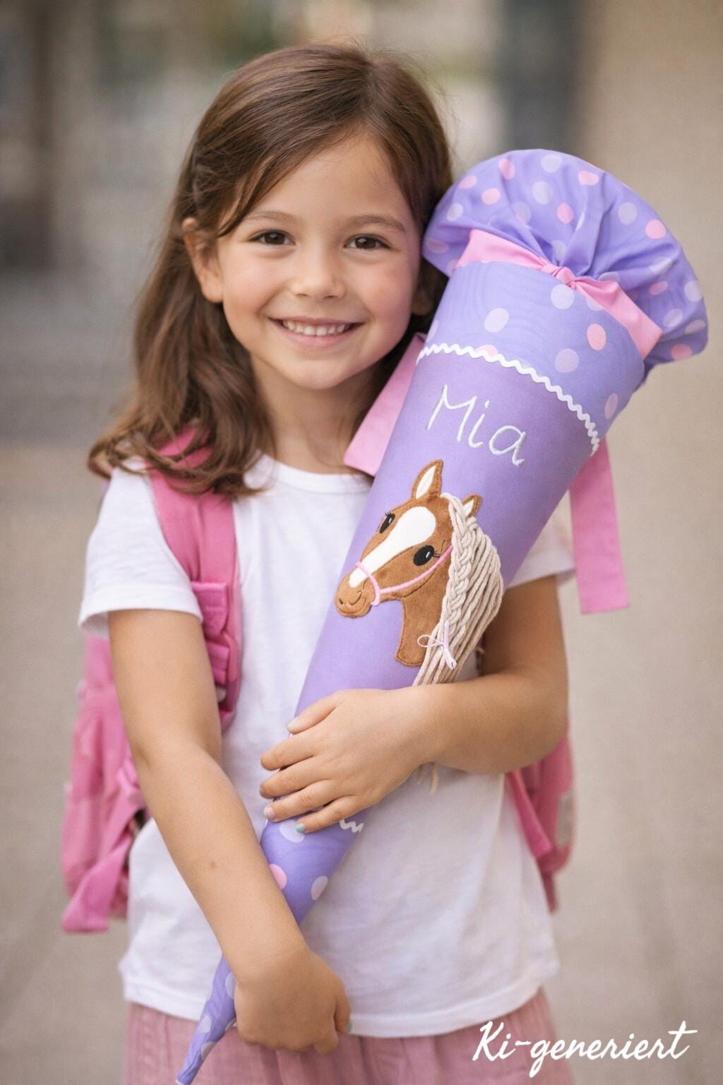 70 cm Schultüte oder 85 cm Schultüte mit Pferd und Namen farblich auf den Ponybäradies Schulranzen abgestimmt.