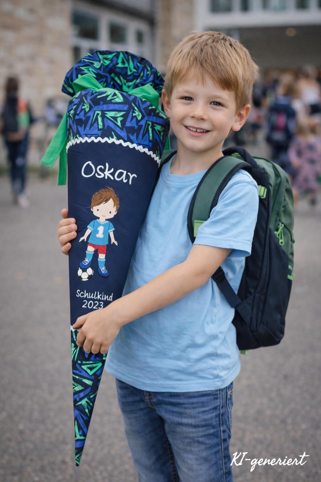 Schultüte mit Fussballer und Namen farblich auf den step by step Soccer Ben Schulranzen abgestimmt.