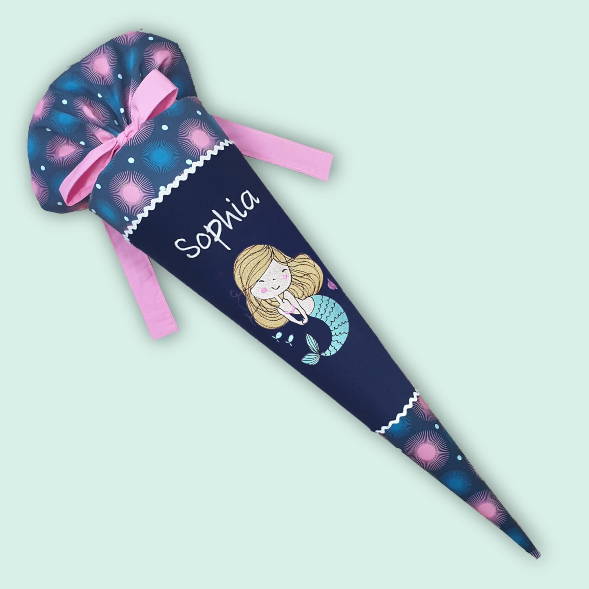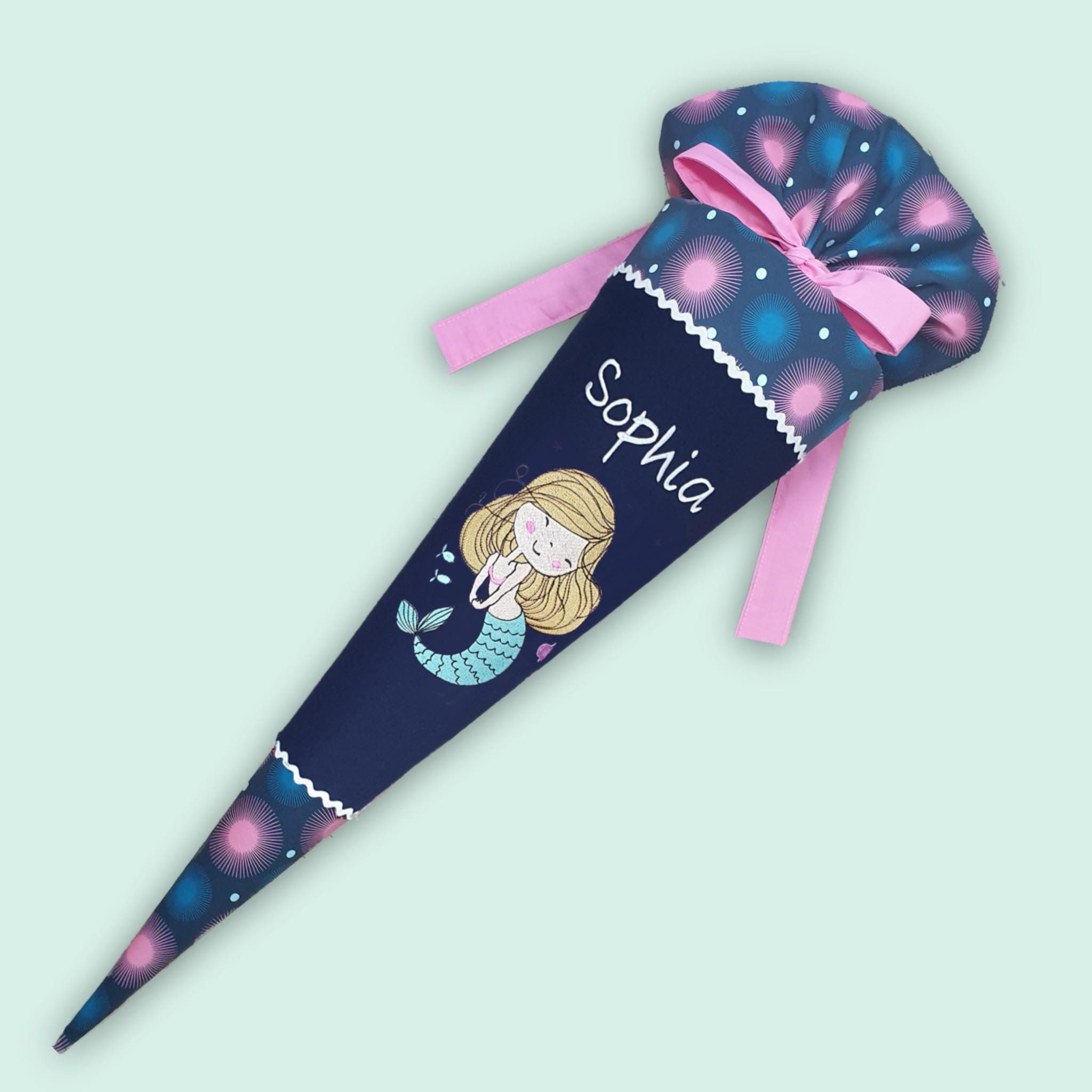 Schultüte mit Meerjungfrau und Namen farblich auf den Step by step Mermaid Delia Schulranzen abgestimmt.
