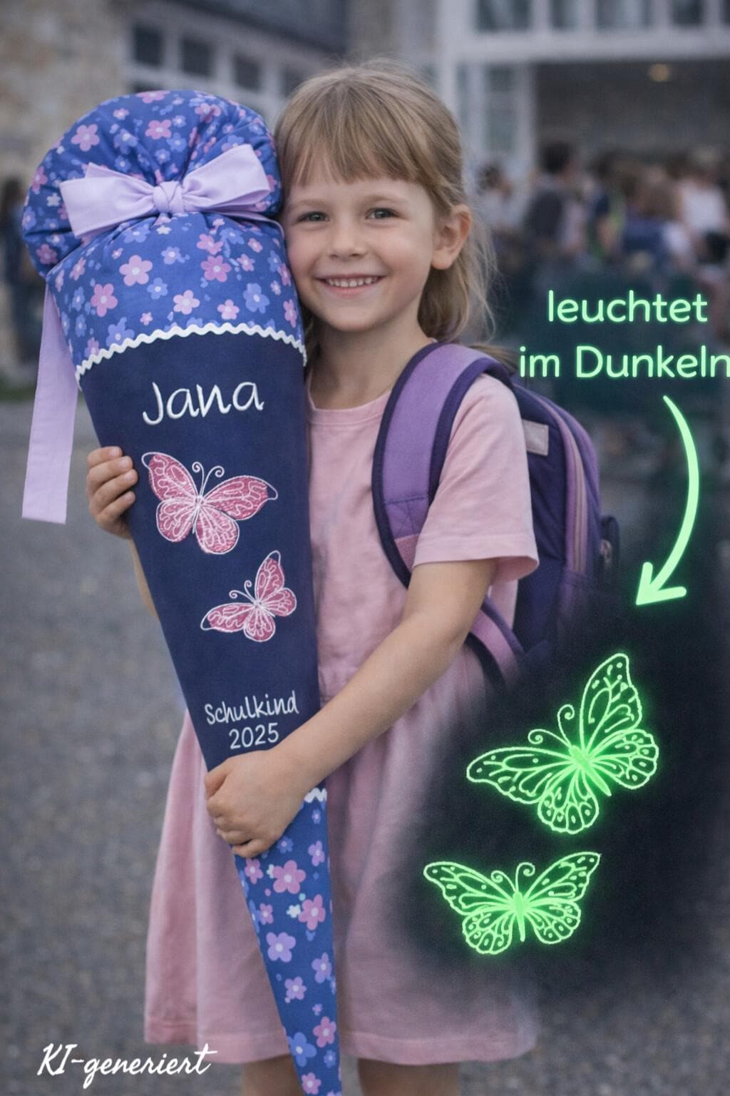 Schultüte mit Schmetterlinge (leuchten im Dunkeln) und Namen farblich auf den Step by step Butterfly Maja Schulranzen abgestimmt.
