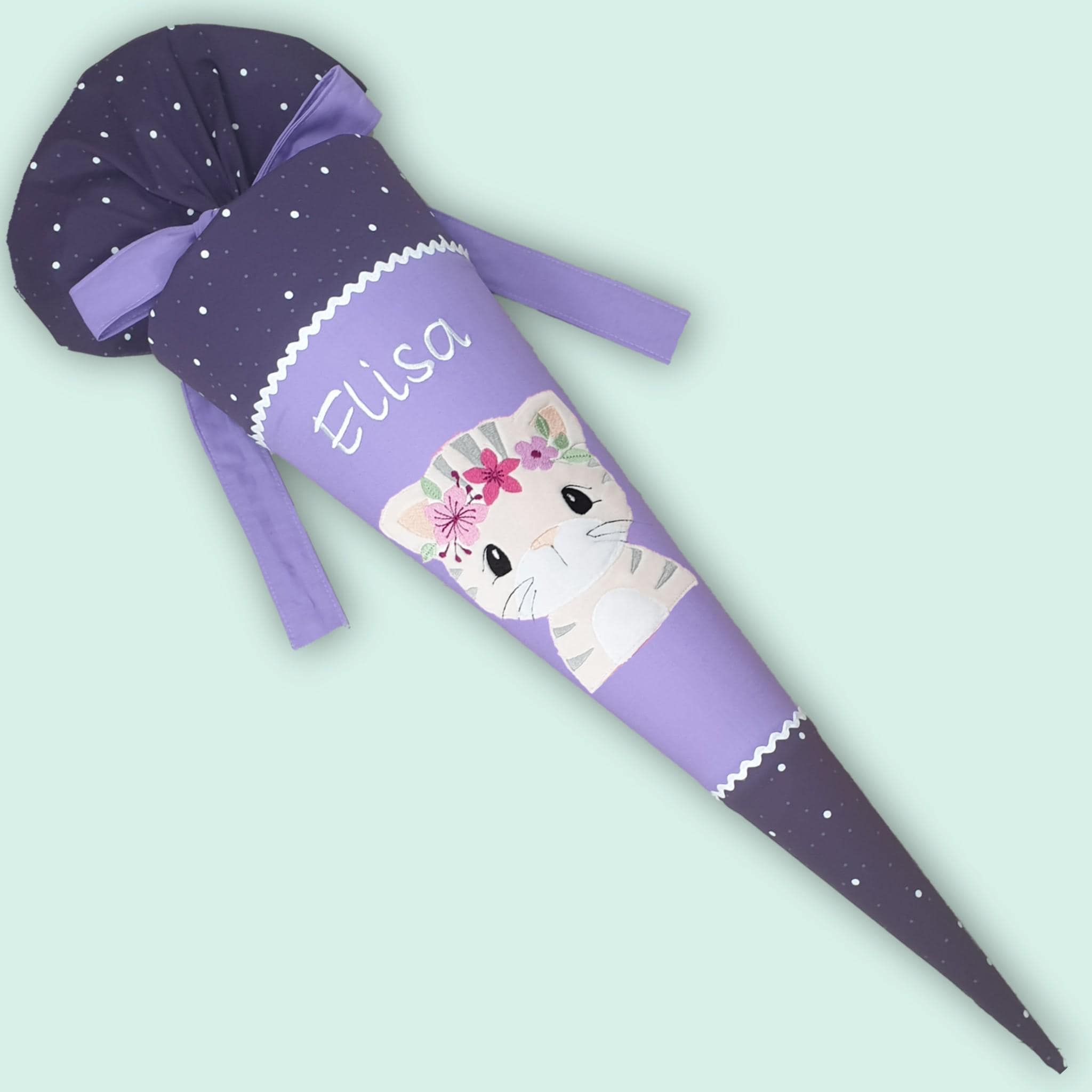 Die Schultüte ist mit Zackenlitze aus Baumwolle verziert und wird mit einem genähten Baumwollband sicher verschlossen.