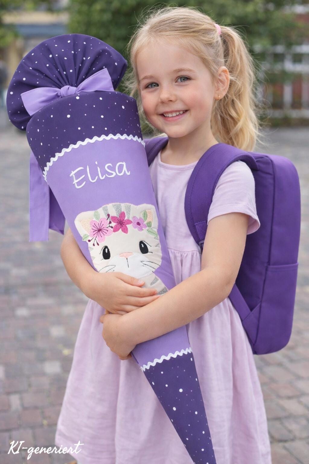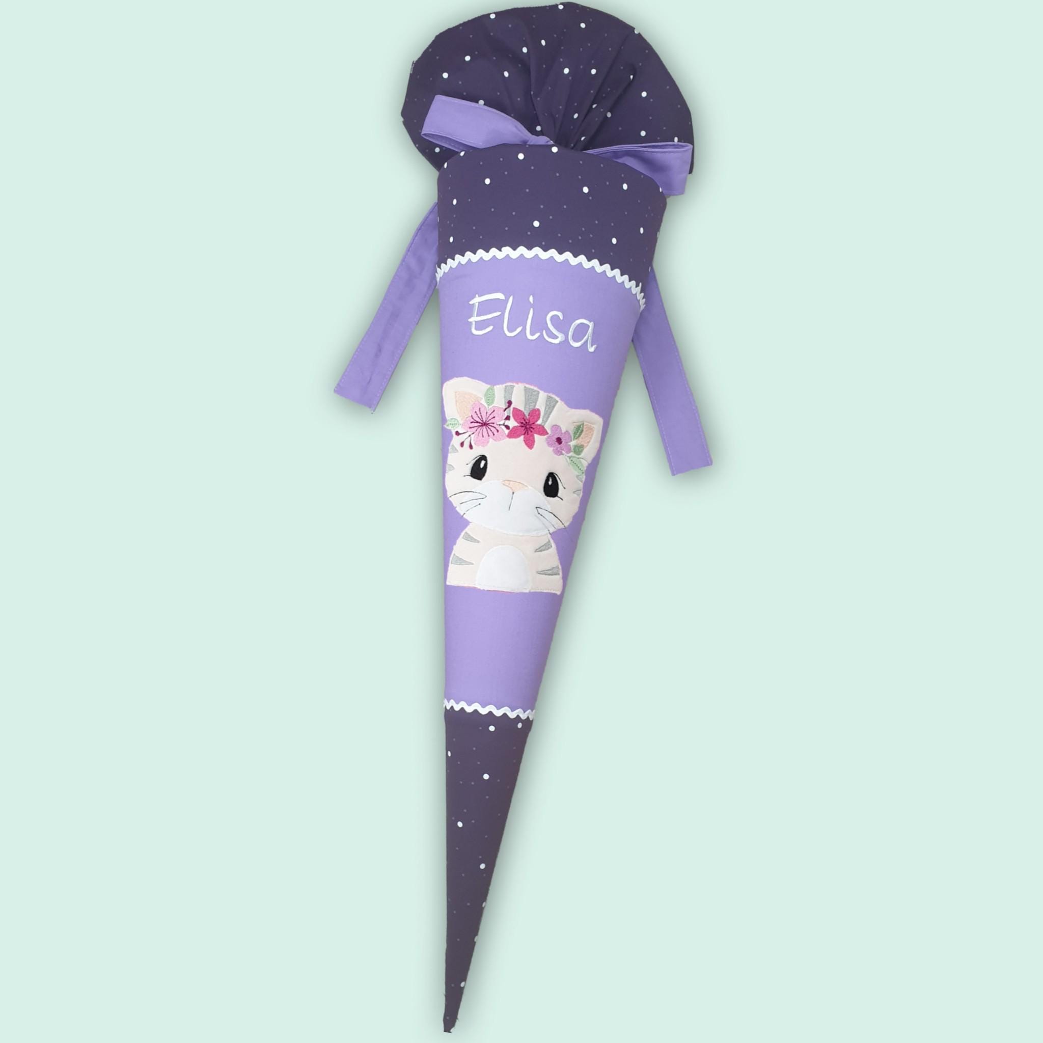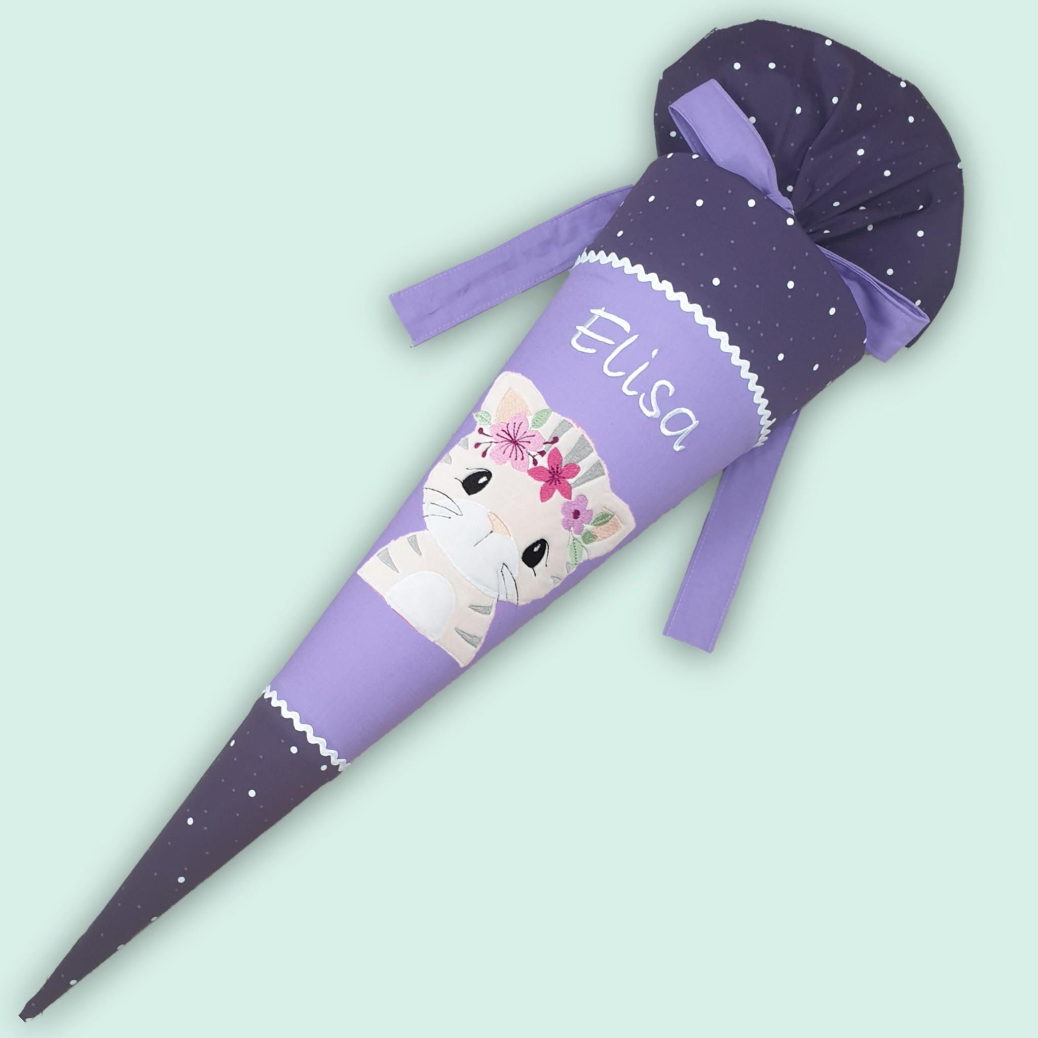 Schultüte mit Katze und Namen farblich auf den Sternguckbär Schulranzen abgestimmt.
