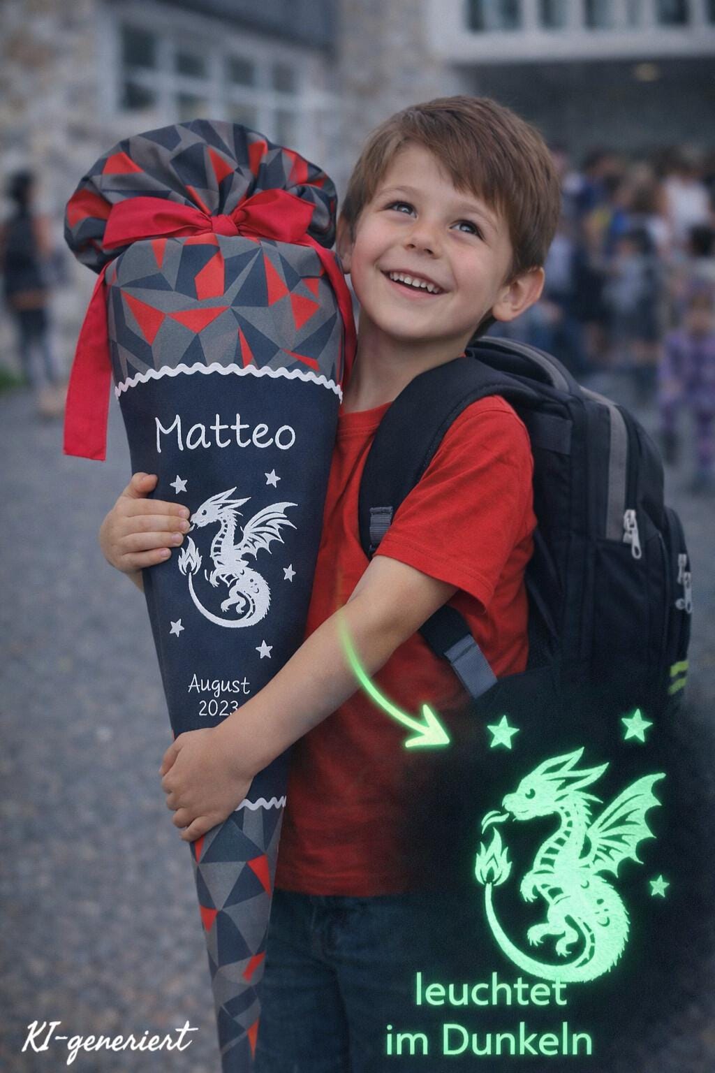 Schultüte mit Drache (Leuchtet im Dunklen) und Namen farblich auf den Ergobag TaekBärdo Schulranzen abgestimmt.