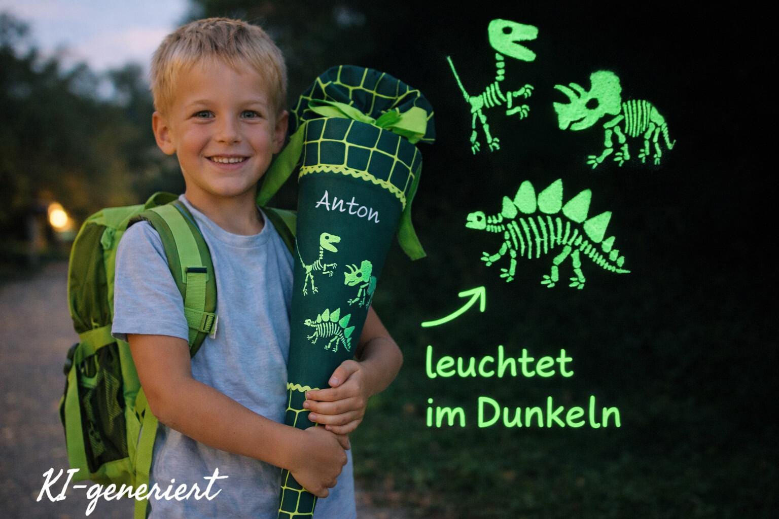 Schultüte mit Dinoskelette und Namen farblich auf den Bärex Schulranzen abgestimmt.